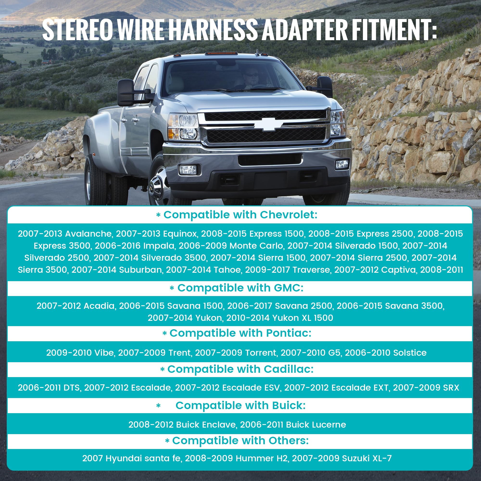 Stereo wiring adapter for Compatible with Chevrolet: 2007-2013 Avalanche, 2007-2013 Equinox, 2008-2015 Express 1500, 2008-2015 Express 2500, 2008-2015 Express 3500, 2006-2016 Impala, 2006-2009 Monte Carlo, 2007-2014 Silverado 1500/2500/3500, 2007-2014 Sierra 1500/2500/3500, 2007-2014 Suburban, 2007-2014 Tahoe, 2009-2017 Traverse, 2007-2012 Captiva, 2008-2011 Malibu LS