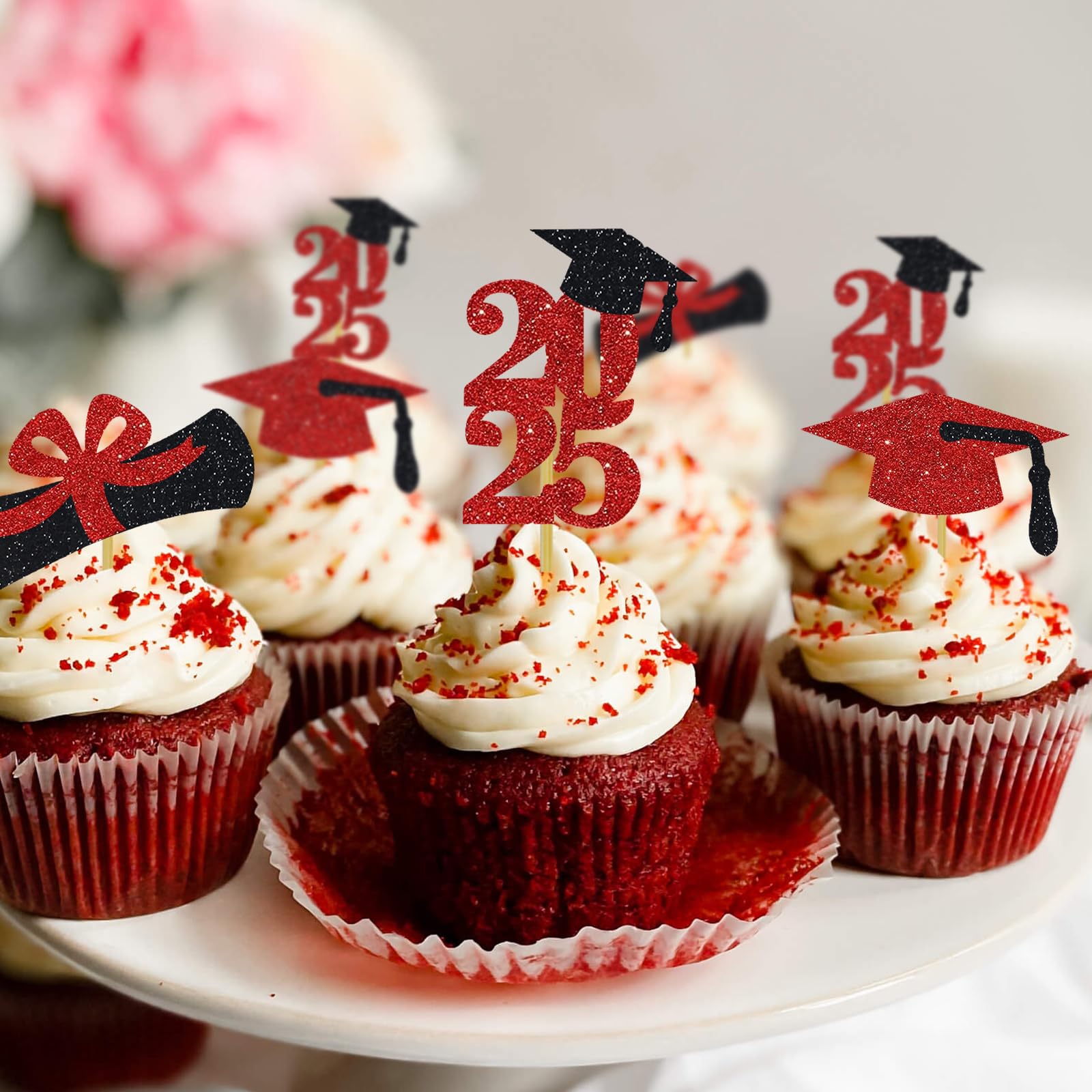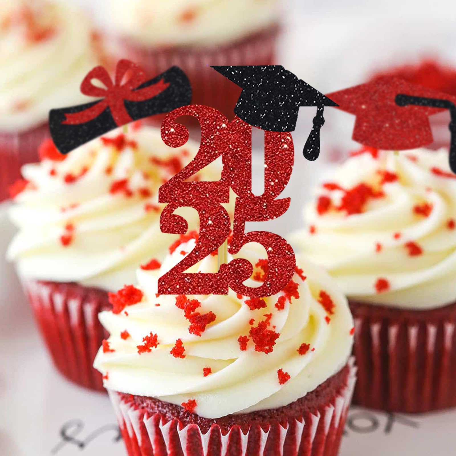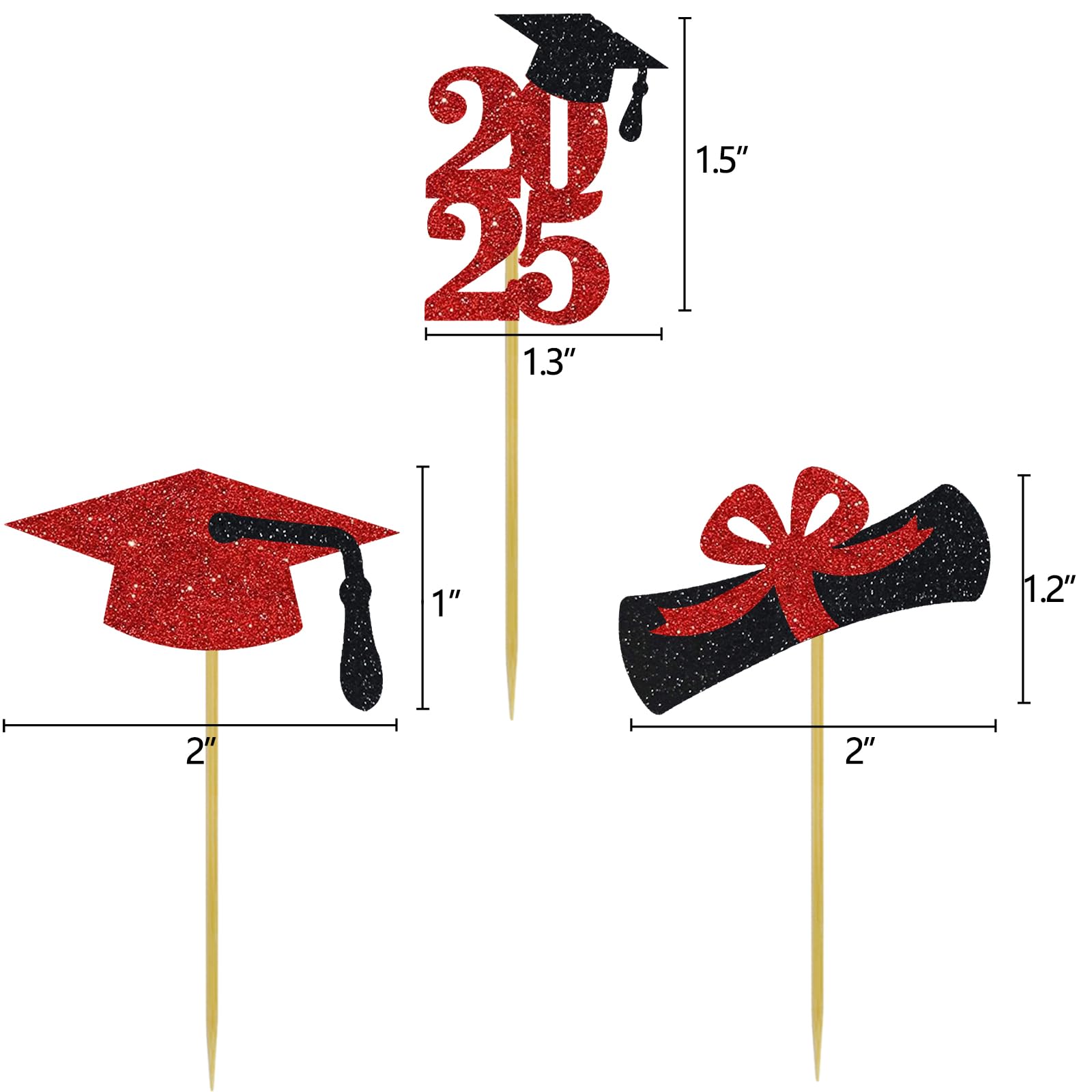 2025 graduation cap cupcake toppers: 8 pcs red grad cap cupcake toppers with black tassel, 8 pcs red 2025 number cupcake toppers, 8 pcs red and black diploma bow cupcake toppers