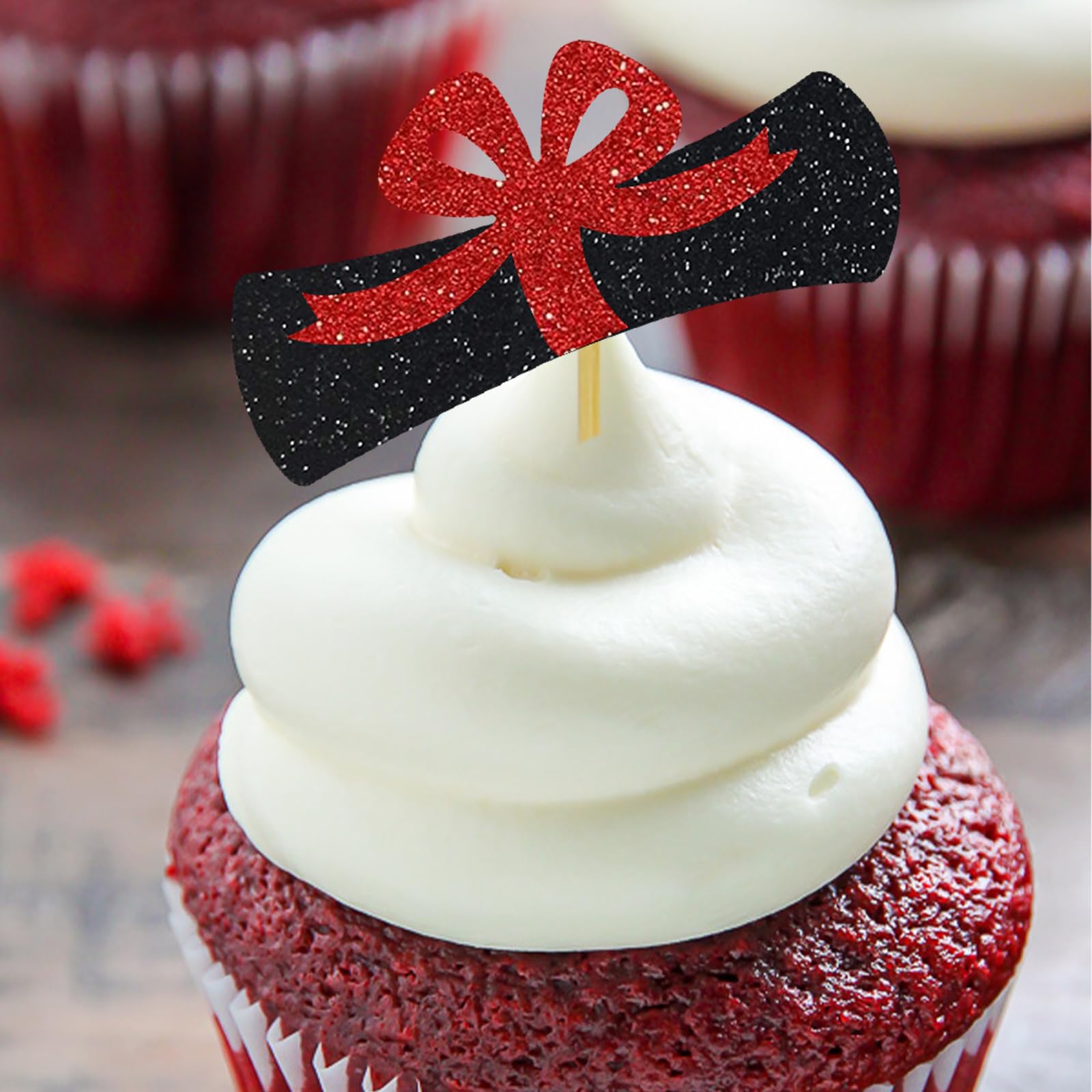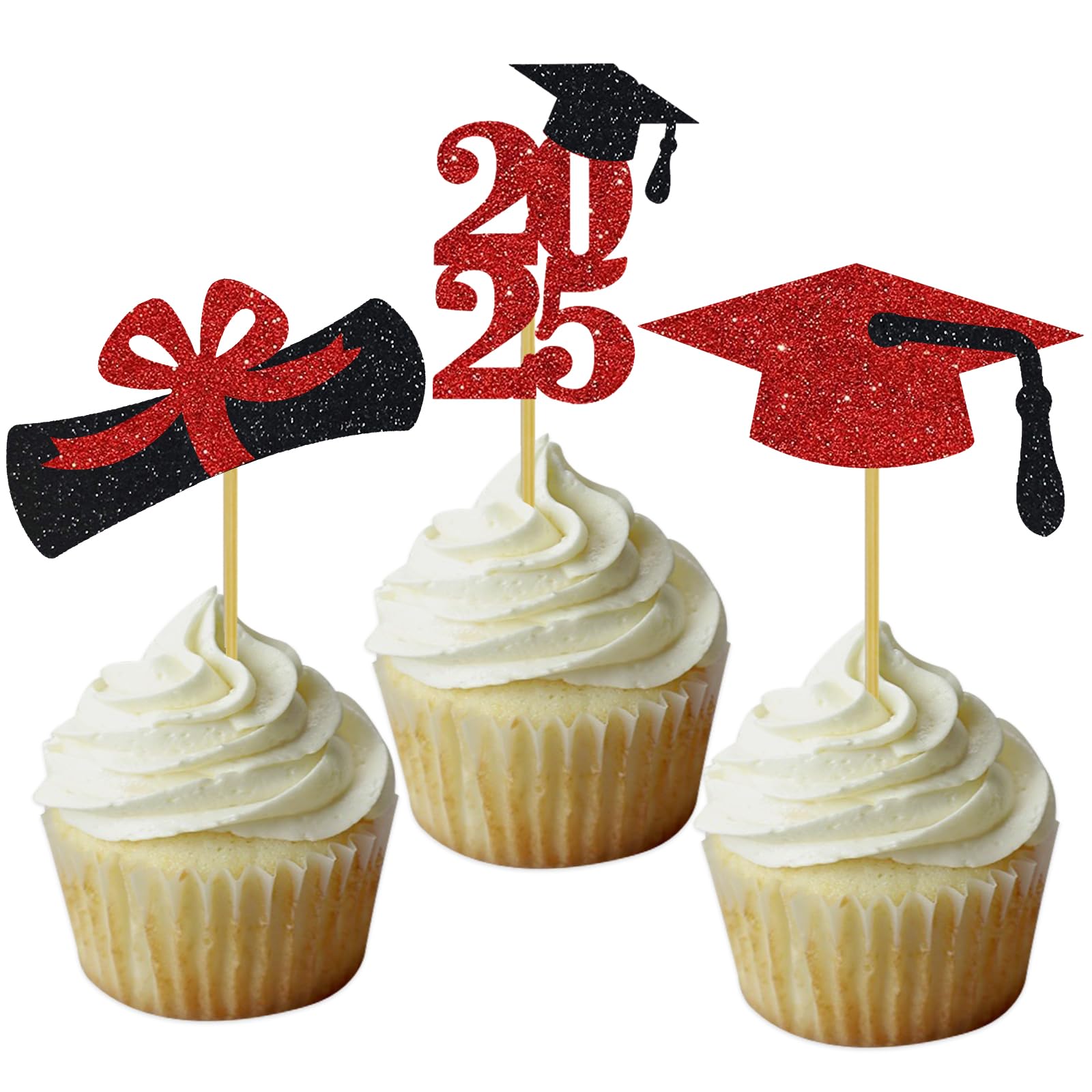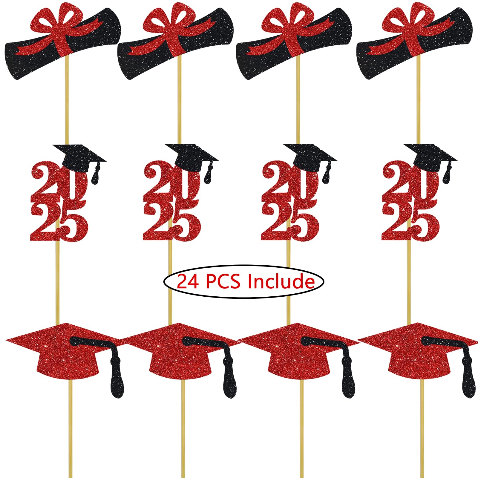 2025 graduation cap cupcake toppers: 8 pcs red grad cap cupcake toppers with black tassel, 8 pcs red 2025 number cupcake toppers, 8 pcs red and black diploma bow cupcake toppers