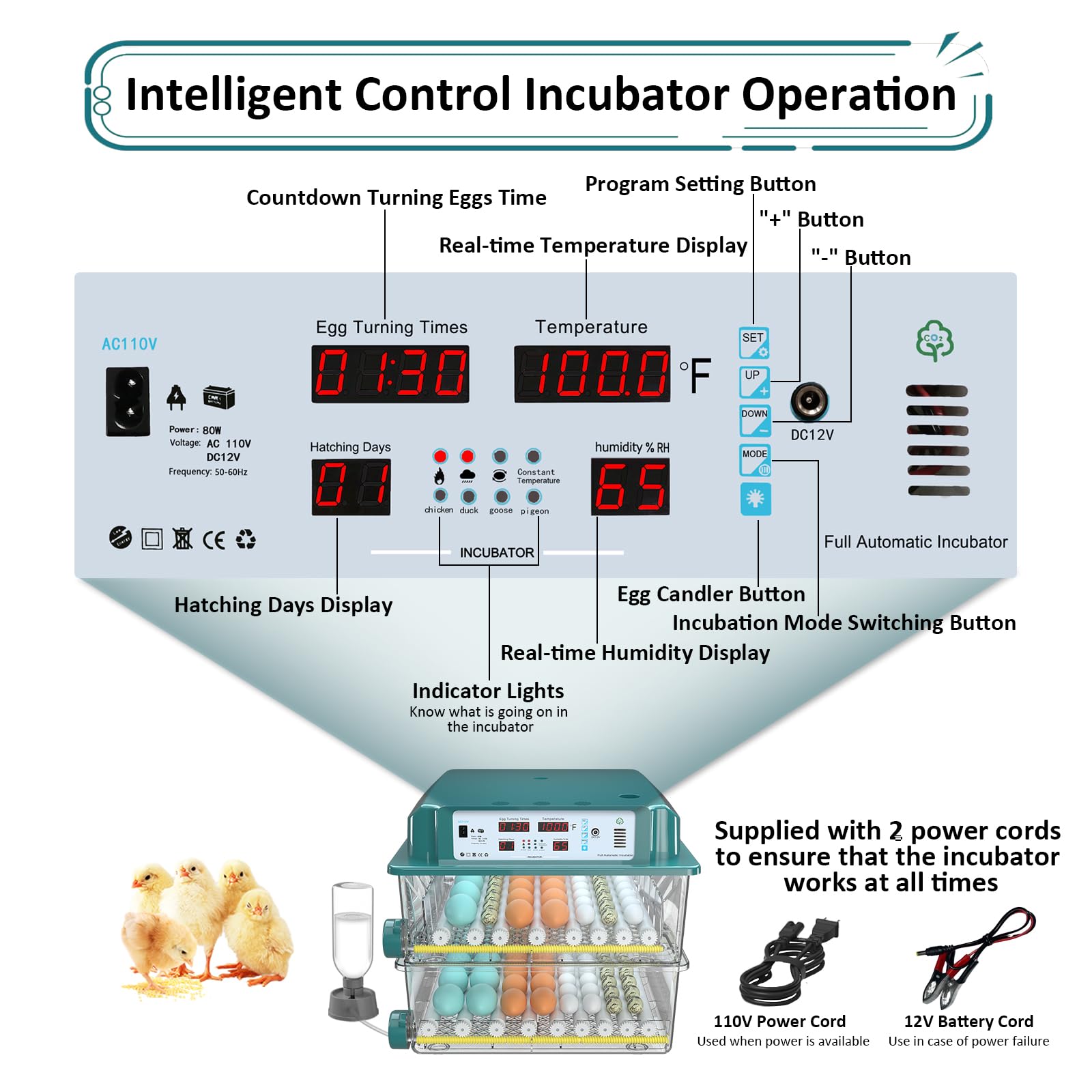 [OPERATION VISUALIZATION]: The duck egg incubator is easy to operate and all operations can be visualized through the control panel. The control panel not only shows what is going on in the incubator, but also records the number of days of incubation