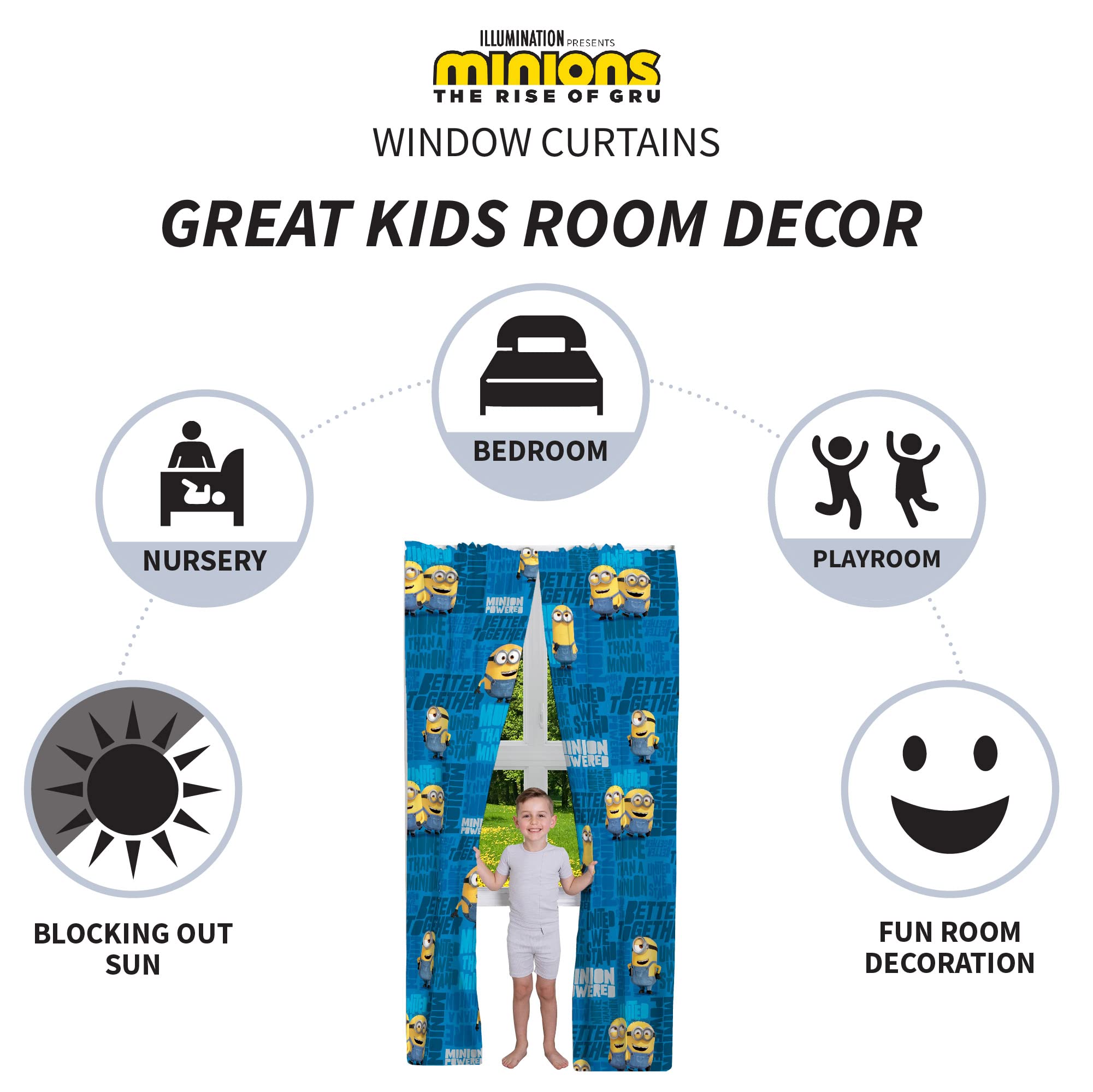 MINIONS THE RISE OF GRU DESIGN: Bring the fun and feisty energy of the Minions into your childβs world with these cute and colorful drapes. Featuring assorted Minions from the Universal animated feature, these drapes pop with a fun "Too Many Minions" pattern.