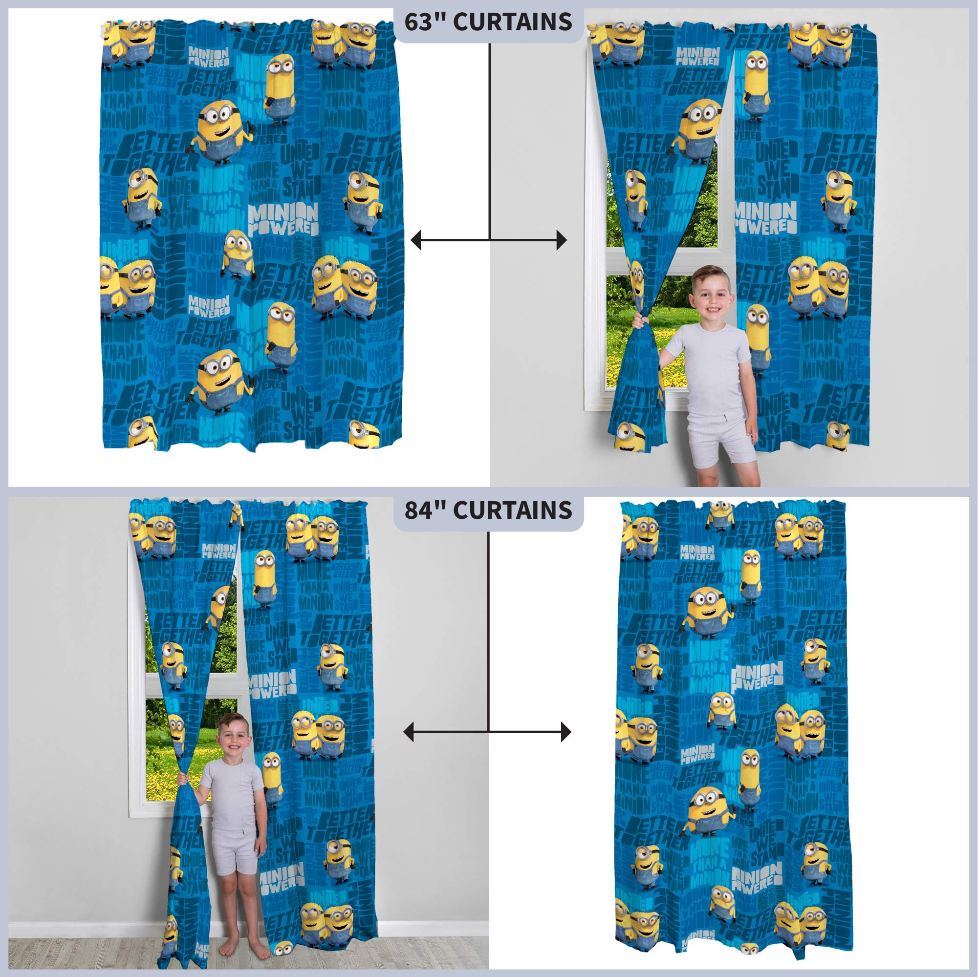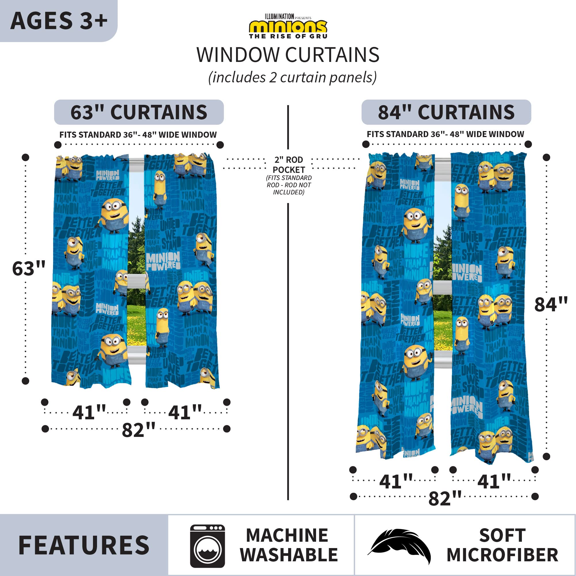 Bring the big-screen excitement of the Universal animated feature Minions to a window near you. Create a fun focal point in a childβs bedroom, nursery or playroom with help from the beloved quirky characters on these high-quality drapes. These adorable microfiber window curtains have the playful look and soft feel that kids love. The assorted yellow Minions pop against a bold blue background filled with inspirational Minions-themed expressions. Use these drapes to create a cohesive look in a Minions-themed room while also adding some privacy from the outside world. The drapery panels donβt block out sunlight completely, but rather filter it gently for a soft and comfortable look. The little banana-eating stars of the Universal Minions movie continue to win the hearts of fans of all ages. Now kids can join in on the fun at home with colorful, high quality drapes that reflect the friendly charm and inspiring messages of the Universal animated feature. Set is available in 63 inch length drapes or 84 inch length drapes.