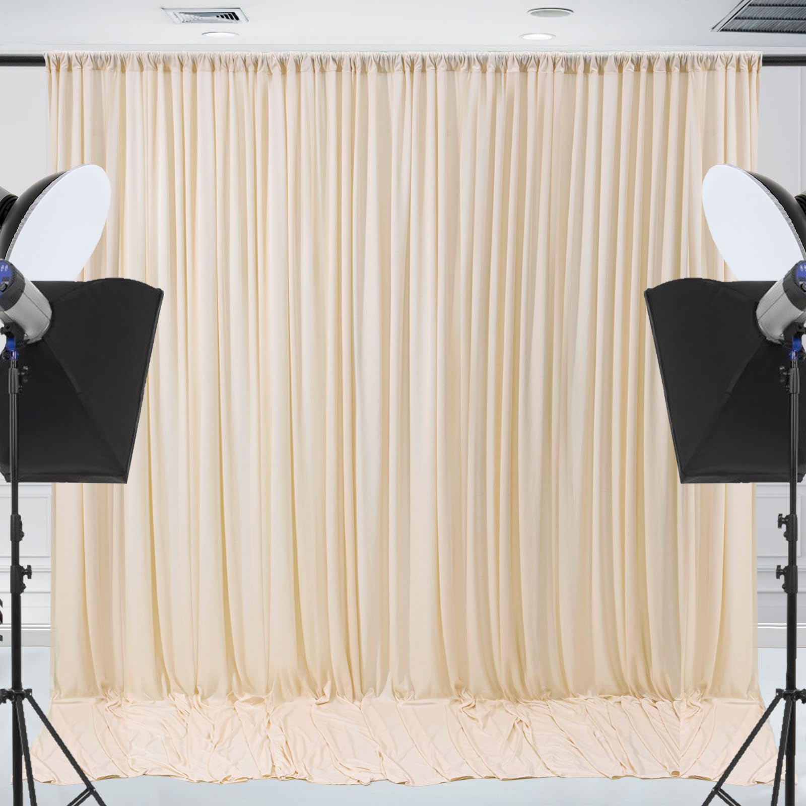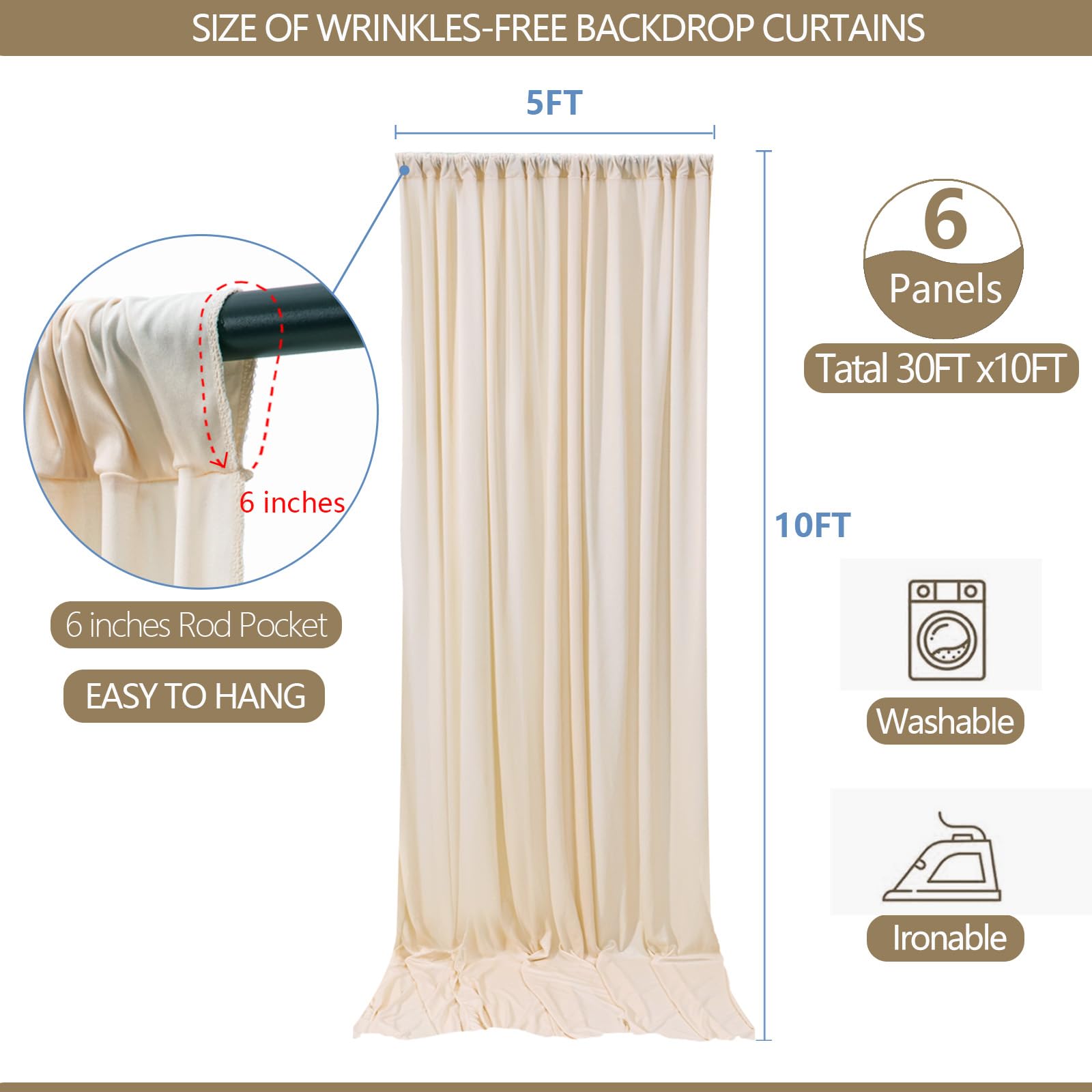 6 Panels Backdrop Curtains Package —— Your package includes 6 panels of soft champagne backdrop curtains, each measuring 5FT in width and 10FT in height. Together, they create a perfect 30FT x 10FT backdrop, providing ample room for various occasions. Please note: Not including the background stand