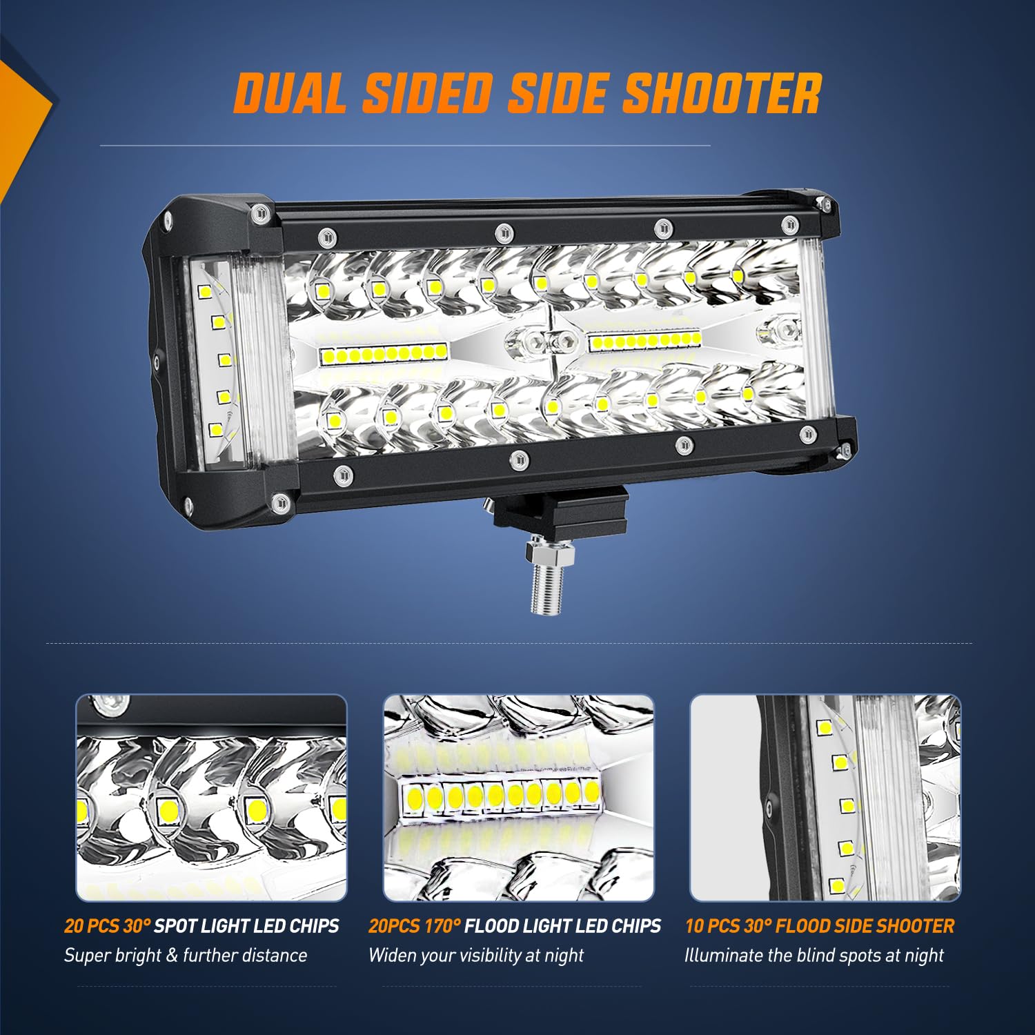 Upgrade Side Shooter Design: Designed with side lights at two ends, triple rows of dual sided lights and nested reflector cup design combined beam, 170° flood beam and 30° spot beam, shoots out a 200° wider and further light coverage to clear darkness and potential hazard, increasing your driving safety. Works great as fog lights, side lights, driving lights, etc