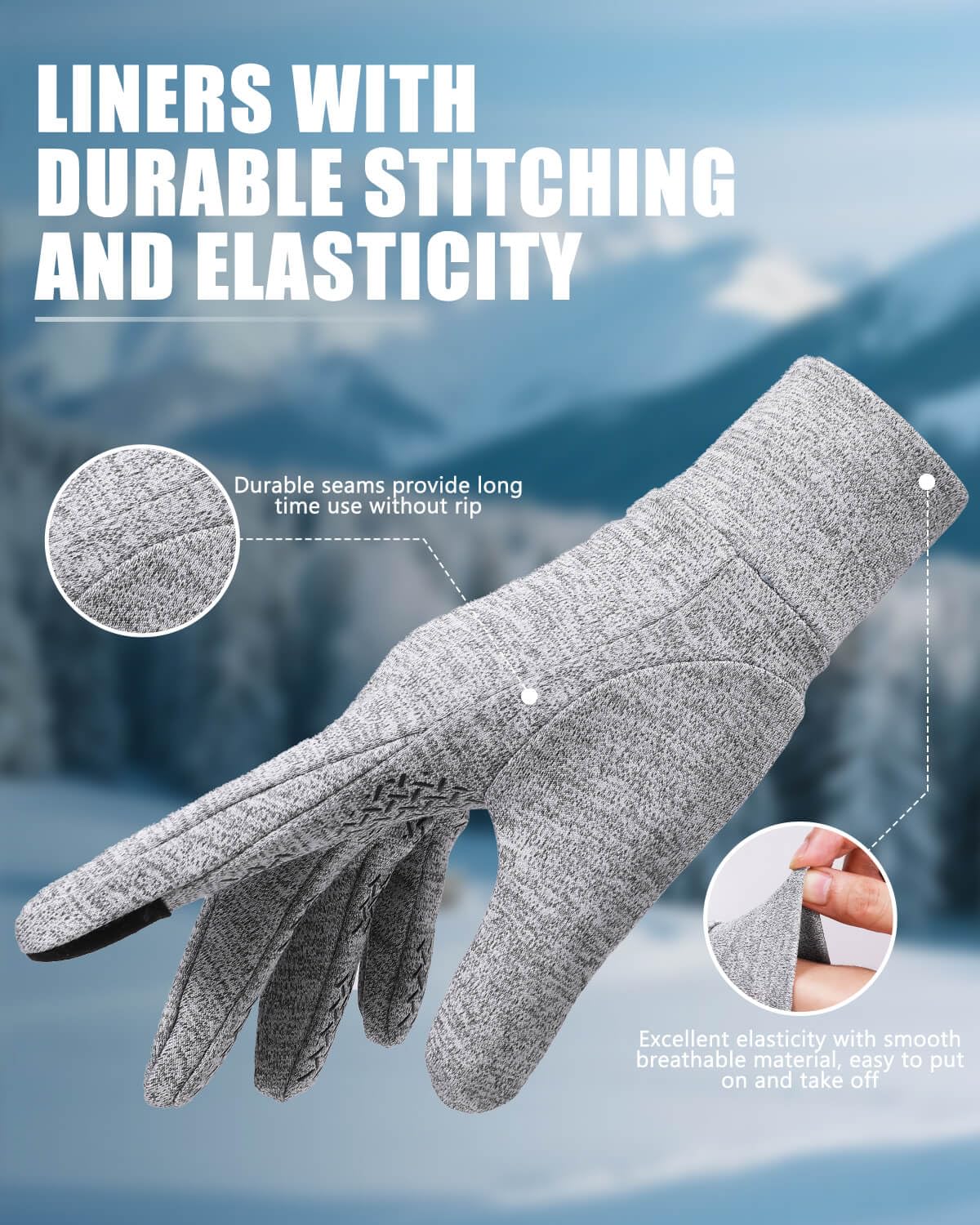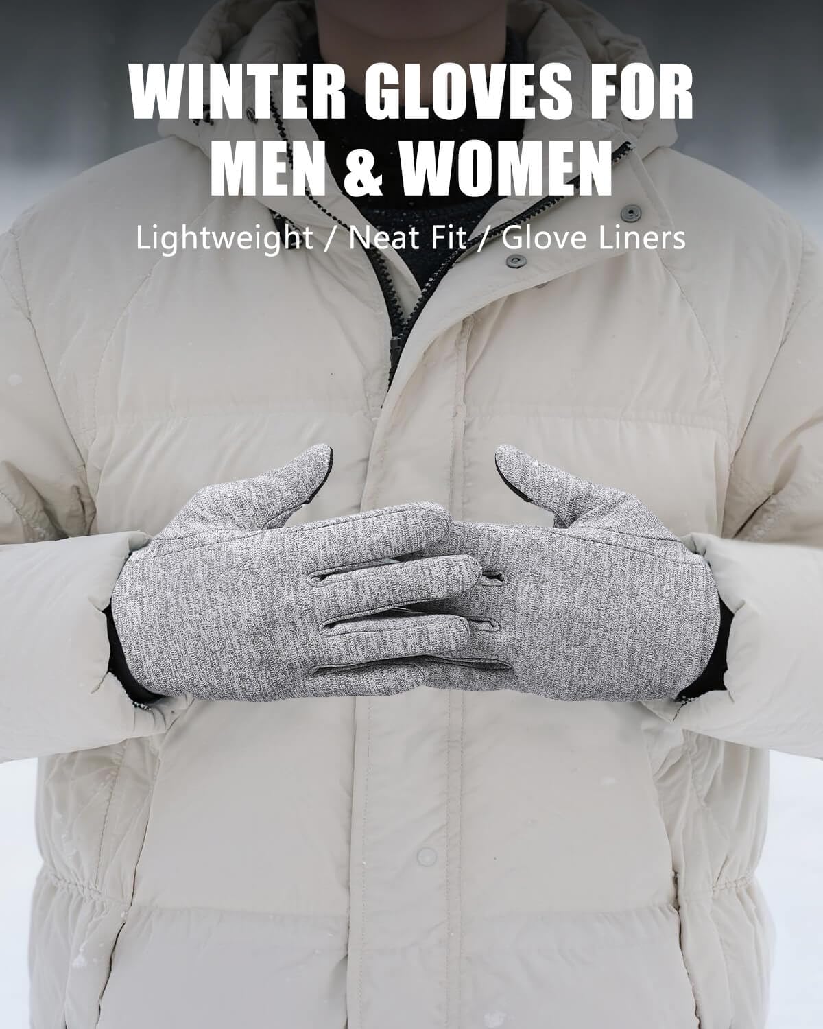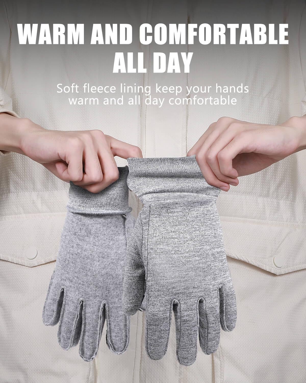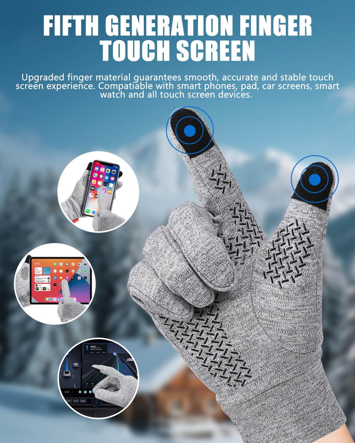 šćSensitive Touch Screen Fingertipć We've tested multiple conductive fabrics over and over again to achieve a more sensitive touchscreen experience. Our warm gloves for cold weather can keep your hands warm but still allow you to operate your phone. Don't miss important calls, deal with urgent work in time, and take pictures of beautiful scenery. Upgraded touchscreen material on the thumb and index fingers has better sensitivity and stability for any digital devices.