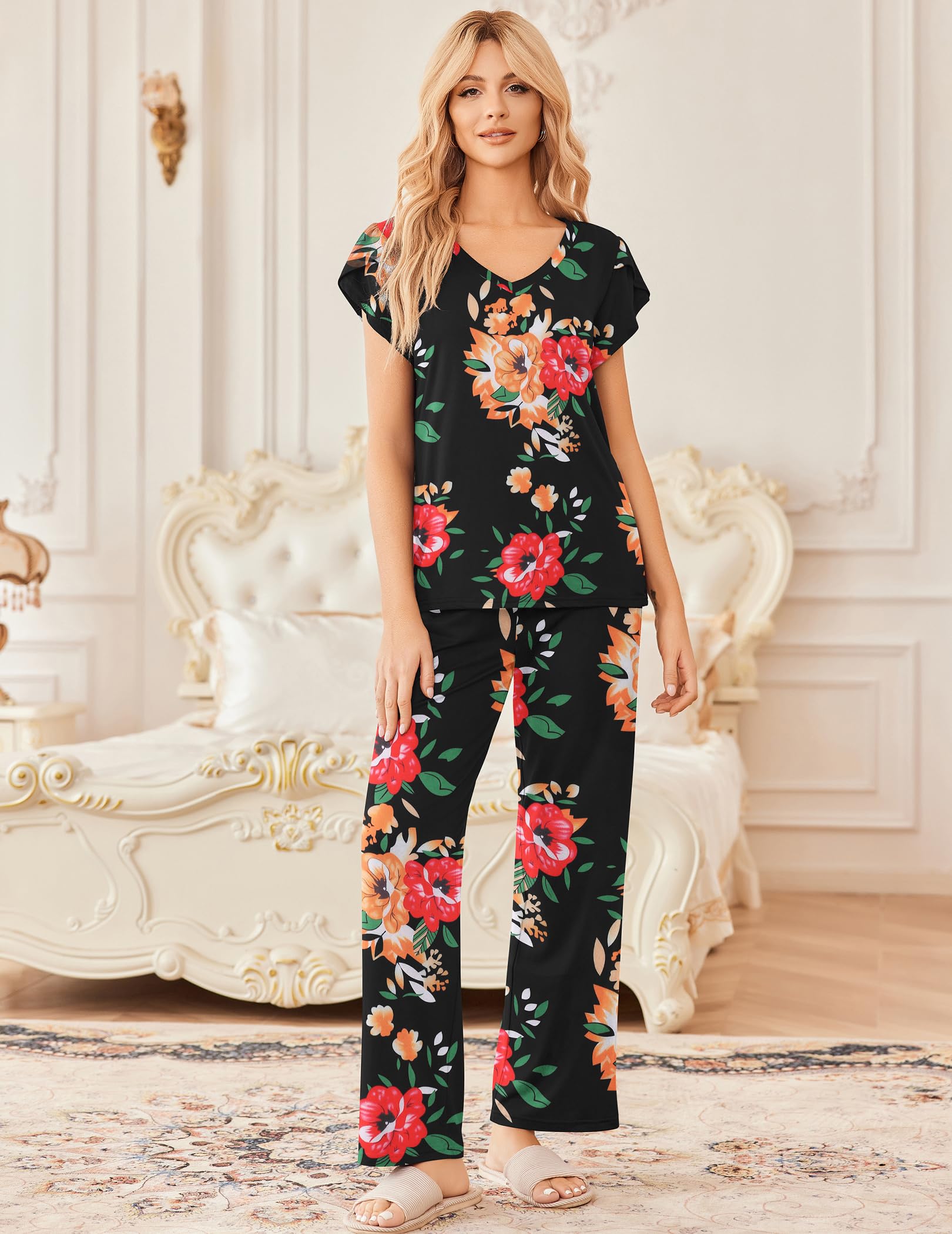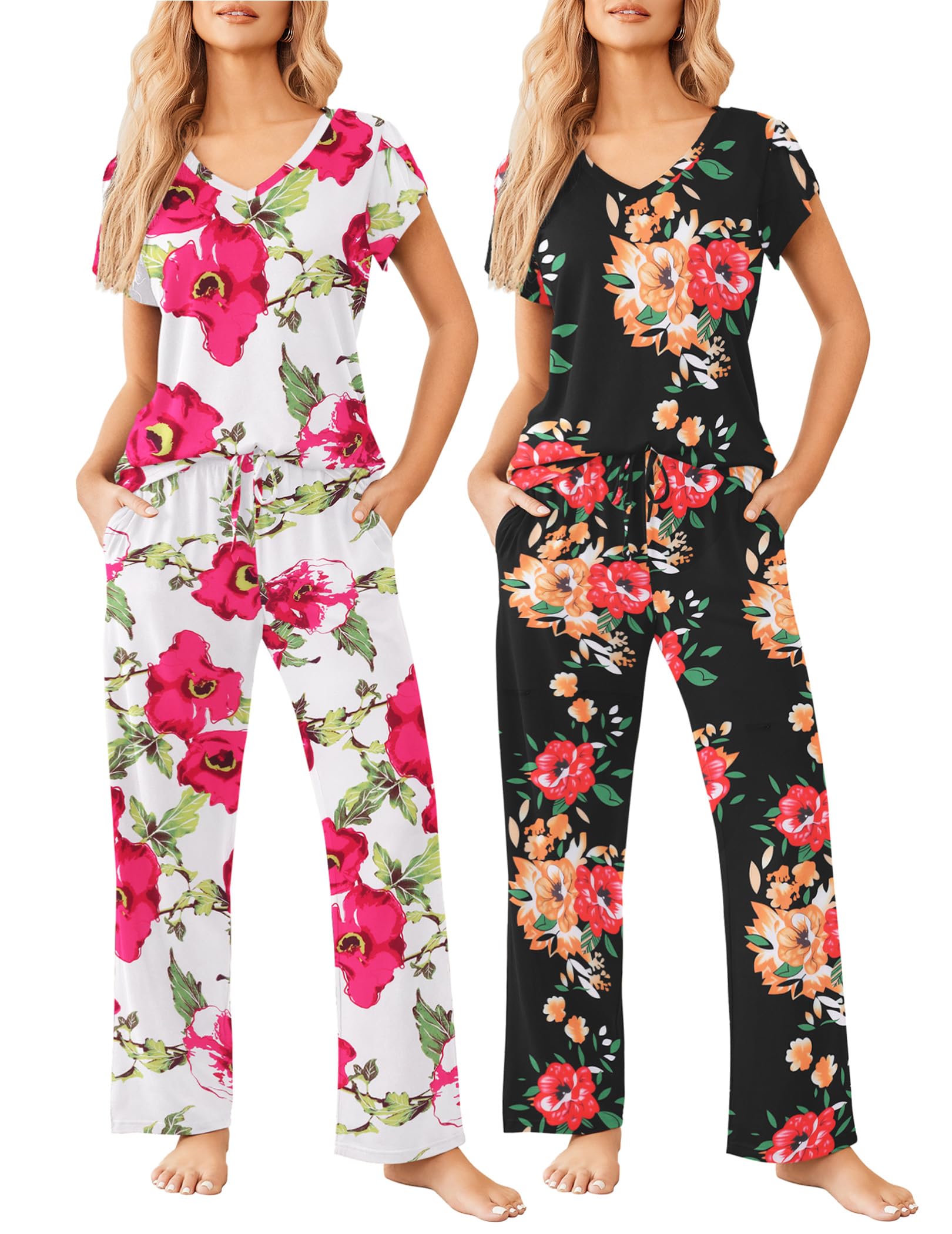 【Features】Ekouaer 2 Packs Pajama Sets features short sleeve,v neck pajamas tops with fashion petal sleeve,and elastic waistband,adjustable waist drawstring,2 side pockets pjs pants.Cute print,loose casual lounge sets,it is a must-have pajamas for your wardrobe.