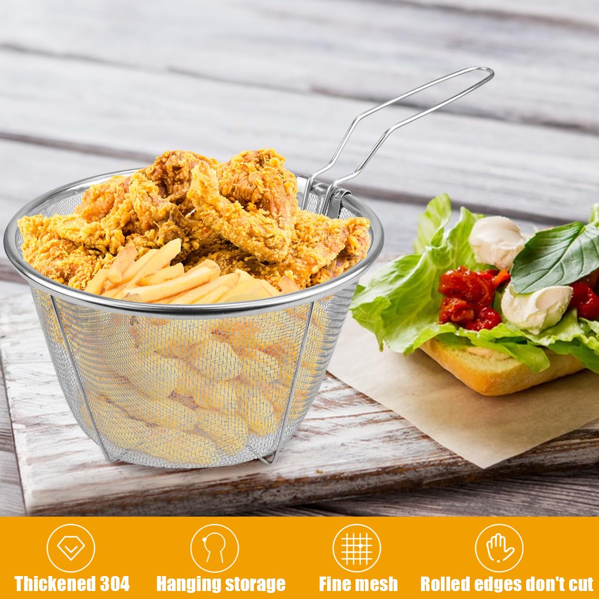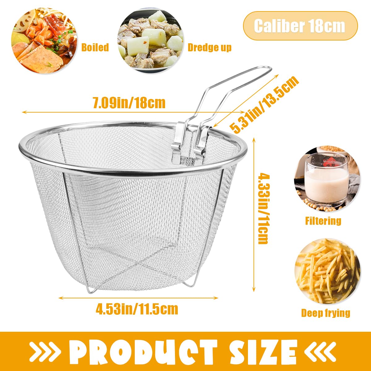 EVEN&EFFICIENT: Our frying basket has a fine mesh that promotes even heat distribution and prevents food from escaping, while ensuring quick and thorough liquid drainage. It has a large capacity of 6-7 inches for a variety of cooking needs, whether you are a professional chef or a home cook, this frying basket will help you make restaurant quality fried dishes in your own kitchen.