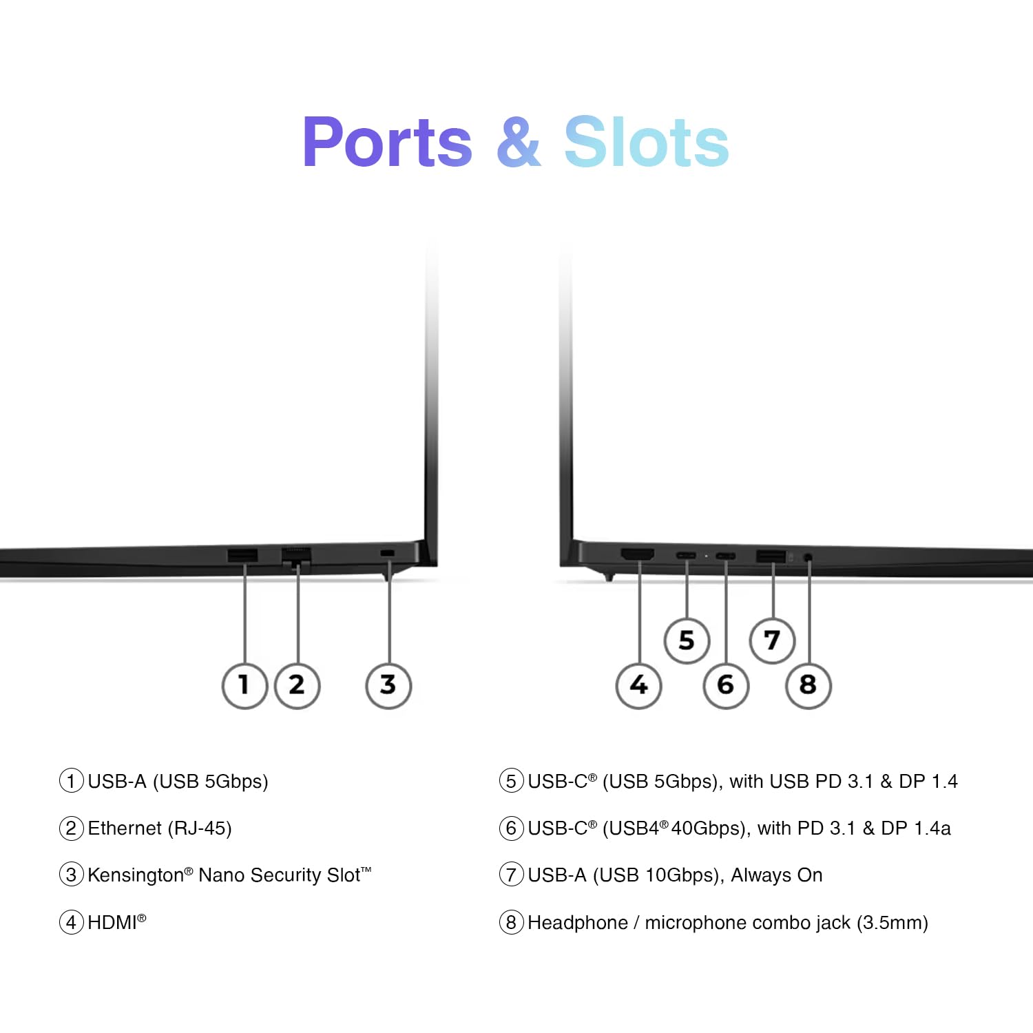 Fast Multitasking and Expanded Connectivity - 64GB DDR5 SODIMM RAM, 2TB 2242 PCIe NVMe SSD, 802.11ax Wi-Fi, Bluetooth 5.3, RJ-45, 5M RGB Webcam, Fingerprint Reader, Backlit Standard Keyboard, HDMI, Thunderbolt 4, USB 3.2 Type-C, Headphone/Microphone Combo Jack.