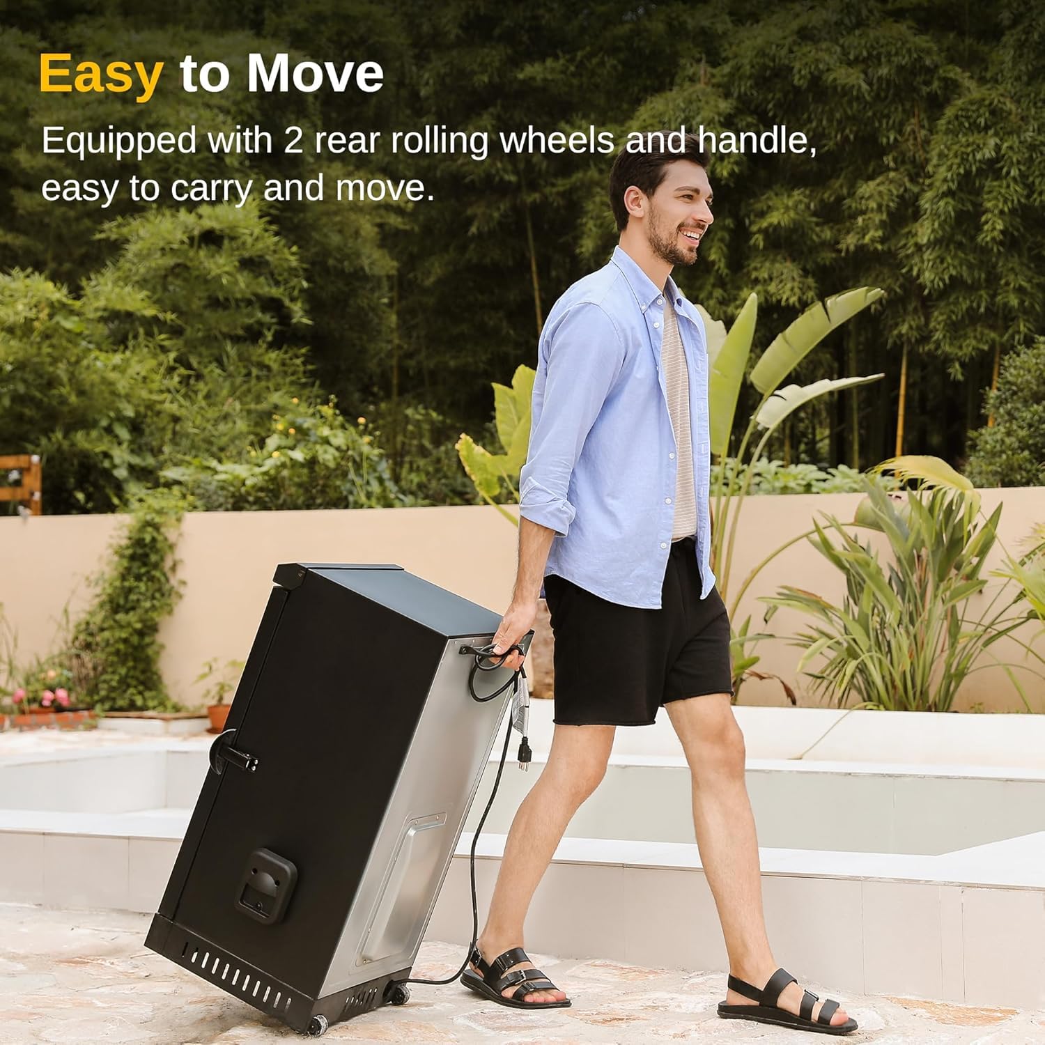 𝗘𝗮𝘀𝘆 𝘁𝗼 𝗠𝗼𝘃𝗲: With 2 rear wheels and a handle, you can effortlessly relocate the pellet smoker, enhancing your outdoor experience with friends and family. Perfect for Father's Day or Thanksgiving gifting