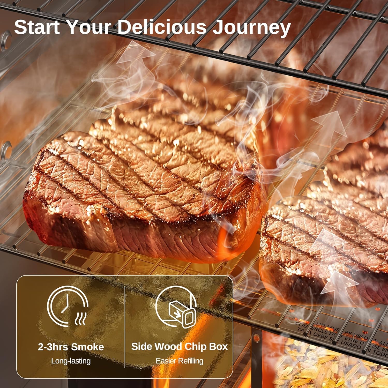 𝗕𝗲𝘁𝘁𝗲𝗿 𝗦𝗺𝗼𝗸𝗲𝗿 𝗙𝗹𝗮𝘃𝗼𝗿: The smoker features a side wood chip loader for continuous smoking for 2-3 hours without opening the door and adding chips, preserving the internal heat, and locking in the smoked flavors
