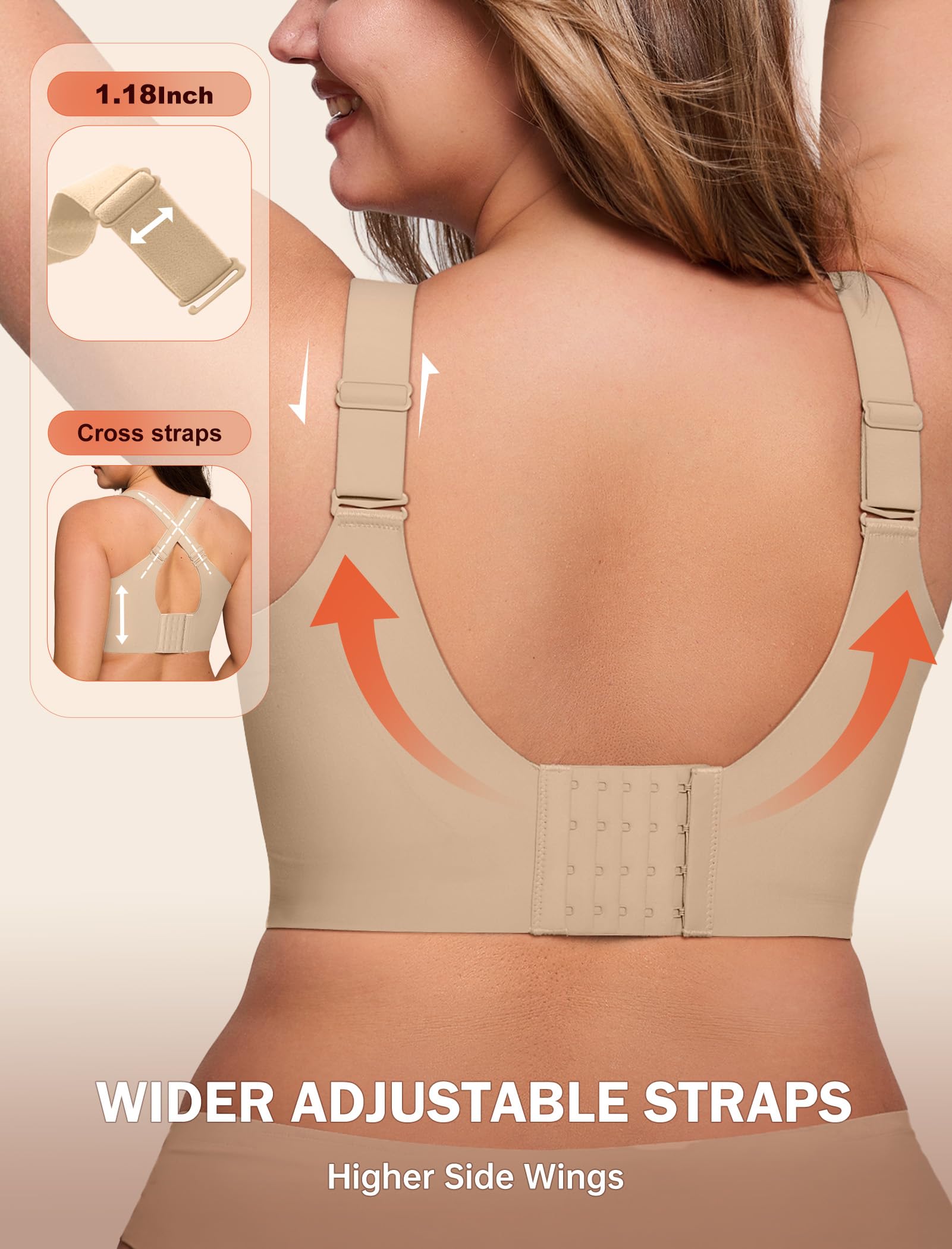 【Back Smoothing Bras & Wider Hooks】The back features precision glue-point technology for superior comfort, with a contoured wave-shaped inner layer that hugs your curves flawlessly. This sleek design not only enhances aesthetics but also smooths and conceals back bulges for a perfectly streamlined silhouette. The bras for women no underwire features 5 rows of 4 buckles and a free extender for a customizable fit.