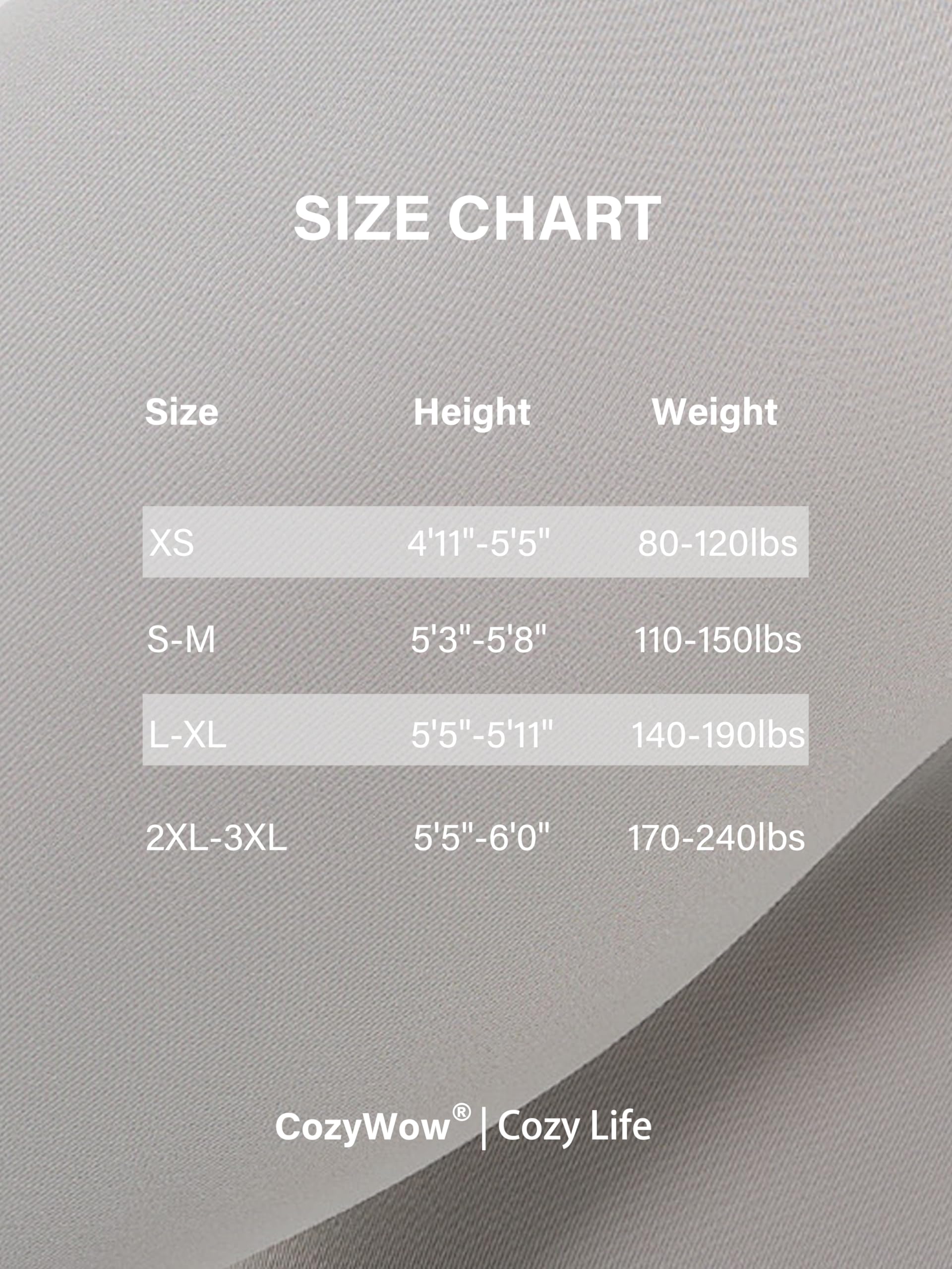 Size Recommended:XS: Height 4'11"-5'5" , Weight 80-120lbs. S-M: Height 5'3"-5'8", Weight 110-150lbs. L-XL: Height 5'5"-5'11", Weight 140-190lbs. 2XL-3XL: Height 5'5"-6', Weight 170-240lbs. Our stockings' design ensure elegance and comfort for every body type.