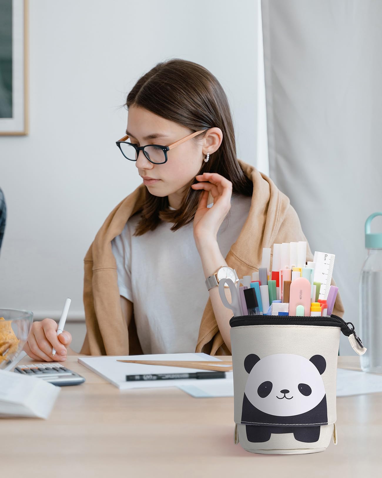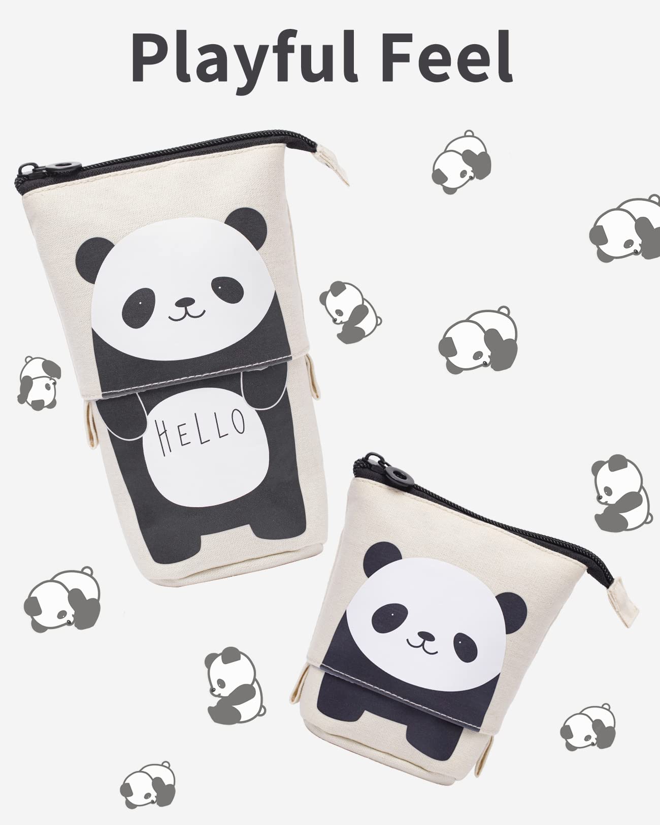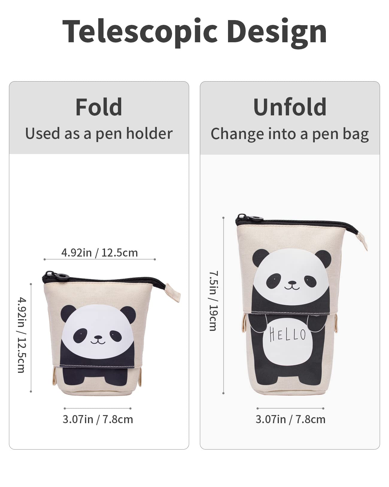 Sooez Standing Pencil Case, Cute Stand up Pencil Pouch, Telescopic Pen Pouch, Portable Pencil Holder, Kawaii Stand up Pencil Case, Spacious Pencil Pouch Bag for School Office Supplies, Beige Panda