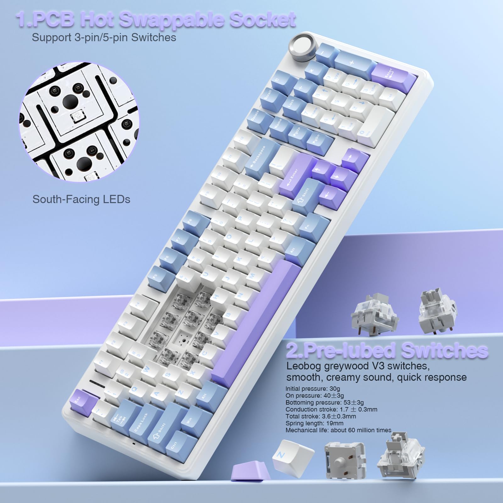 Hot-swappable Custom Keyboard: The switches and keycaps can be freely replaced(keycap/switch puller are included in the package).This customizable keyboard with hot-swap PCB allows users to replace 3 pins/5 pins switches easily without soldering issue. F99 Pro mechanical keyboards equipped with pre-lubed linear switches, bring smooth typing feeling and pleasant creamy mechanical sound, provide fast response for exciting game