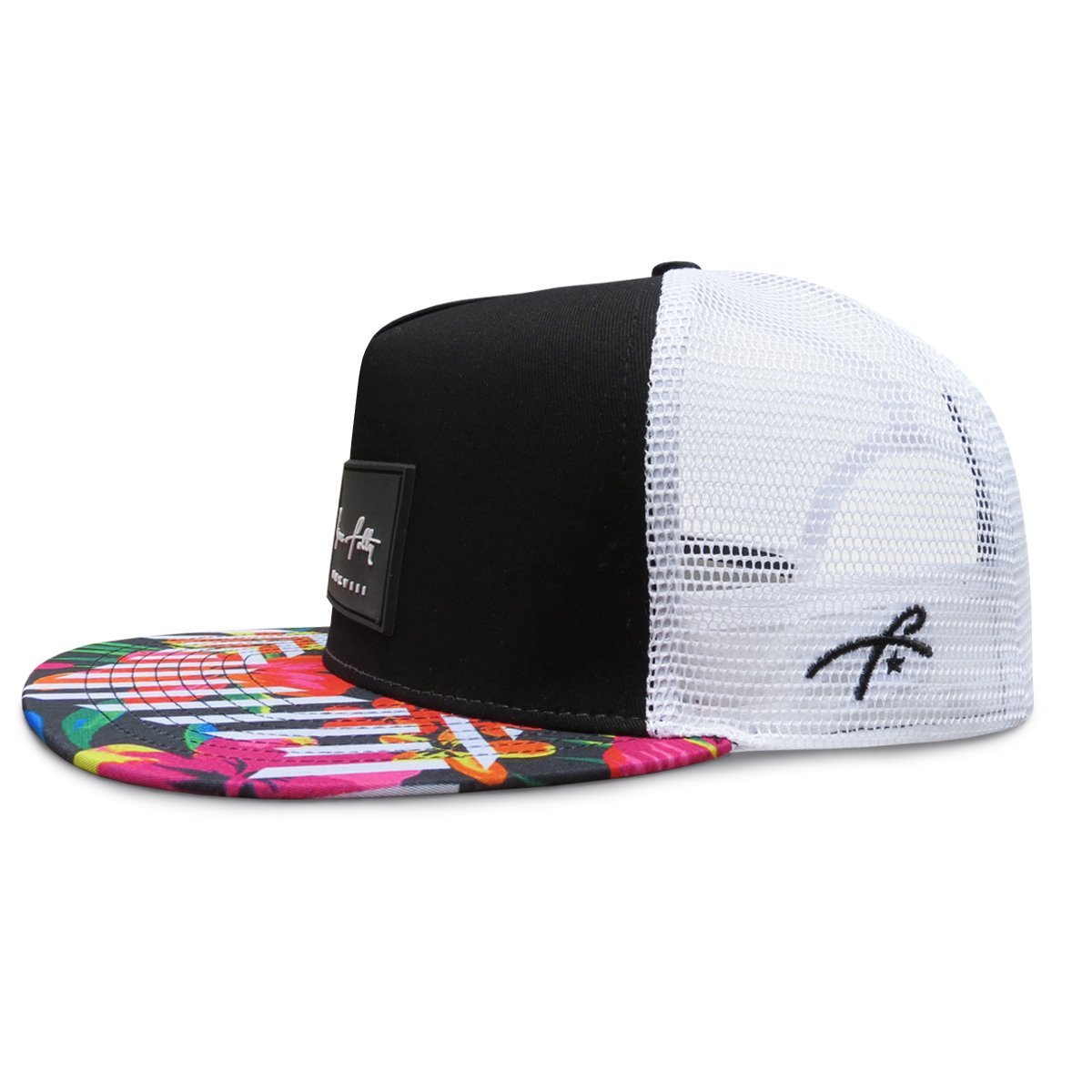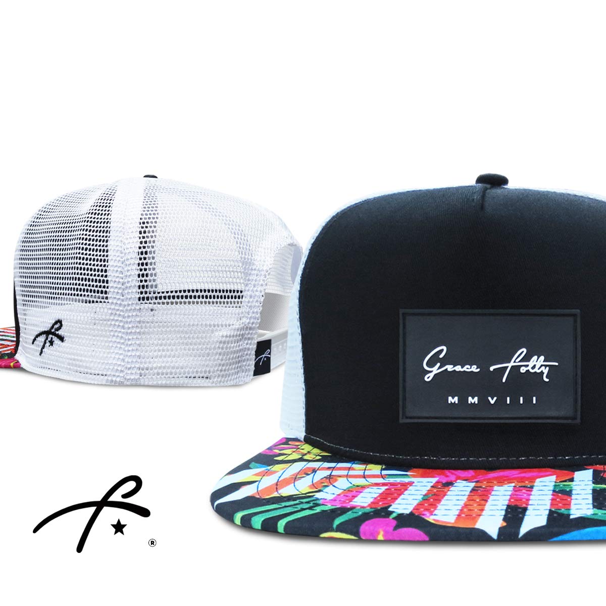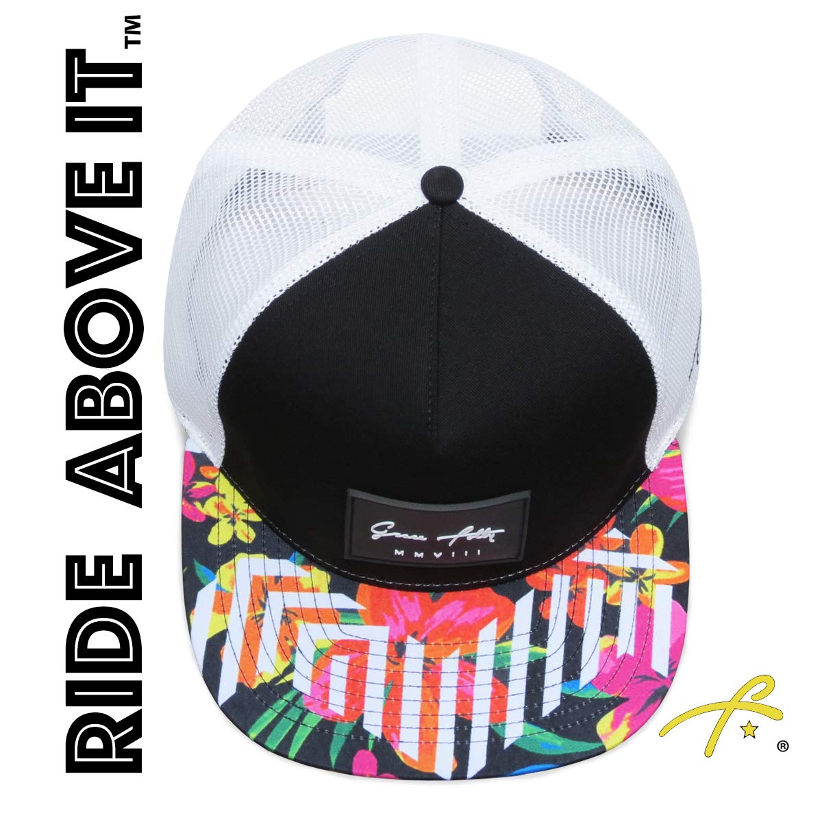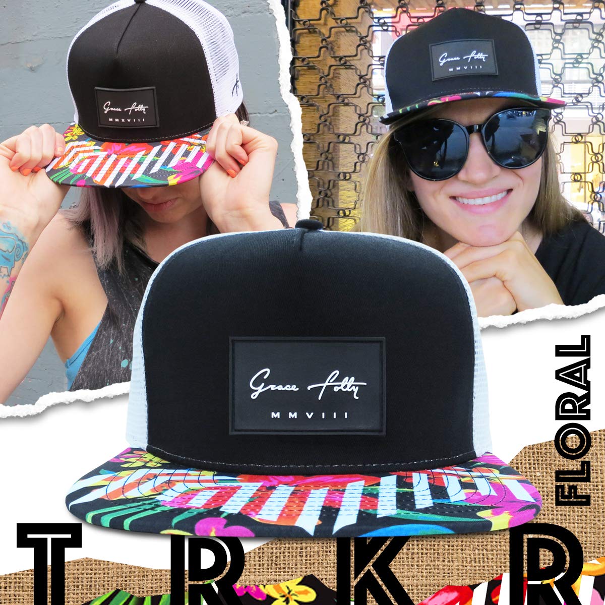 SMOOTH TRUCKER- This Floral Grace Folly flat bill trucker hat is sure to impress! Structured 5 panel trucker cap with mesh back and adjustable snapback. Be the envy of your friends in this old school trucker.