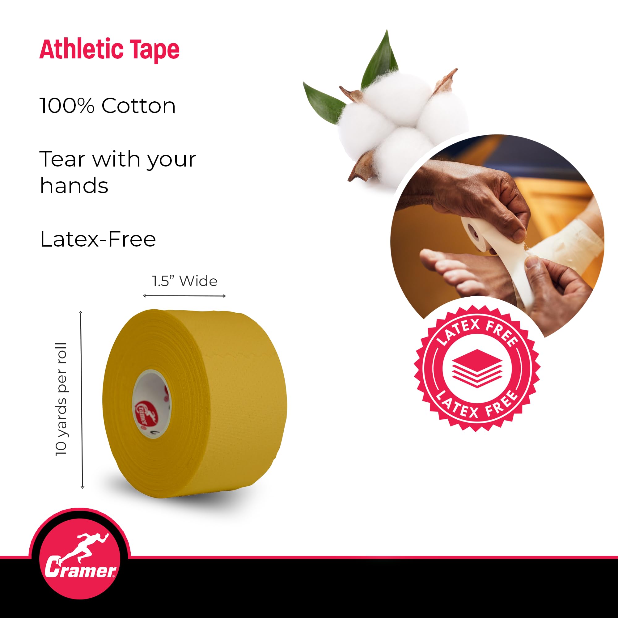 PRO-GRADE SUPPORT IN EVERY ROLL When performance matters, athletes reach for the Cramer Team Color Athletic Tape. Built with a high tensile strength backcloth and trusted by pros, this 6 pack of 1.5" x 10-yard rolls offers dependable joint support that won’t let you down. TEAR AND APPLY ON THE FLY No scissors? No problem. The easy tear design lets you wrap and go, whether you're courtside, fieldside, or on the mat. A computer-calibrated unwind ensures consistent tension for a smooth, even wrap every time. STICK WITH CONFIDENCE The latex-free, zinc oxide adhesive keeps tape securely in place, even through sweat, motion, and high-intensity play. And thanks to the breathable, porous fabric, it’s comfortable enough to wear for hours without irritation. SHOW YOUR COLORS, STAY IN THE GAME Choose from a wide range of team colors that keep your squad looking sharp while you stay supported. Whether you're taping ankles before a game or wrists during training, this versatile tape helps prevent injuries while promoting comfort and confidence. From weekend warriors to elite athletes, this is the tape you can trust to perform when it counts.
