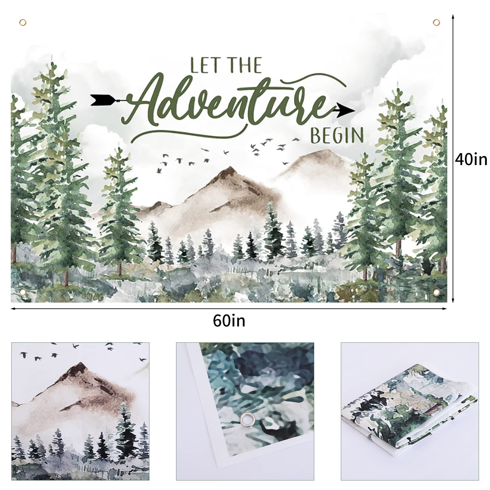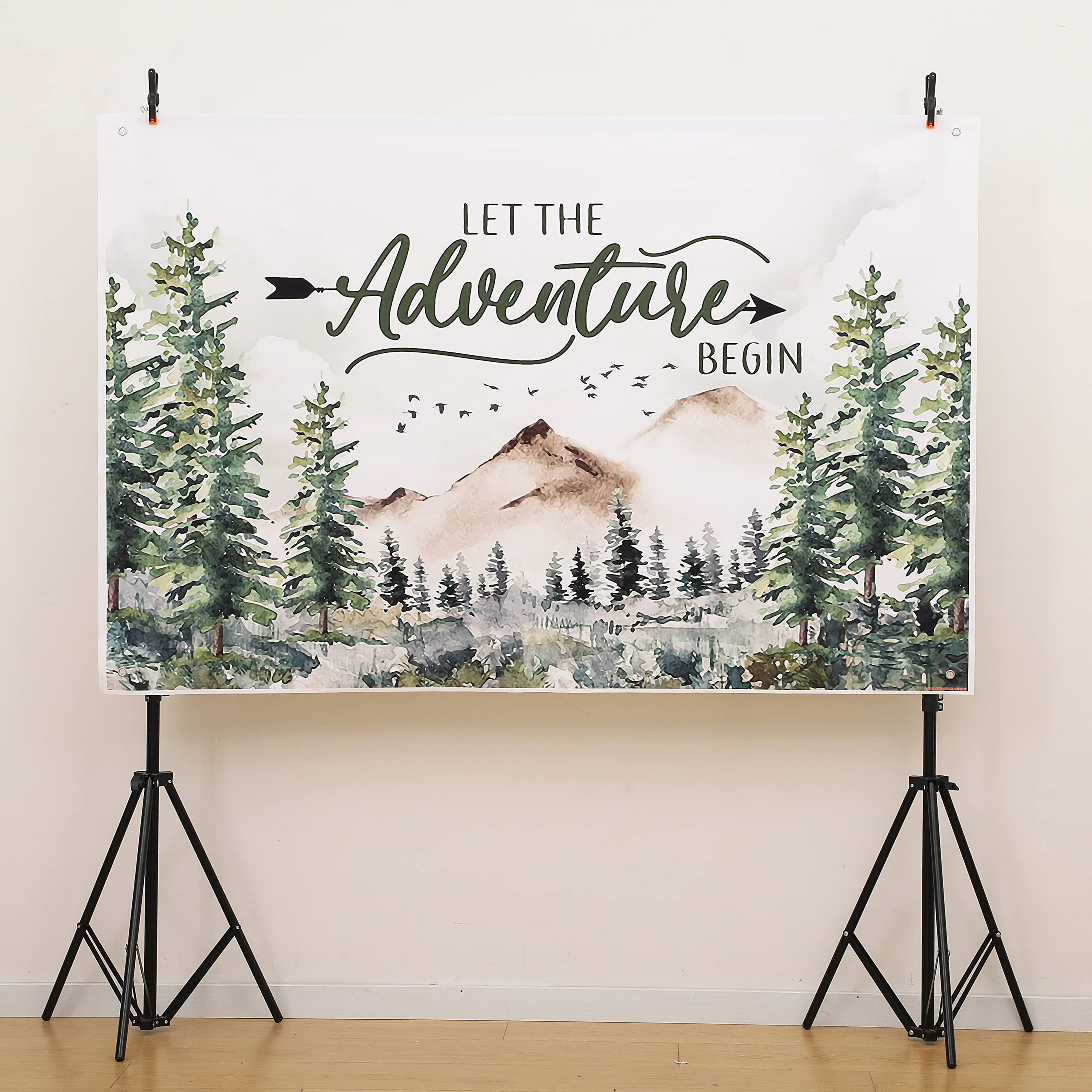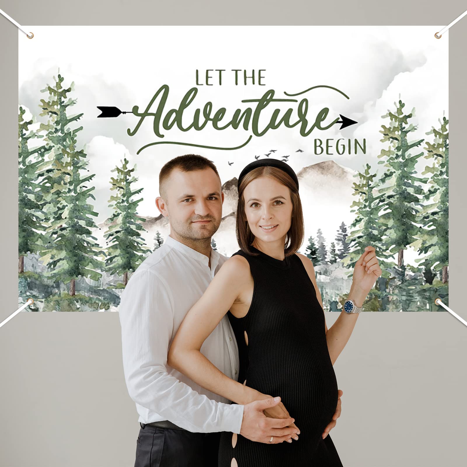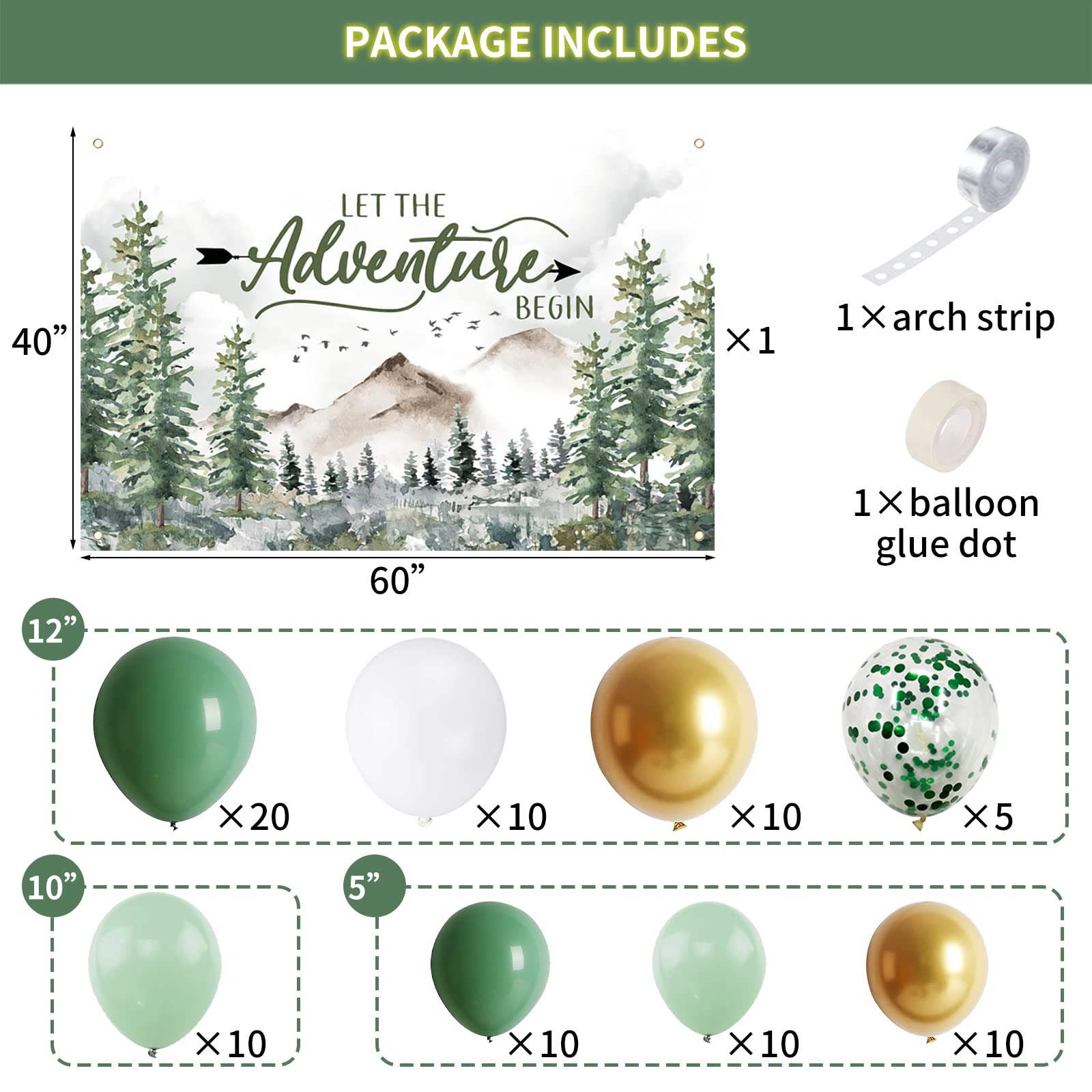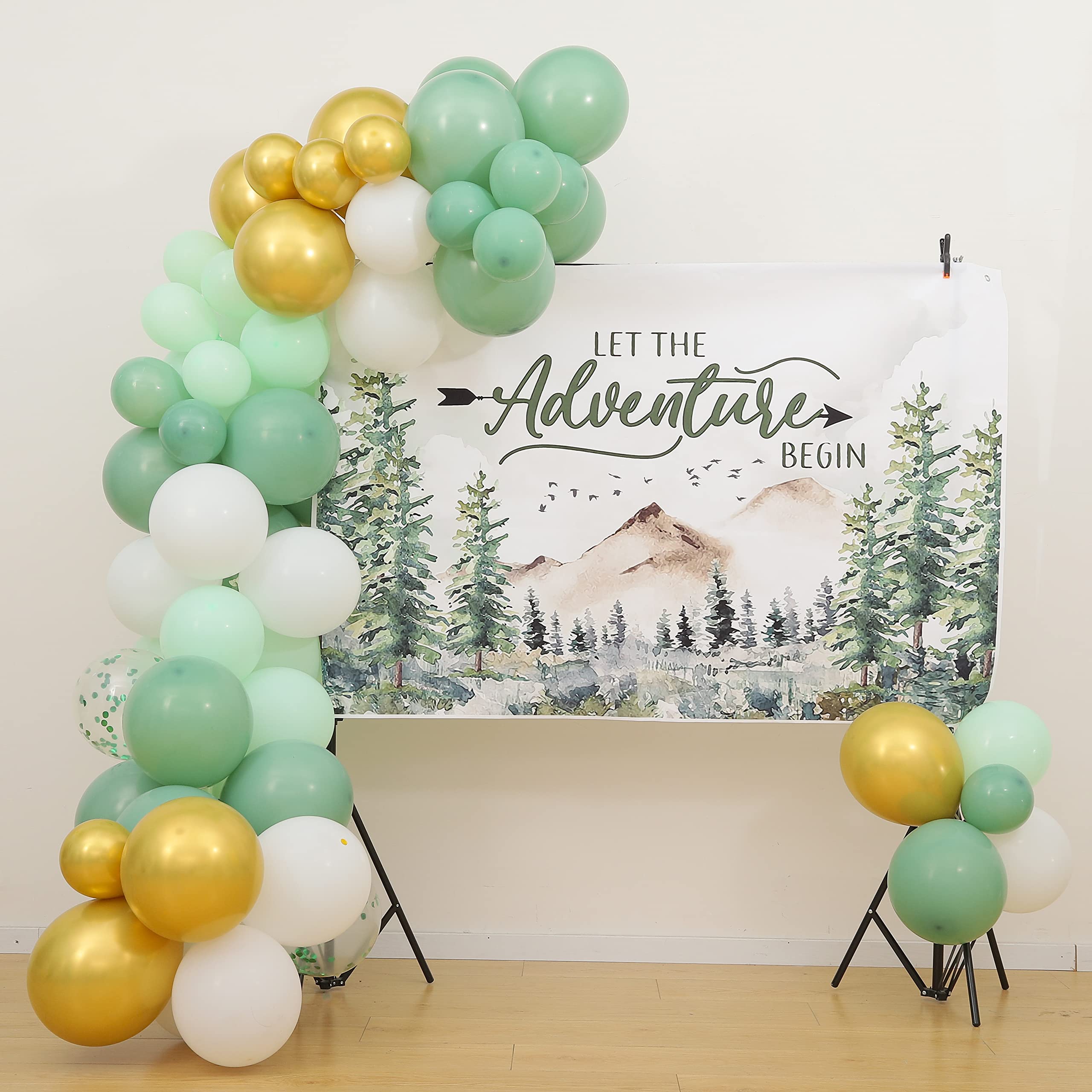 Adventure Baby Shower Decorations Set - Let The Adventure Begin Backdrop, Sage Green Balloon Garland for Travel Themed Party, Greenery Rustic Mountain Forest Woodland Party