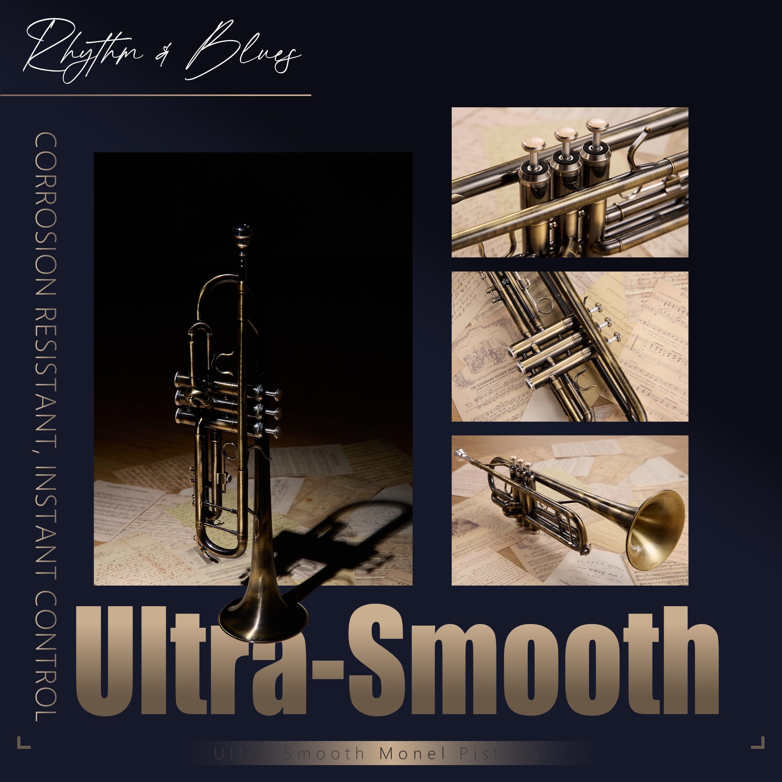 Vintage Design — Durable, Distinctive, and Expressive: This trumpet features an antique finish that protects the instrument’s surface while maintaining its timeless appearance. Beyond durability, the finish enhances the trumpet's resonance, adding warmth and depth to your tone. The vintage red copper and bronze finishes provide a bold, classic look, making the trumpet as visually striking as it is musically expressive. With this distinctive design, it stands out both on stage and in performance, combining elegance with exceptional sound quality.