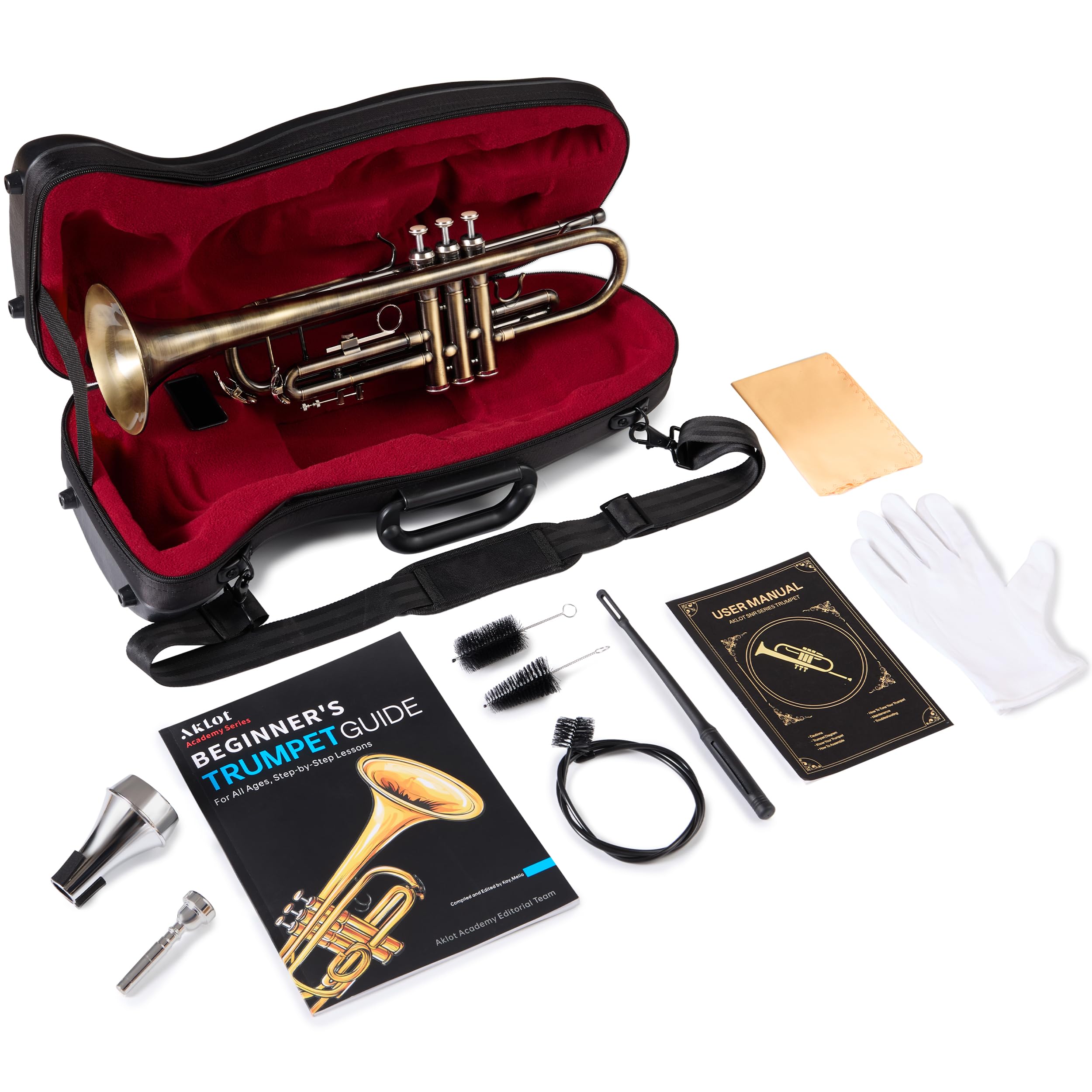 All-in-One Trumpet Package: This trumpet comes with a thoughtfully curated accessory set to support your musical journey right from day one. The premium leather hard case—with shoulder strap and reinforced corners—offers reliable protection and convenient portability, whether you're heading to class, rehearsal, or a performance. Also included: a beginner lesson book, high-quality 7C mouthpiece, trumpet mute for quiet practice, complete cleaning kit, a pair of white gloves, a soft cleaning cloth, and a user manual. Everything you need to play, maintain, and enjoy your trumpet.