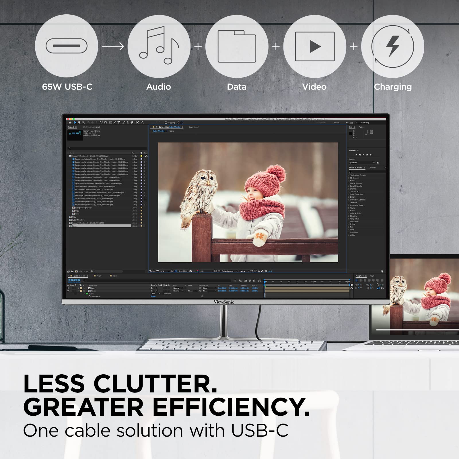 LESS CABLE CLUTTER: USB-C connectivity for fast data, audio and video transfer, and 65W charging over one cable