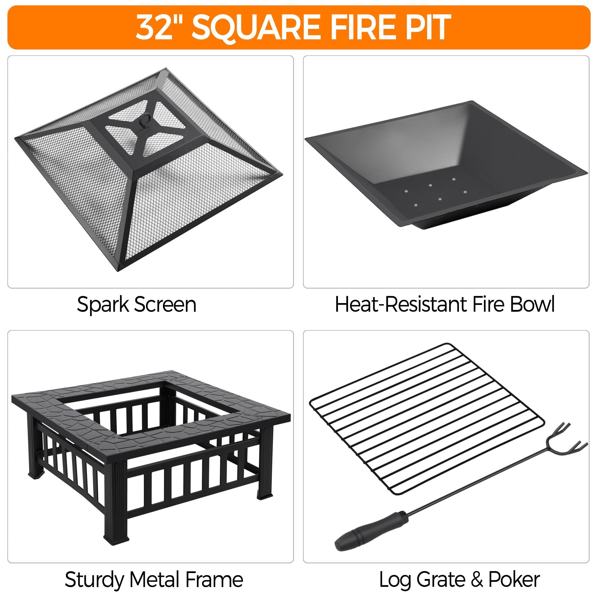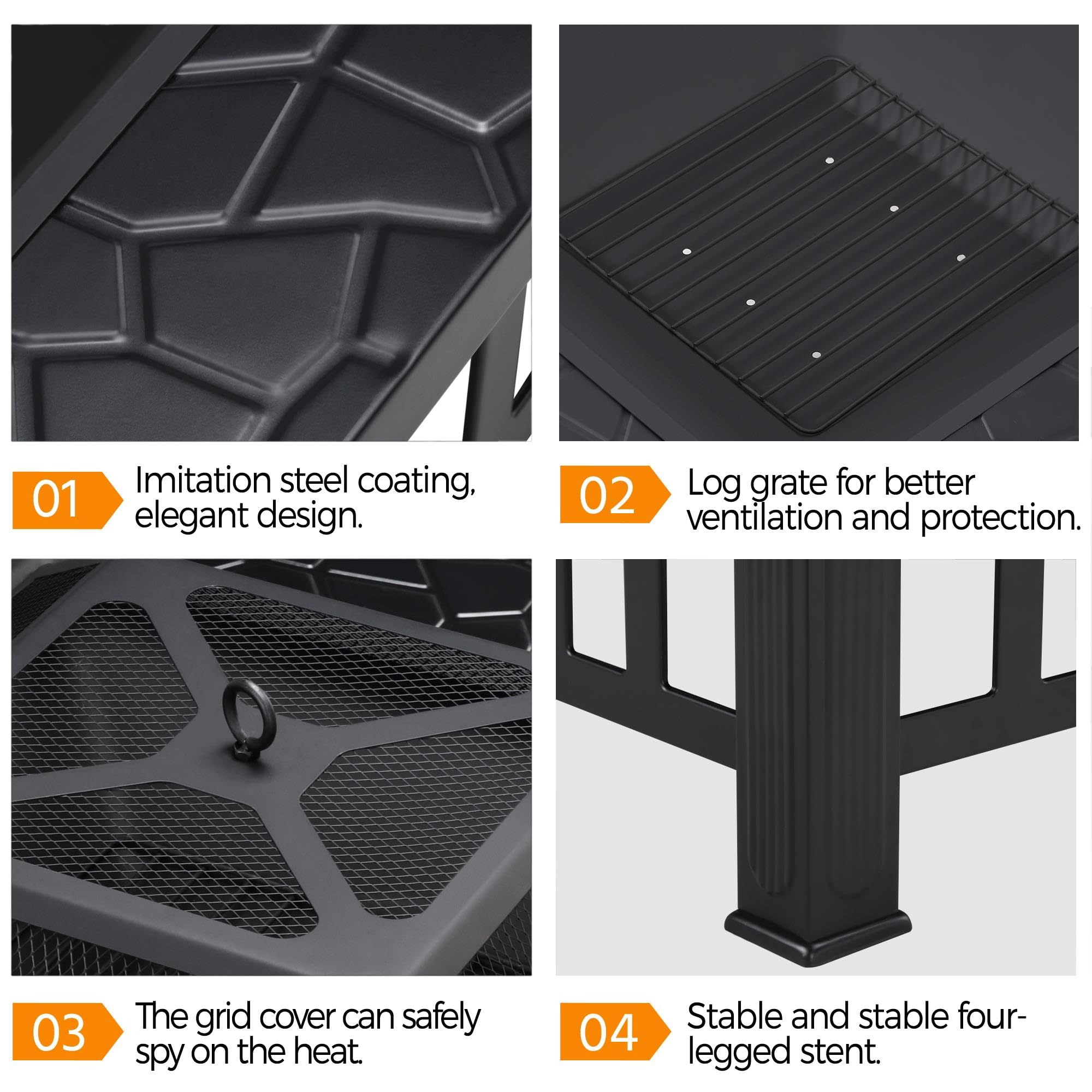Heat-resistant Metal Firepit: Constructed from solid metal with a heat-resistant finish, this square fire pit boasts high strength and good durability but is still lightweight. The fire bowl can withstand high temperatures of up to 600 ℃/1112 ℉