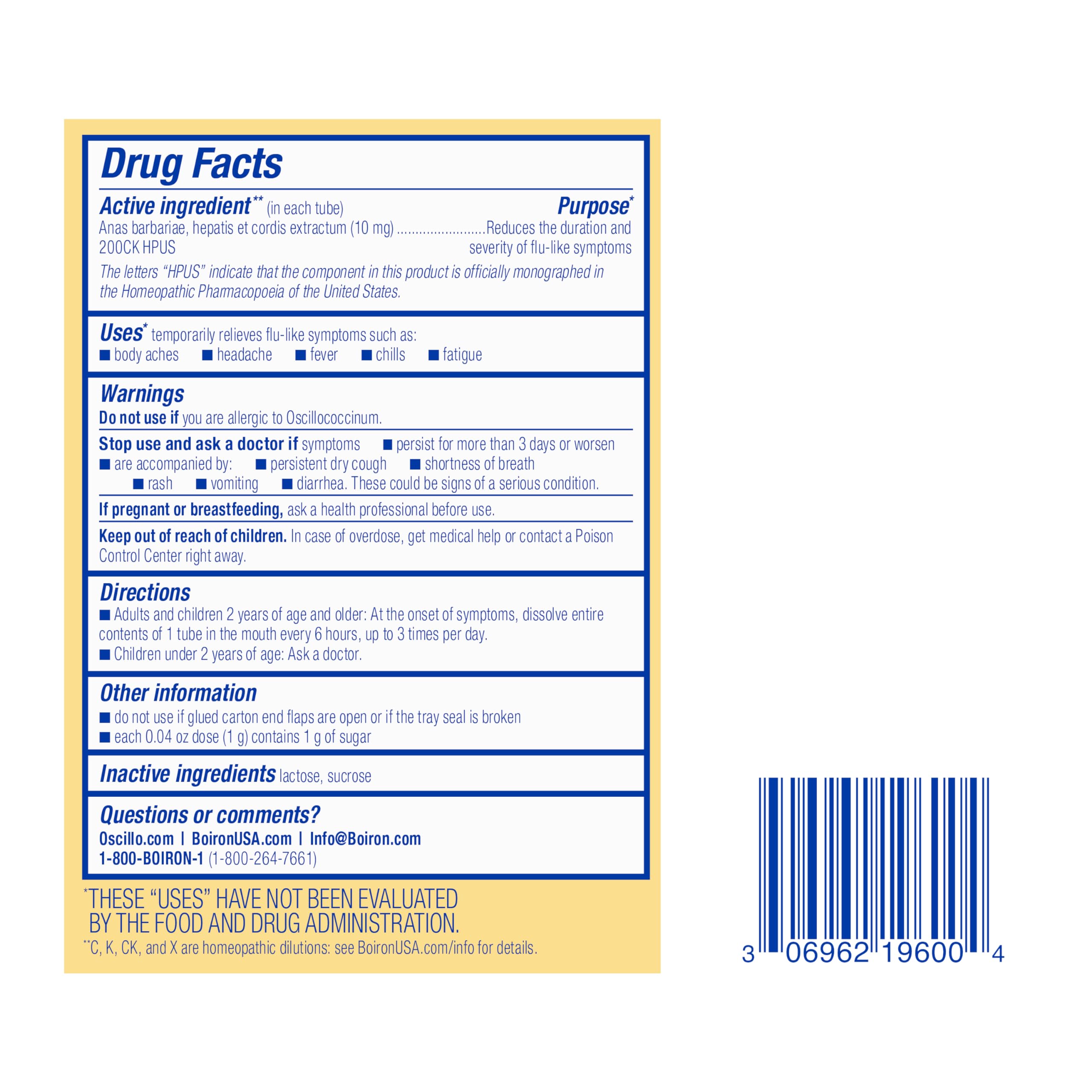 HOMEOPATHIC FLU RELIEF: Oscillococcinum works with your body to help relieve body aches, headache, fever, chills, and fatigue.* Ideal for ages 2 and up, take at the first sign of flu-like symptoms
