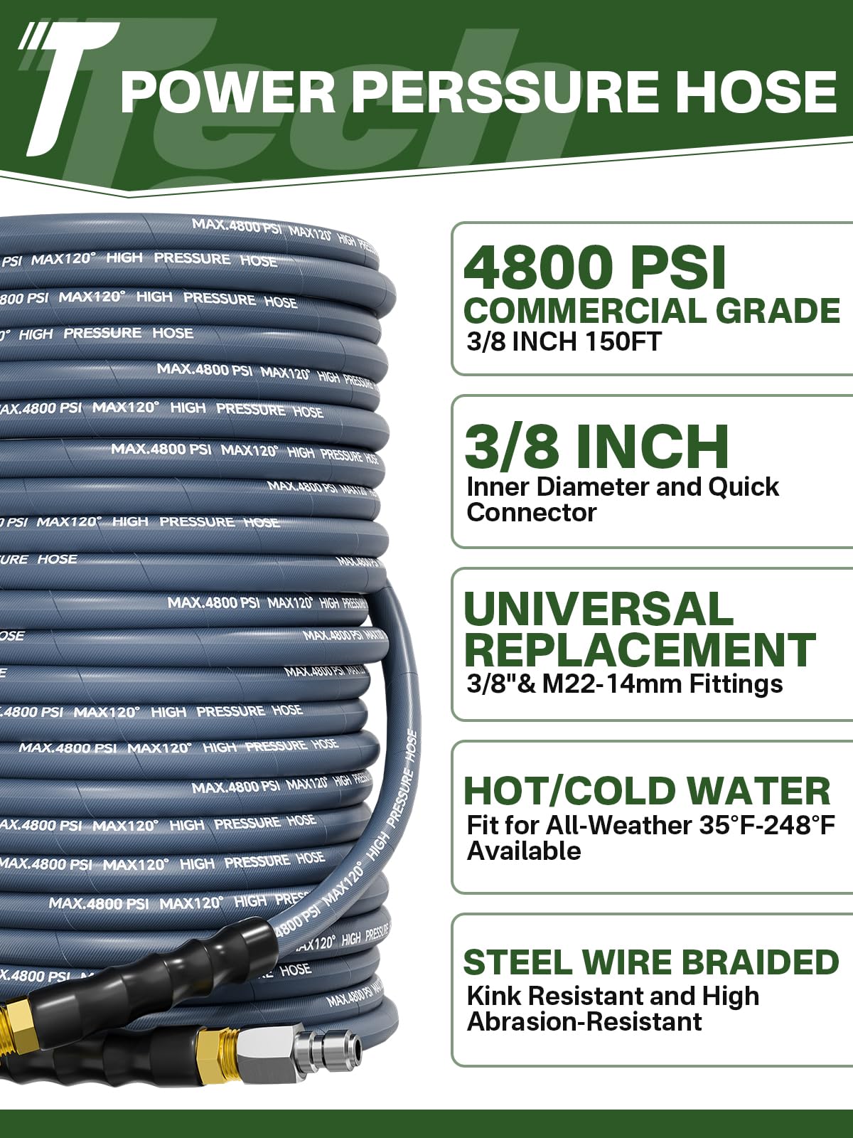 【150FT Powerful Washing Hose】Upgraded high-strength steel wire braiding and German engineering redesigned 150-foot hose, kink-resistant, wear-resistant, with a bend radius of less than 3 inches, 50% more flexible than cheaper hard hoses, easy to drag, fast moving. Working temperature 35°F to 248°F (0°C to 120°C), suitable for all-weather use, suitable for hot and cold water use, easier and faster to remove heavy dirt.