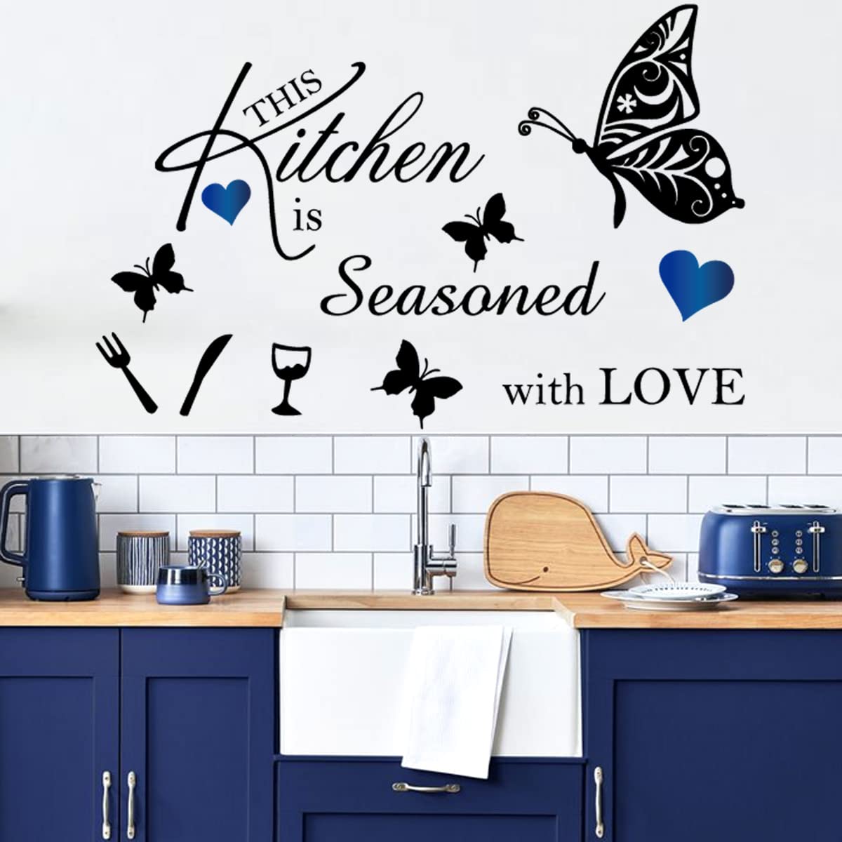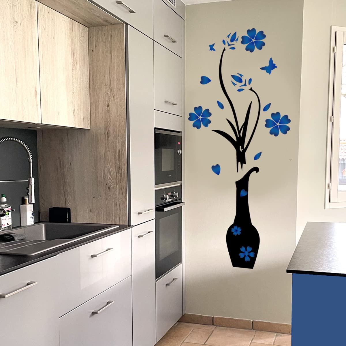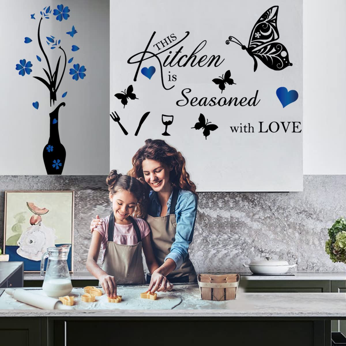 Package contents: the vinyl wall stickers include kitchen wall decal and vase flower butterflies wall stickers with fork blue hearts. abundant quantity is enough your kitchen room decoration.