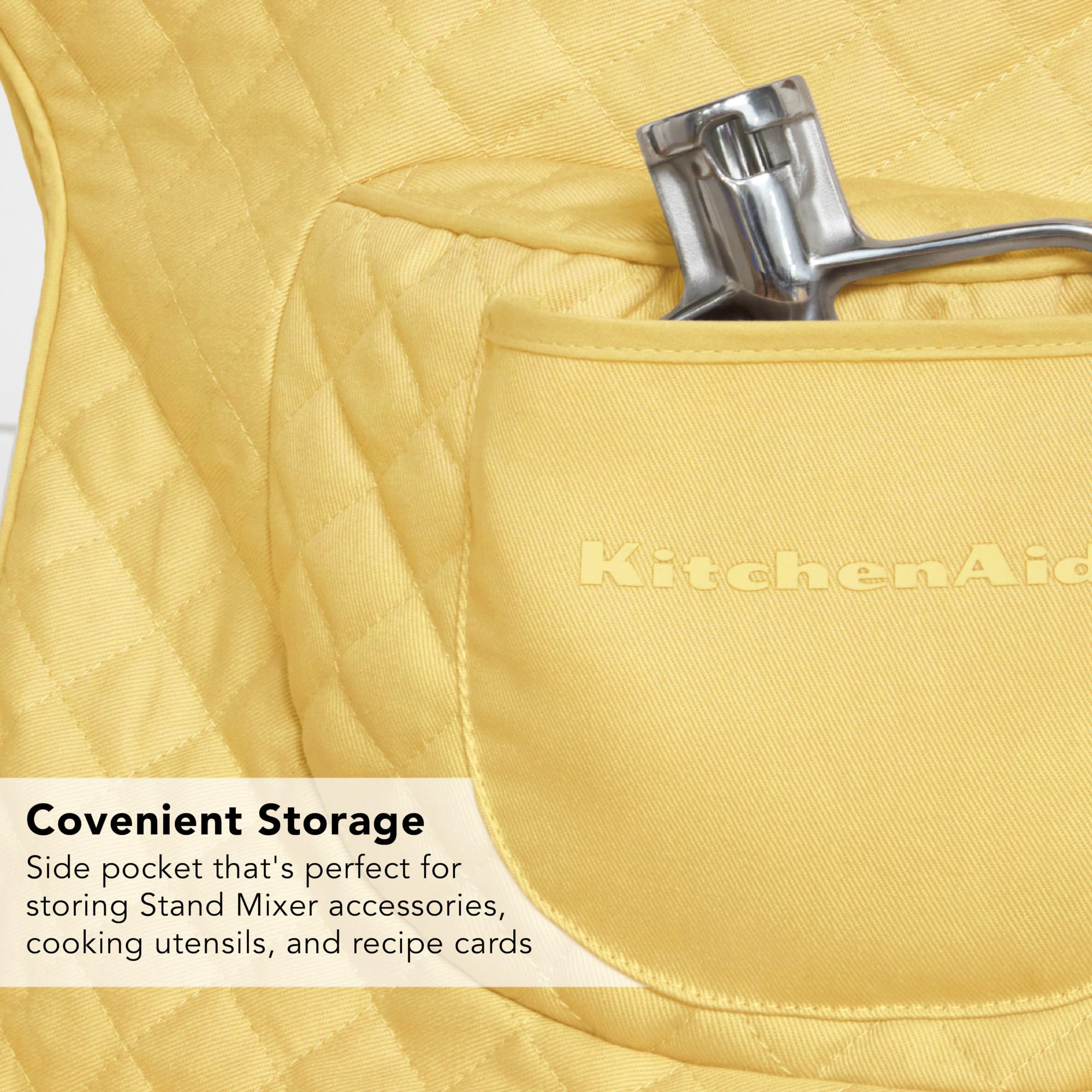 Protect and store your KitchenAid Tilt-Head Stand Mixer neatly and in style with the KitchenAid Fitted Tilt-Head Stand Mixer Cover. Made of 100% Cotton, this heavy-duty, quilted mixer cover is designed to protect your KitchenAid Stand Mixer from scratches, damage, and dust while it’s not in use. It features a convenient front pocket that's perfect for storing Stand Mixer attachments and your favorite recipe cards. This mixer cover is compatible with all KitchenAid Tilt-Head Stand Mixers using a standard 3 to 5qt stainless steel bowl. It’s also machine washable for easy care.