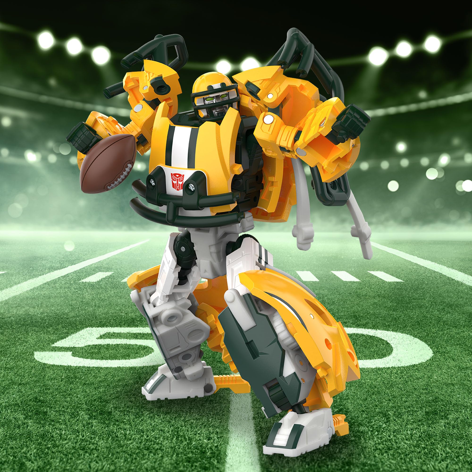OFFICIALLY LICENSED NFL TRANSFORMERS BOT: This Transformers figure, Tundra Prime, represents the Green Bay Packers and features team colors, a mini helmet and a football accessory.