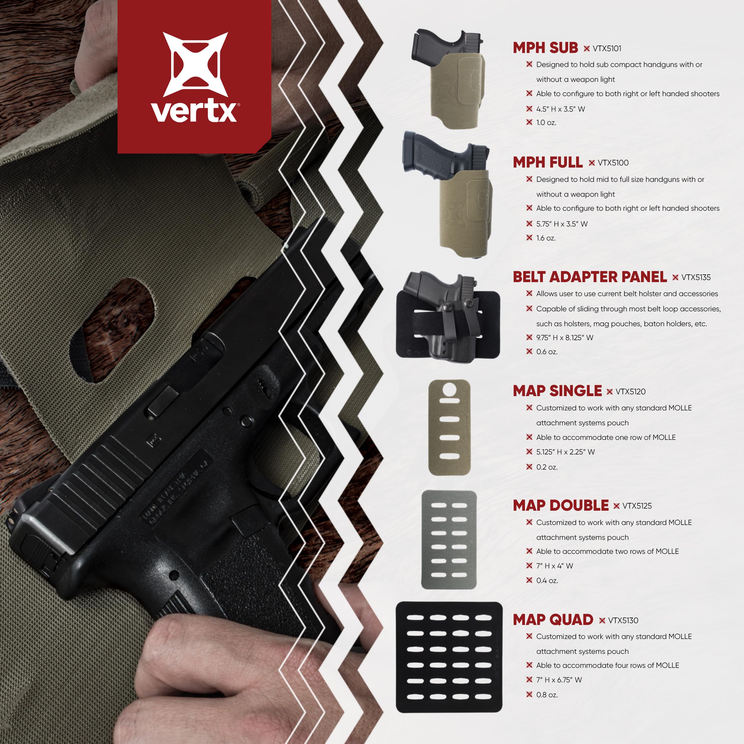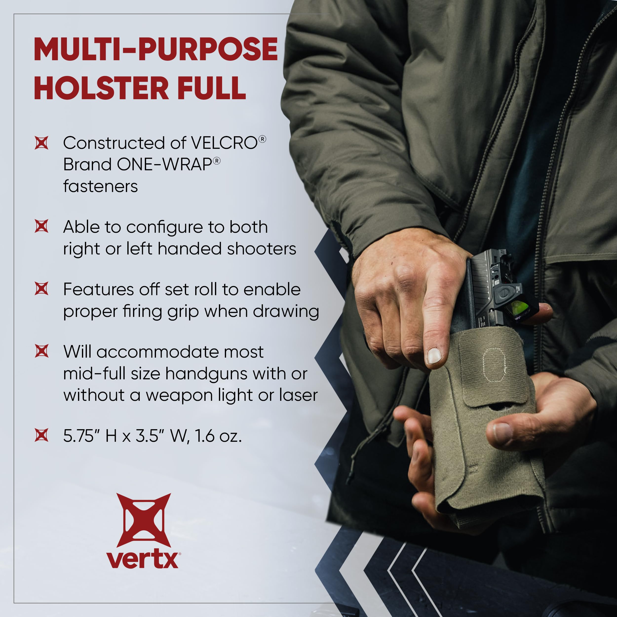 Description Vertx's unique design allows for a fully customized organized carry of your tactical gear. Vertx Tactigami is a line of hook and loop accessories constructed on Velcro one wrap material. Each Tactigami item can be trimmed to be fully customized to your item and attached to any compatible surface. Due to their high-quality design, they can be reused and reshaped without losing grip strength. Vertx's appendix carry holster can fit nearly all full-sized appendices, due to its fully customizable nature. The universal holster wraps around your tactical device for a custom fit, with TPR retention to prevent sliding. The holster then attaches to the loop panel in any direction For the ultimate concealed carry place the MPH Full holster inside one of Vertx's bags or packs, making the ideal concealed carry holster for men and women. A universal holster that can be used over and over again, Vertx MPH Full is for you.