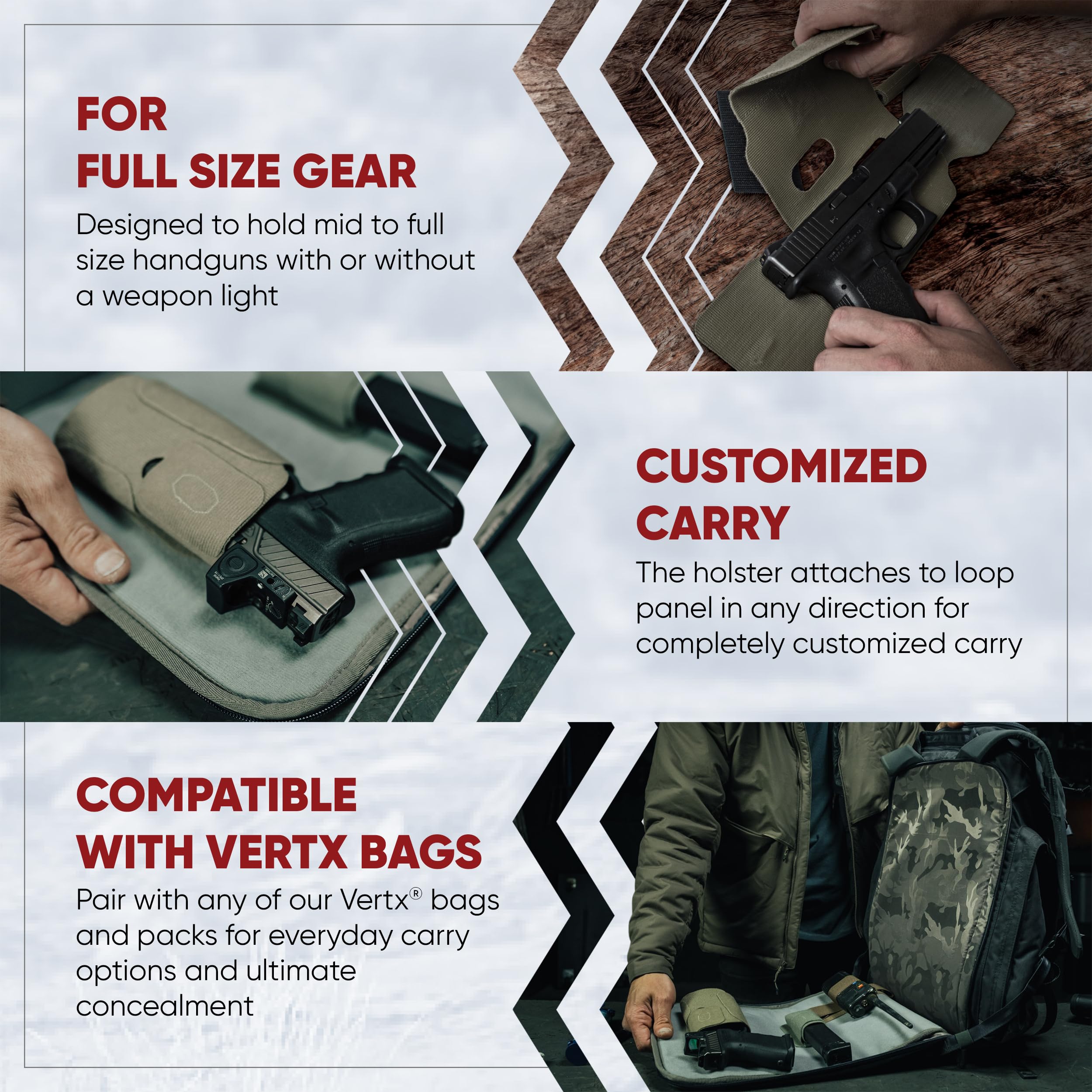 CUSTOM FIT HOLD: The holster's Velcro wrap conforms around most full size handguns including lights or lasers for secure retention with TPR support.