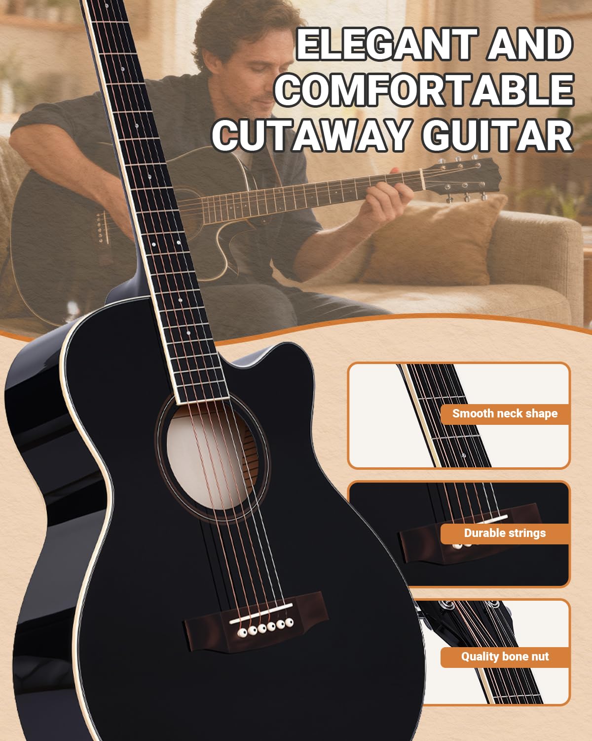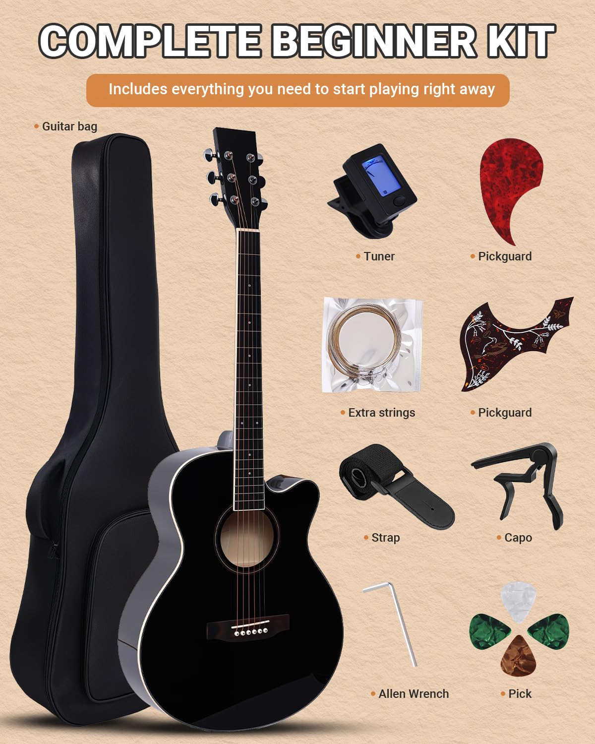 COMPLETE BEGINNER ACOUSTIC GUITAR KIT: Includes everything you need to start playing right away: a 41" full-size cutaway acoustic guitar, acoustic guitar bag, tuner, strap, picks, capo, strings, truss rod, and pickguard. The 41" full-size acoustic guitar set is a great choice for beginners and even intermediate players
