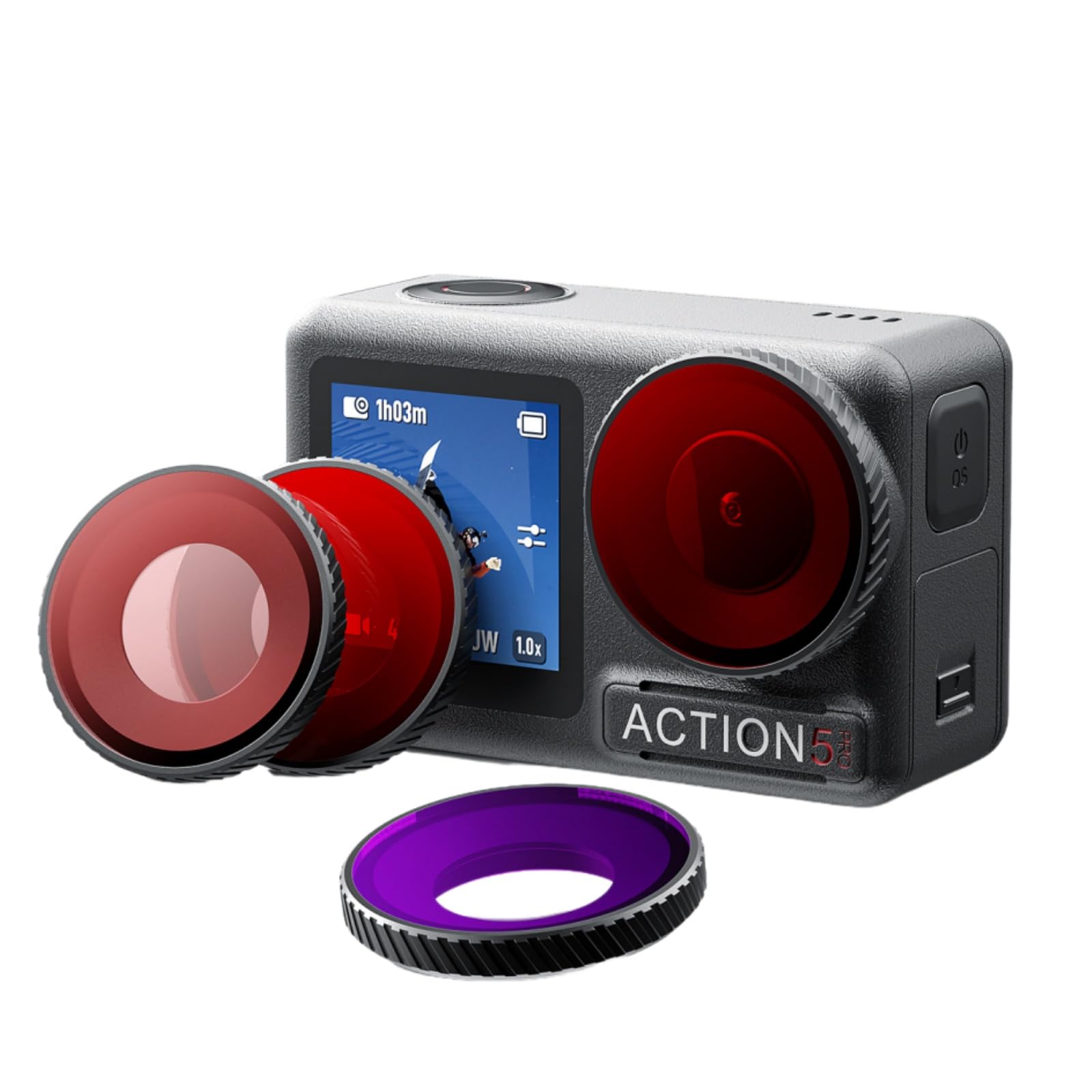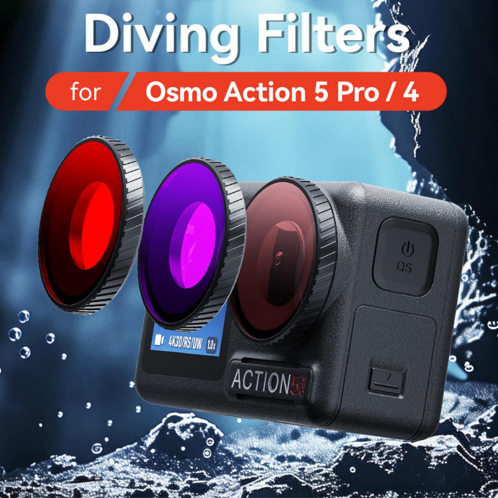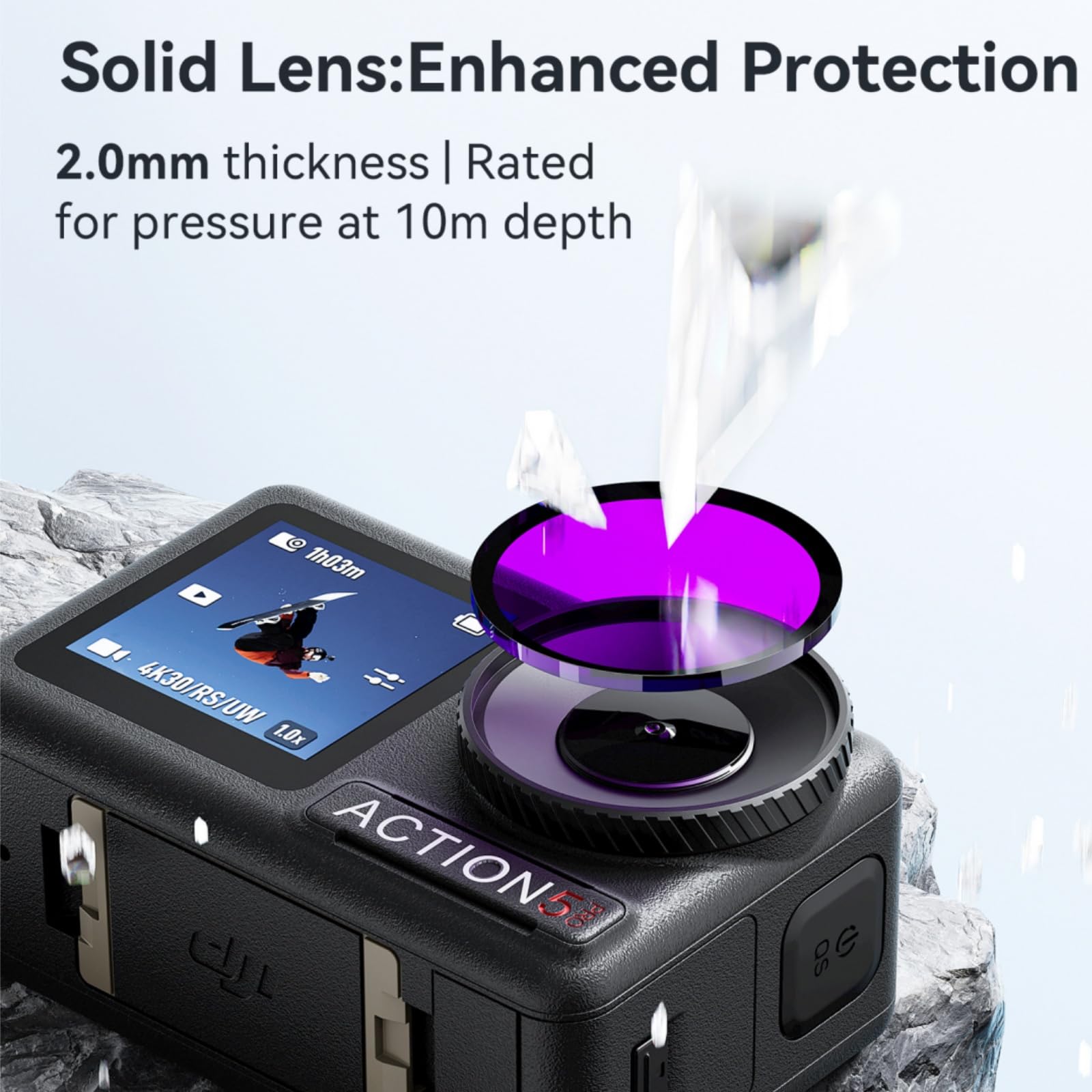 Diving Filter Compatible with Osmo Action 5 Pro / 4 Aluminum alloy frame ensures reliable durability, laser-engraved text resists fading and discoloration Dimensions match official protective lens for seamless compatibility with Action 5 Pro/4 official waterproof cases and third-party waterproof cases Once installed, the frame tightly seals against the waterproof gasket on the main unit, effectively isolating water droplets and moisture from the lens cavity. This allows worry-free shooting in underwater, rainy, humid, or low-temperature environments. Thickened lens for enhanced protection. The 2.0mm-thick lens effectively withstands pressure at depths of up to 10 meters.