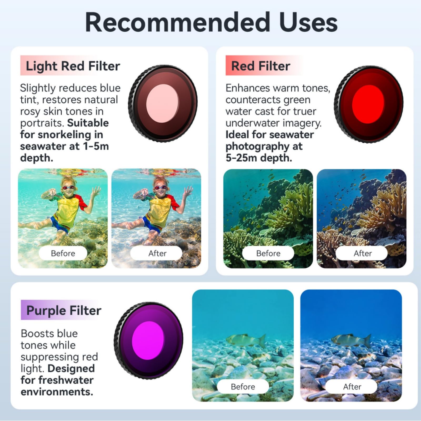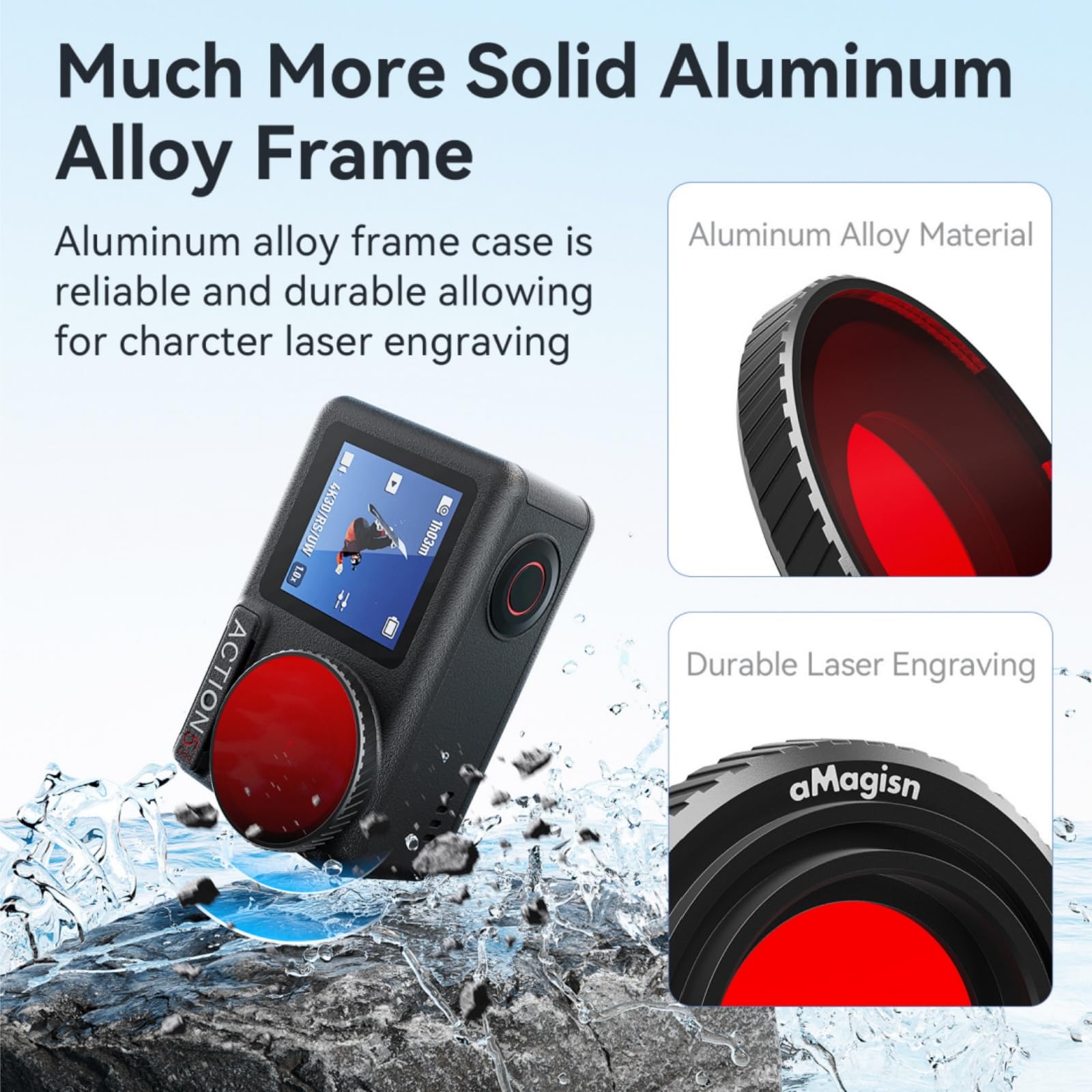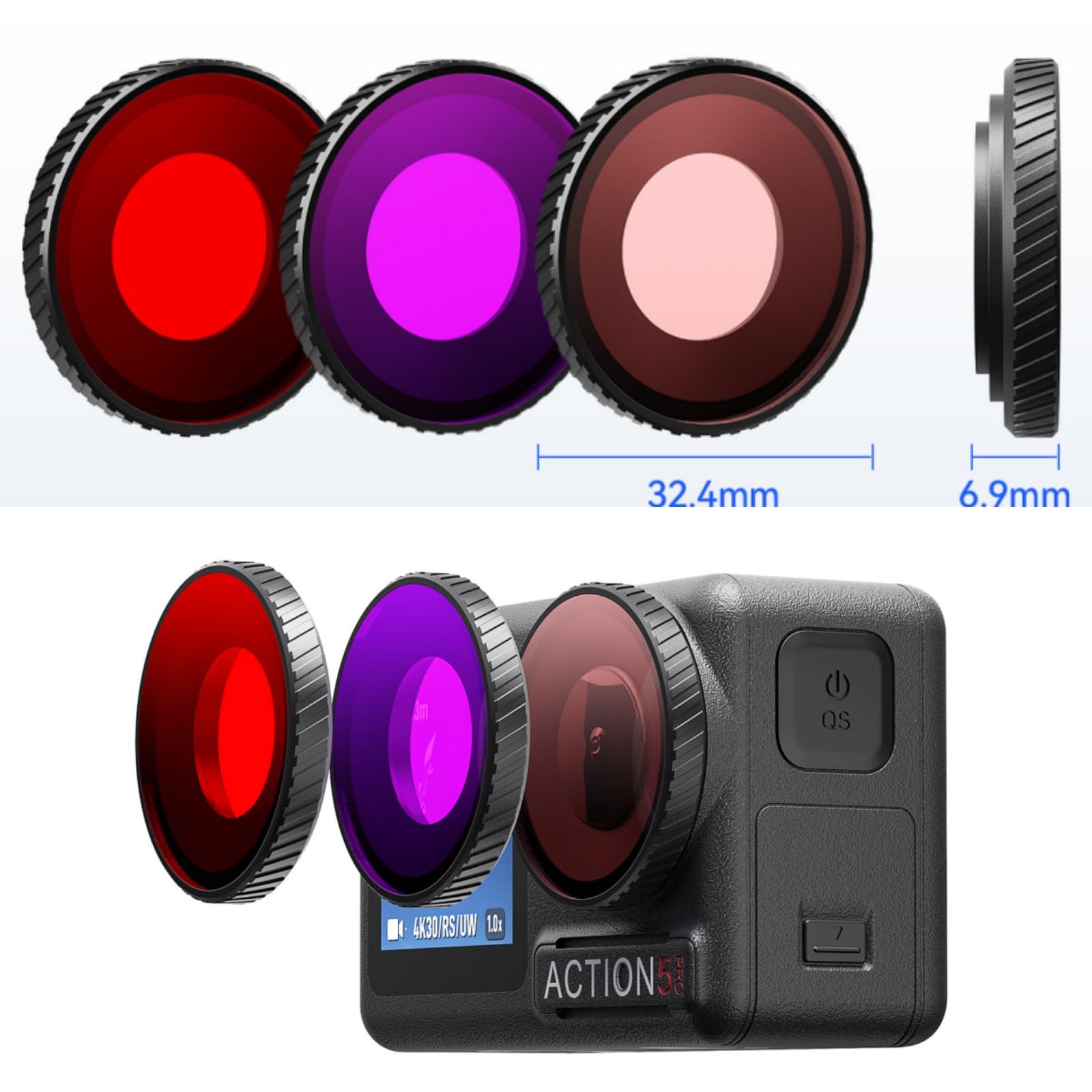 Diving Filter Compatible with Osmo Action 5 Pro / 4 Aluminum alloy frame ensures reliable durability, laser-engraved text resists fading and discoloration Dimensions match official protective lens for seamless compatibility with Action 5 Pro/4 official waterproof cases and third-party waterproof cases Once installed, the frame tightly seals against the waterproof gasket on the main unit, effectively isolating water droplets and moisture from the lens cavity. This allows worry-free shooting in underwater, rainy, humid, or low-temperature environments. Thickened lens for enhanced protection. The 2.0mm-thick lens effectively withstands pressure at depths of up to 10 meters.