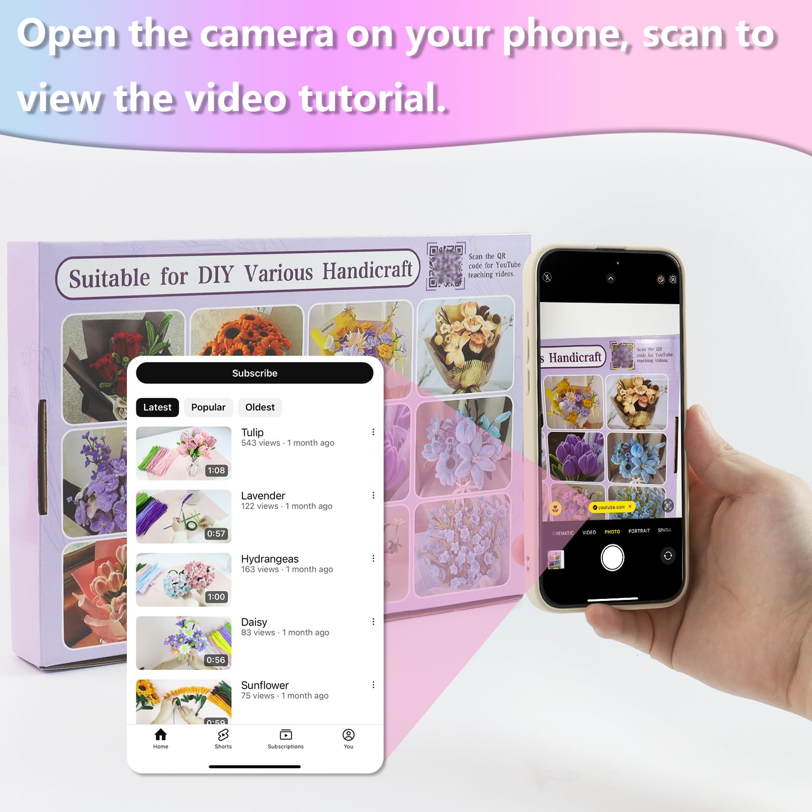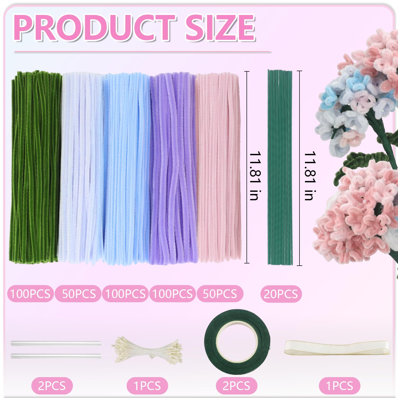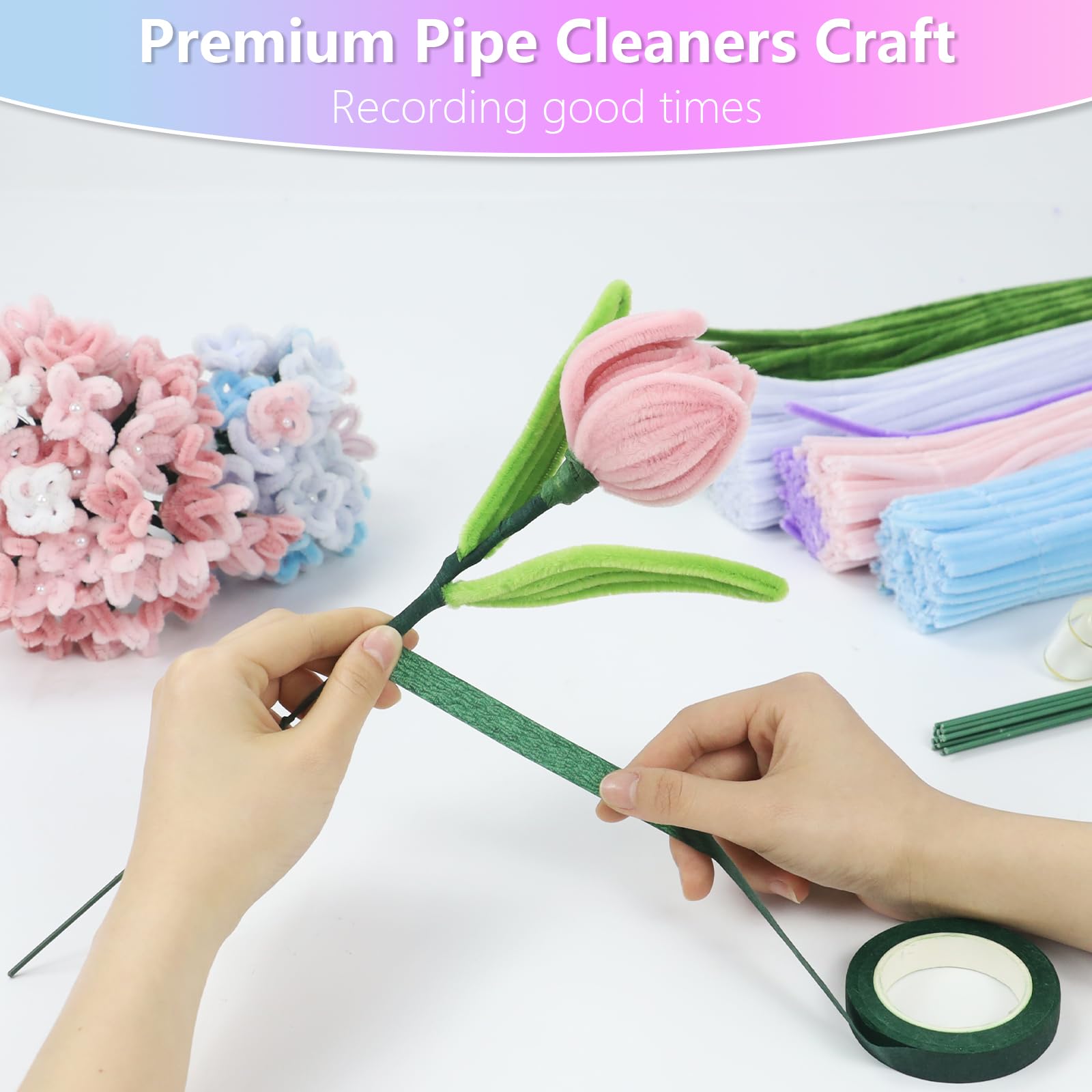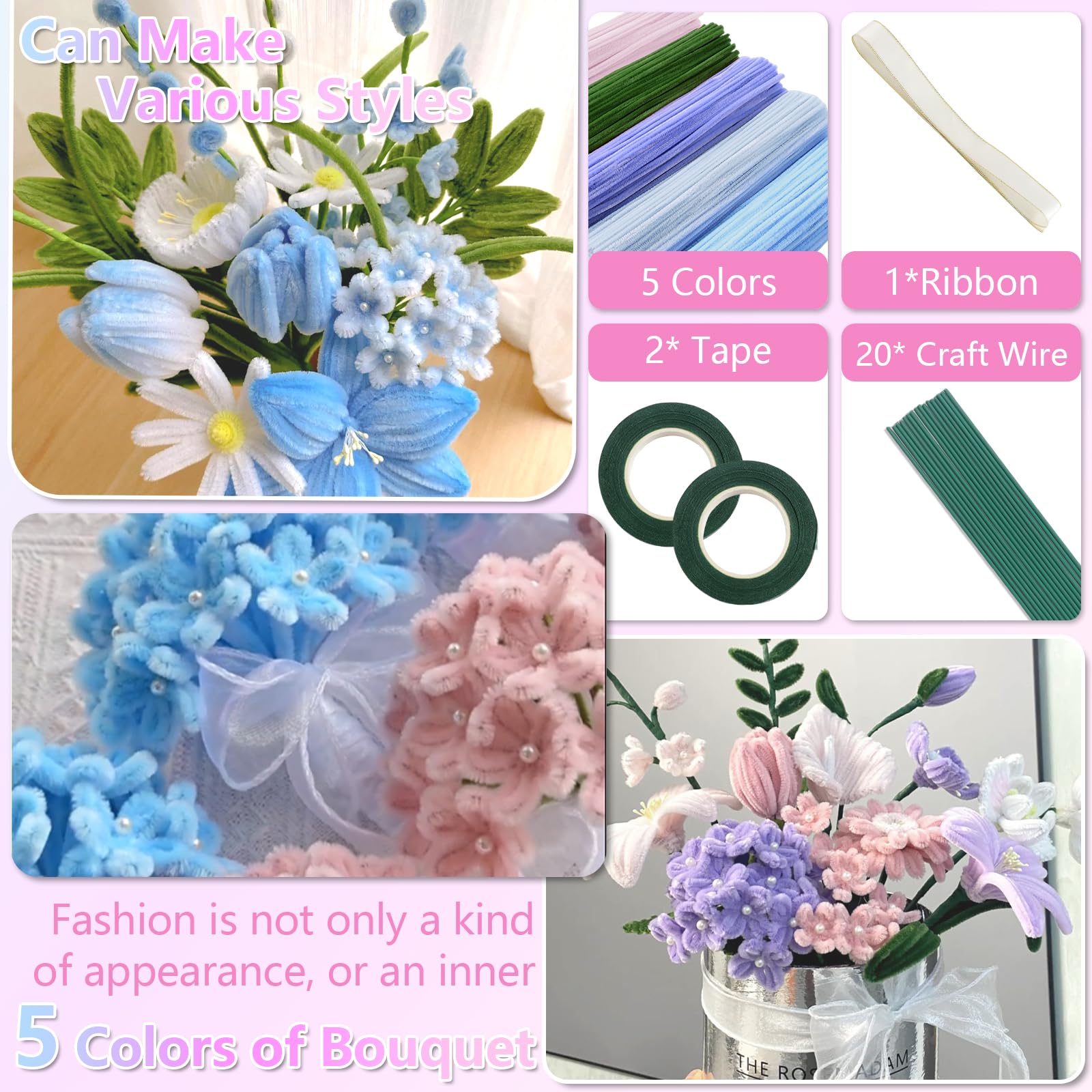 🌷【Colorful Pipe Cleaners Kit】This product includes all crafting accessories for tulip bouquets: 150 different tone purple pipe cleaners+100 green pipe cleaners+100 blue pipe cleaners+50 pink pipe cleaners, 20 Floral wires,100 stamen,1 roll of ribbon,2 adhesive tapesand,video tutorials.