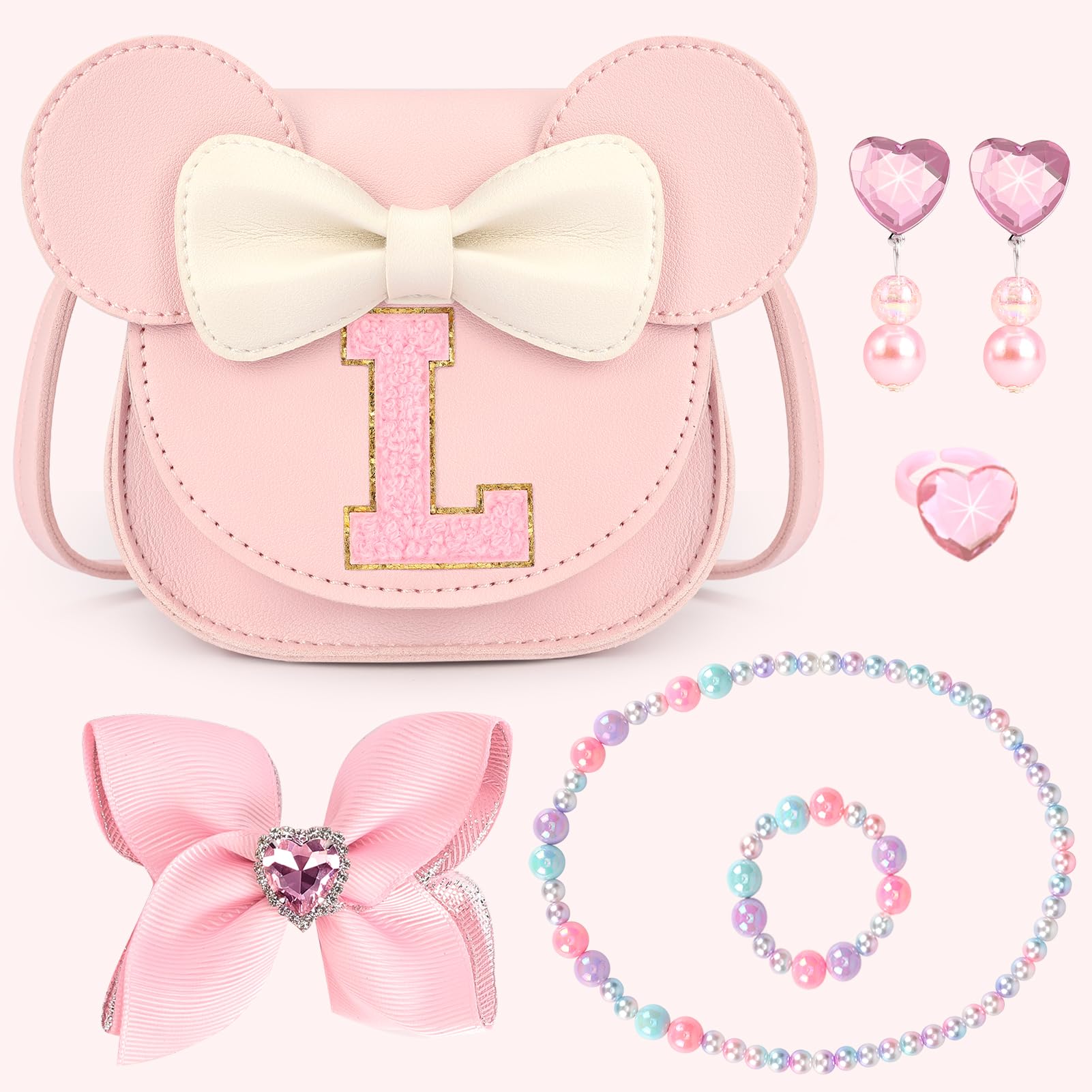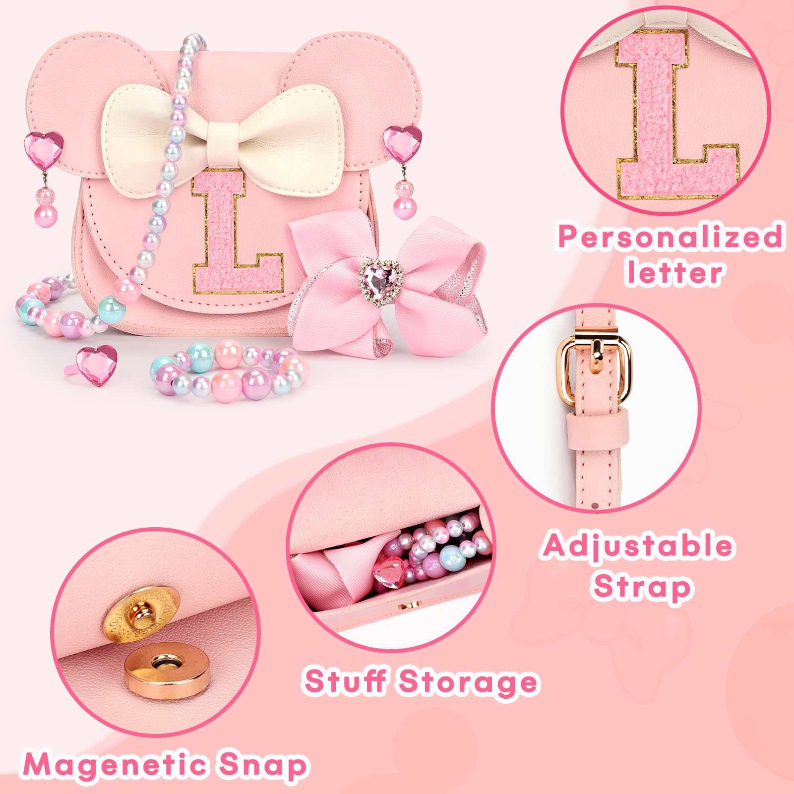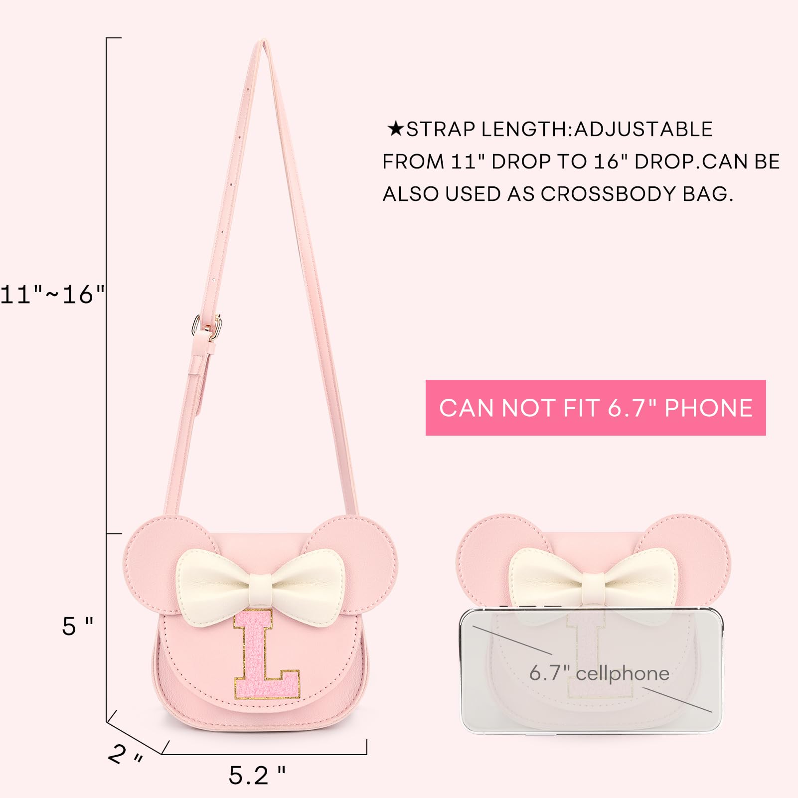 Cute Shape: Patched with a letter,This little girl purse would be a personalized birthday gifts for 6 year old girls or under. Kids would love its mouse ears and bow. Tip: Please select the letter you want in the STYLE