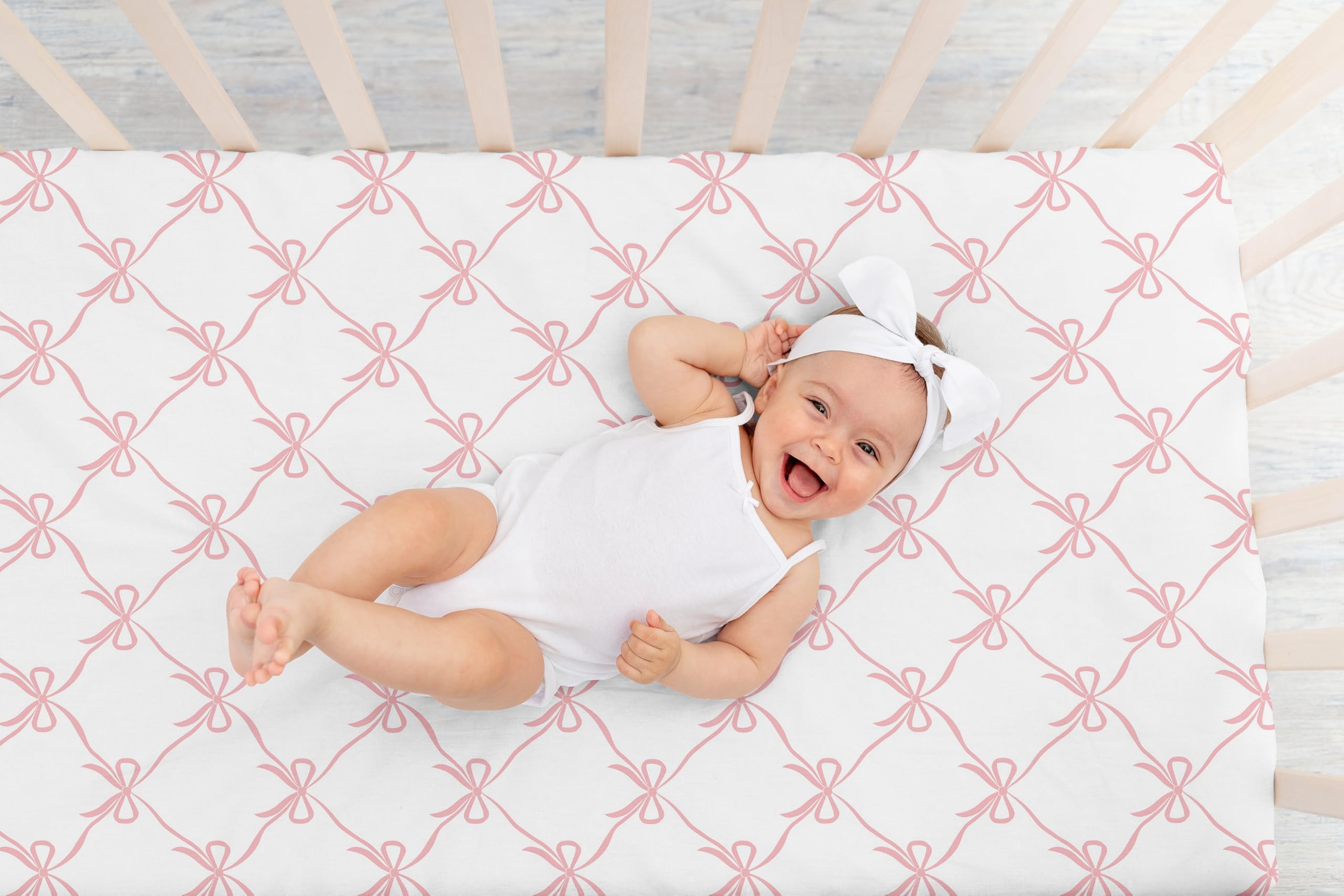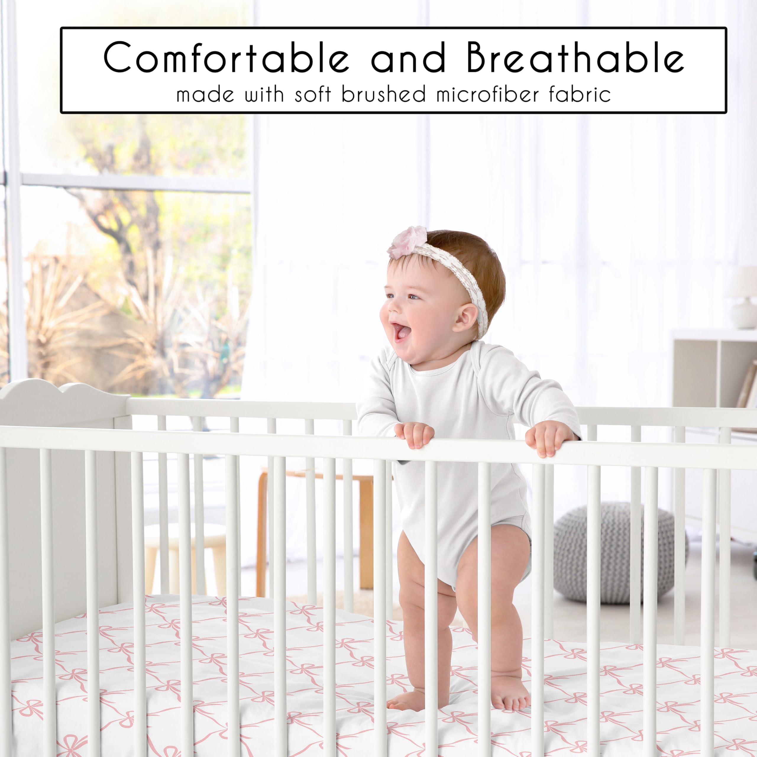 SNUG FIT: Includes (1) Fitted Crib Sheet 52in. x 28in. x 8in. Our newborn standard crib sheets fit snugly, with premium elastic sewn around the entire bottom edge for a secure fit on most standard sized cribs and toddler beds, to reduce shifting & bunching. This brushed microfiber crib sheet features an exclusive design of a blush pink & white bows print made to match the floral, dancer, princess, ballerina & ballet collection & is gentle on delicate skin to foster a soothing sleep environment.