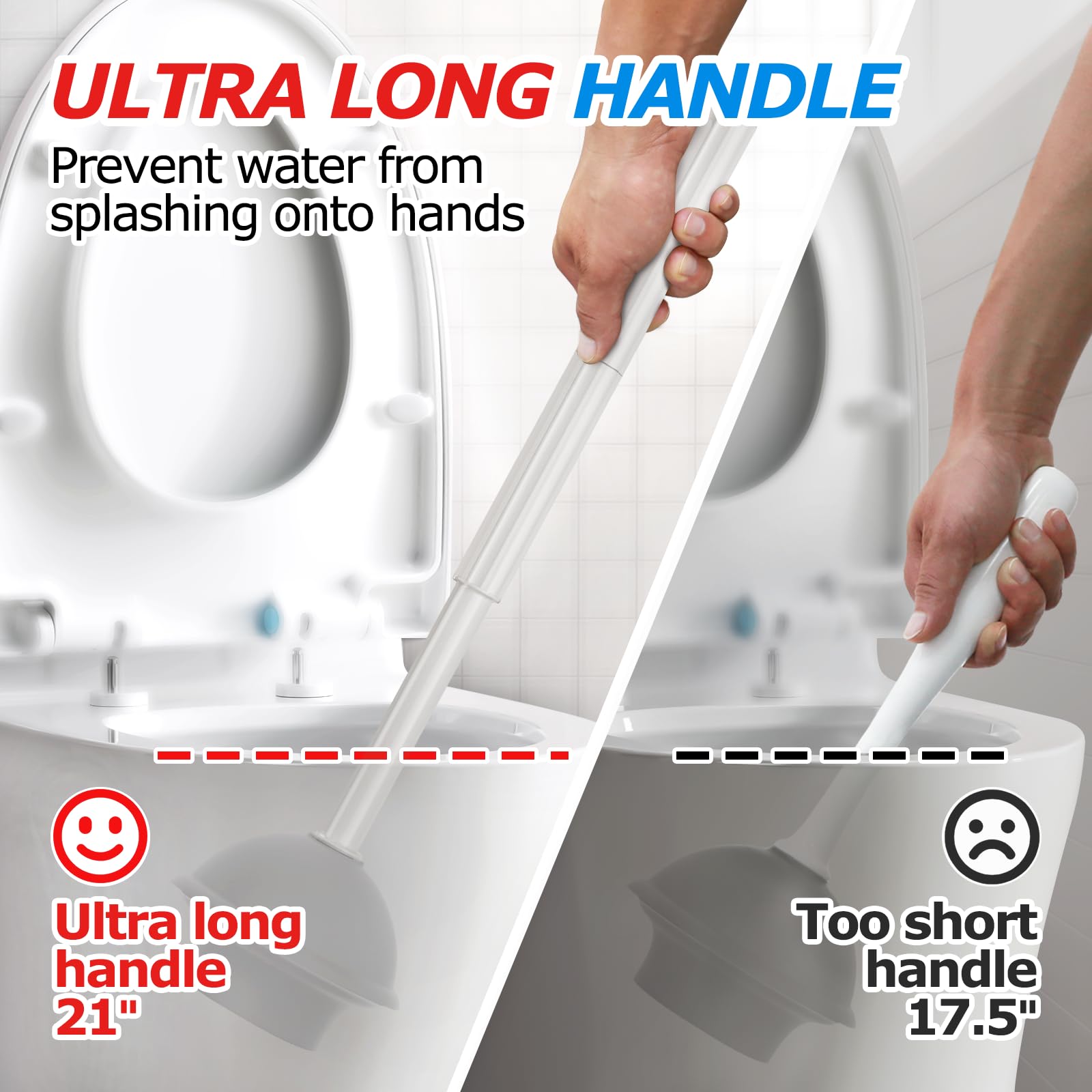 ♦Extended handle -Heavy Duty Toilet Plunger: Compared to ordinary handles, our upgraded extended handle provides a better user experience and prevents stains from splashing onto the hands. A professional powerful suction cup that can solve various blockage problems. Comfortable handles provide greater support during use.