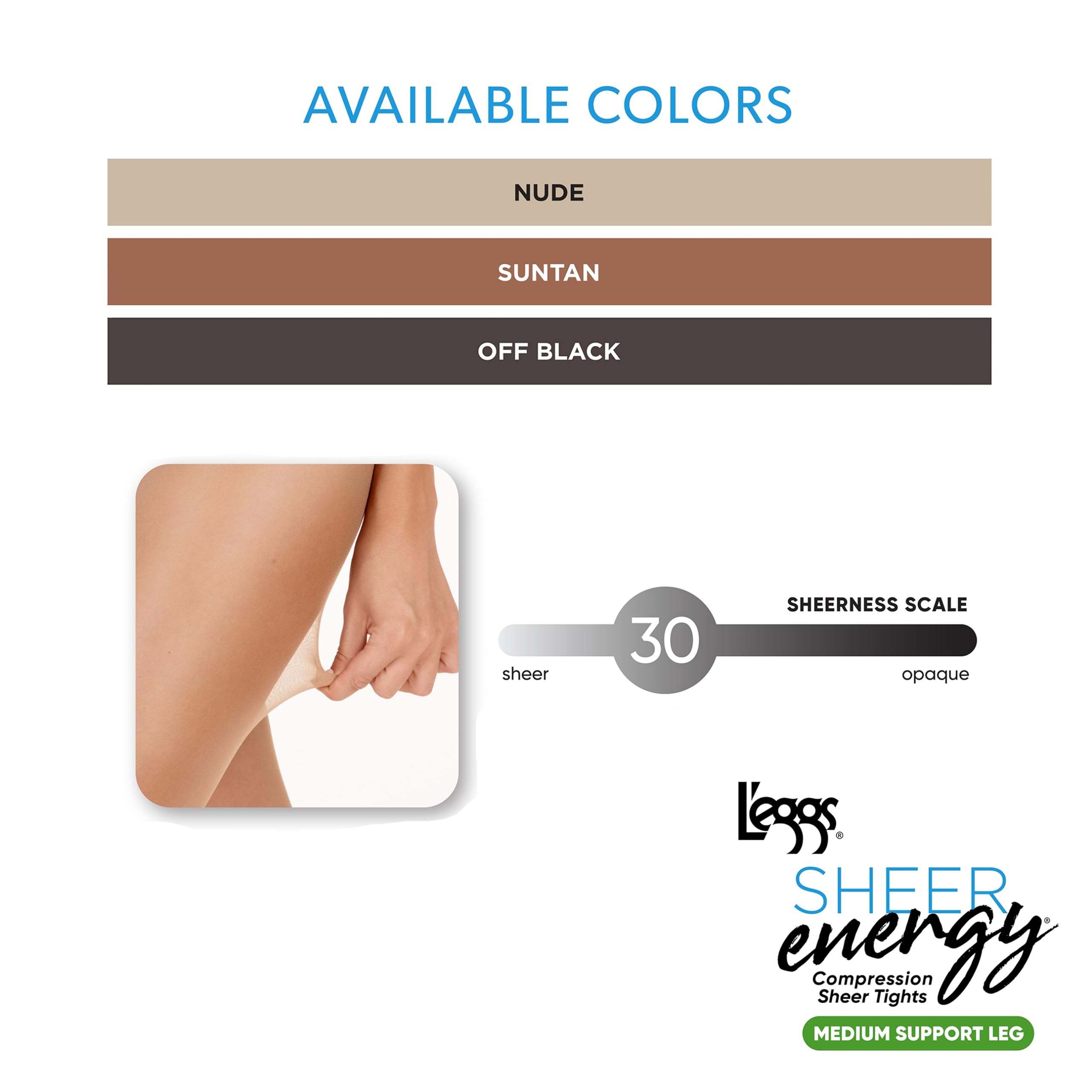 MEDIUM SUPPORT: Enhanced with micro toning technology, L'eggs Sheer Energy Tights enhance your silhouette for a smooth, toned appearance while keeping you feeling comfortable & vibrant; Perfect for when you want style that supports you throughout the day.