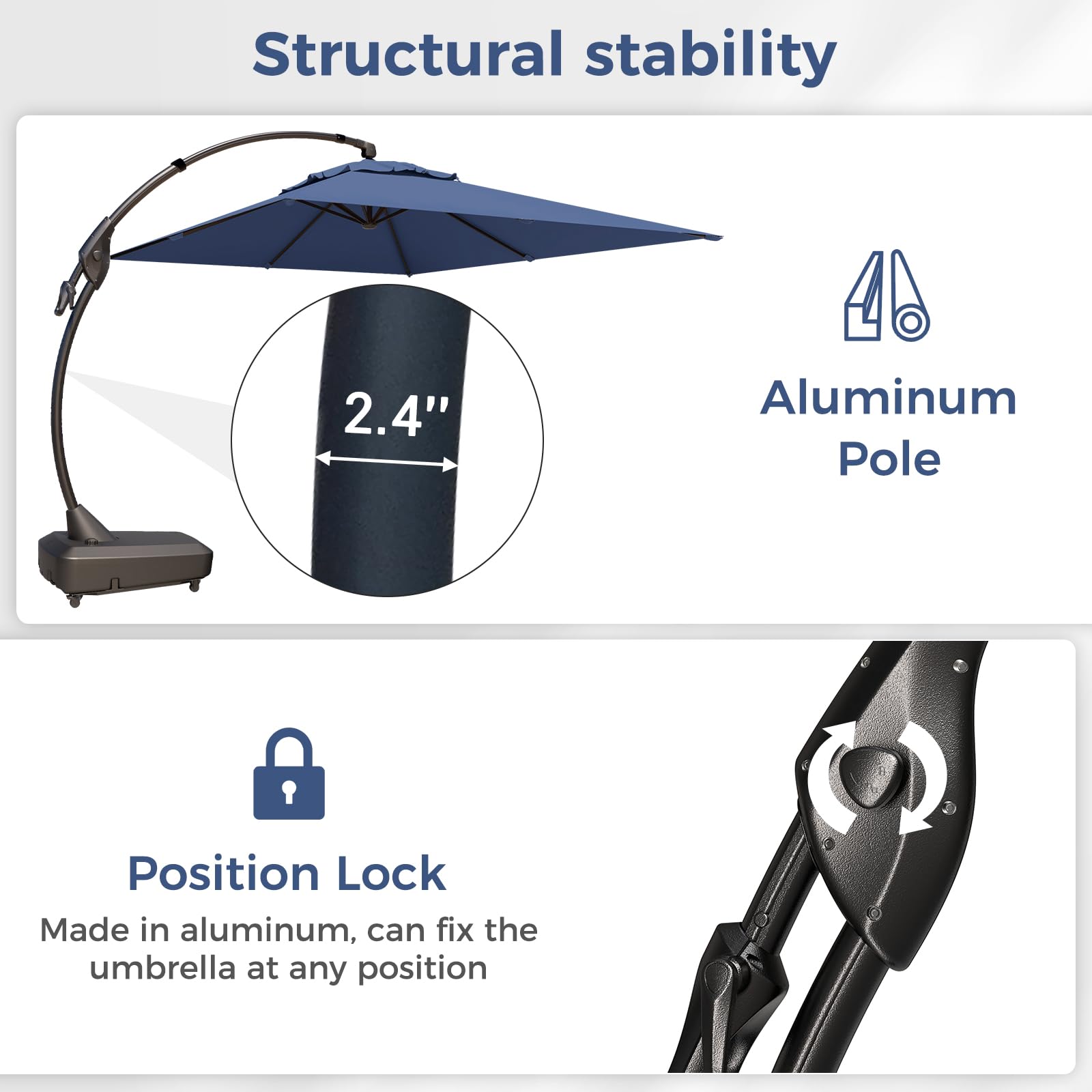 UNCOMPROMISING DURABILITY: This large offset umbrella features a heavy-duty curved aluminum frame with a powder-coated finish for elegance and corrosion resistance. The 250G polyester canopy offers UPF50+ sun protection and water resistance