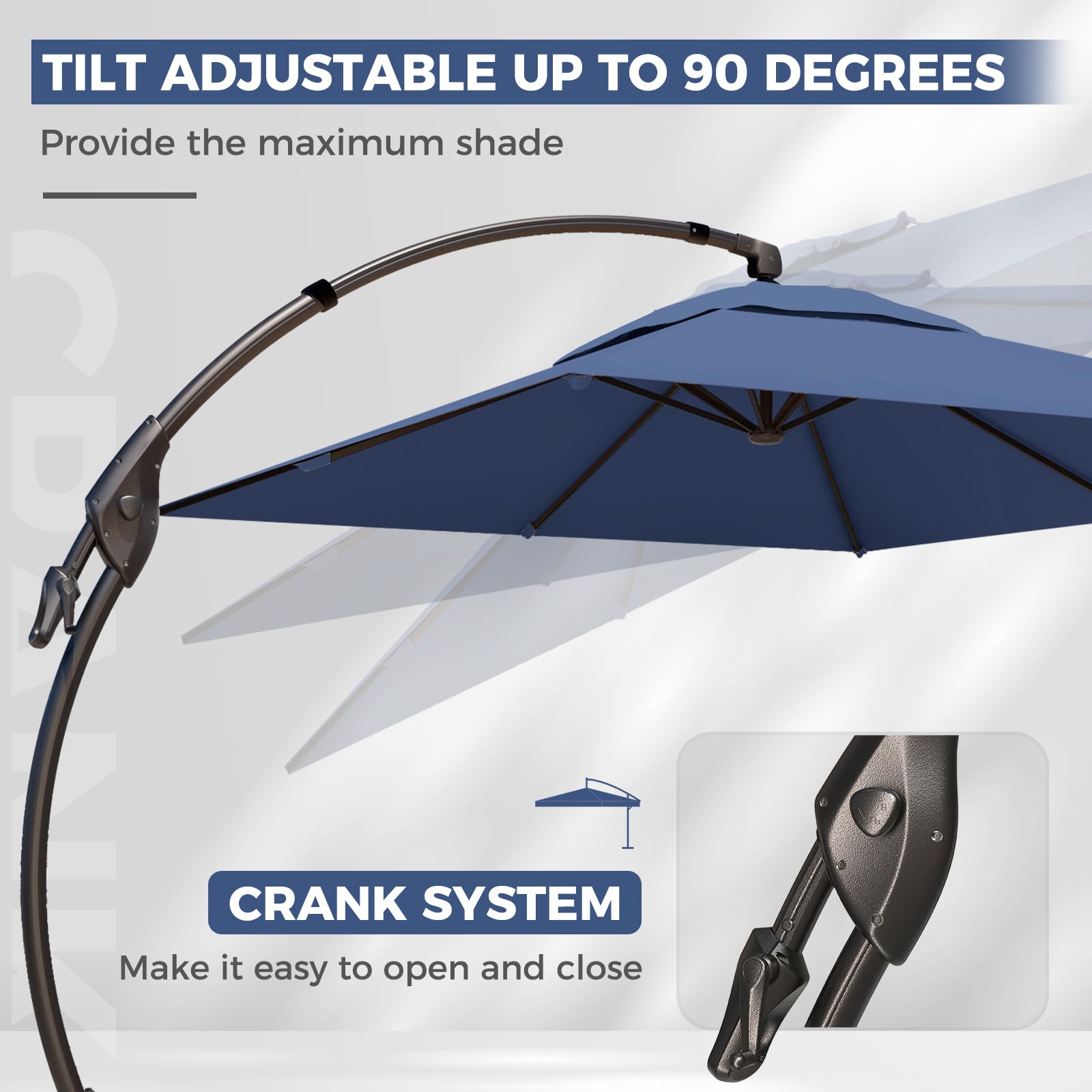 TILT ADJUSTMENT SYSTEM: Easily adjust and secure the umbrella's angle with the user-friendly tilt mechanism, and use the crank design for smooth opening and closing. For safety, close the pool umbrella into the deadlock position when not in use