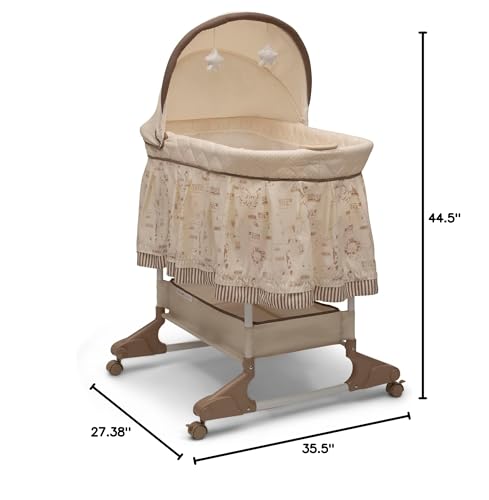 Product Description The adorable Playtime Jungle rocking bassinet is perfect for keeping your little one close to you during the early months. Features a lovable jungle-inspired design theme with soft neutral colors and several features that make this a must-have item for anyone with a new baby. The bassinet features retractable/locking swivel wheels making it easy to move from room to room. A large mesh storage basket provides ample space to store items conveniently. A variable speed vibration unit featuring sounds, music and a night light help soothe your little one to sleep. Bassinet comes with a 1-inch thick mattress pad and matching fitted sheet. This bassinet is recommended for babies 0-5 months. Stop use at 5 months or once your infant begins to push up on their hands and knees, whichever comes first. Delta Children was founded around the idea of making safe, high-quality children's furniture affordable for all families. They know there's nothing more important than safety when it comes to your child's space. That's why all Delta Children products are built with long-lasting materials to ensure they stand up to years of jumping and playing. Plus, they are rigorously tested to meet or exceed all industry safety standards. From the Manufacturer The adorable Playtime Jungle rocking bassinet is perfect for keeping your little one close to you during the early months. Features a lovable jungle inspired design theme with soft neutral colors and several features that make this a must have item for anyone with a new baby. The bassinet features retractable/locking swivel castors making it easy to move from room to room. A large mesh storage basket provides ample space to store items conveniently. A variable speed vibration unit featuring sounds, music and a night light help soothe your little one to sleep. Bassinet comes with a one inch thick mattress pad and one matching sheet. Some assembly required. Meets or exceeds JPMA standards for Bassinets.