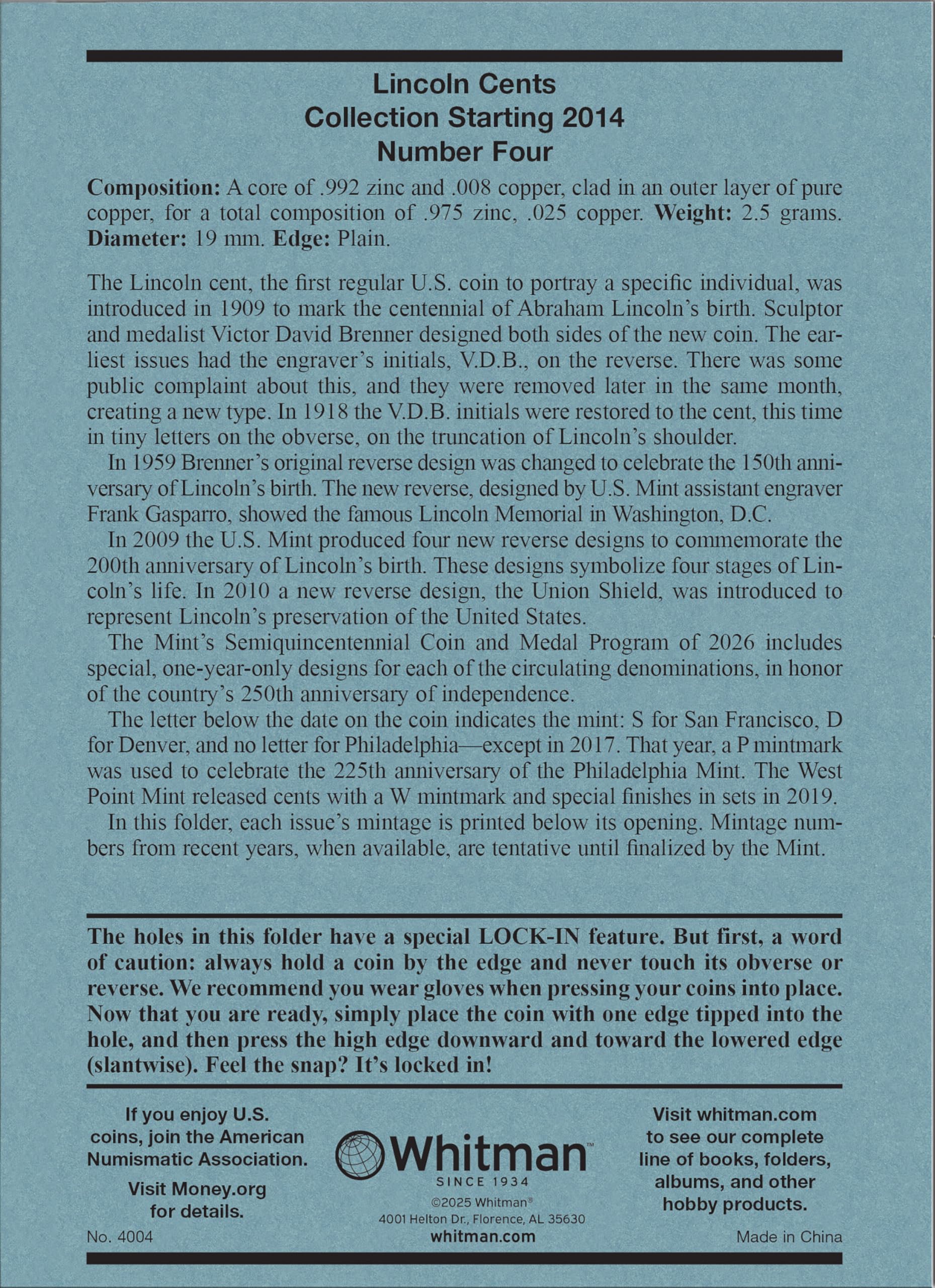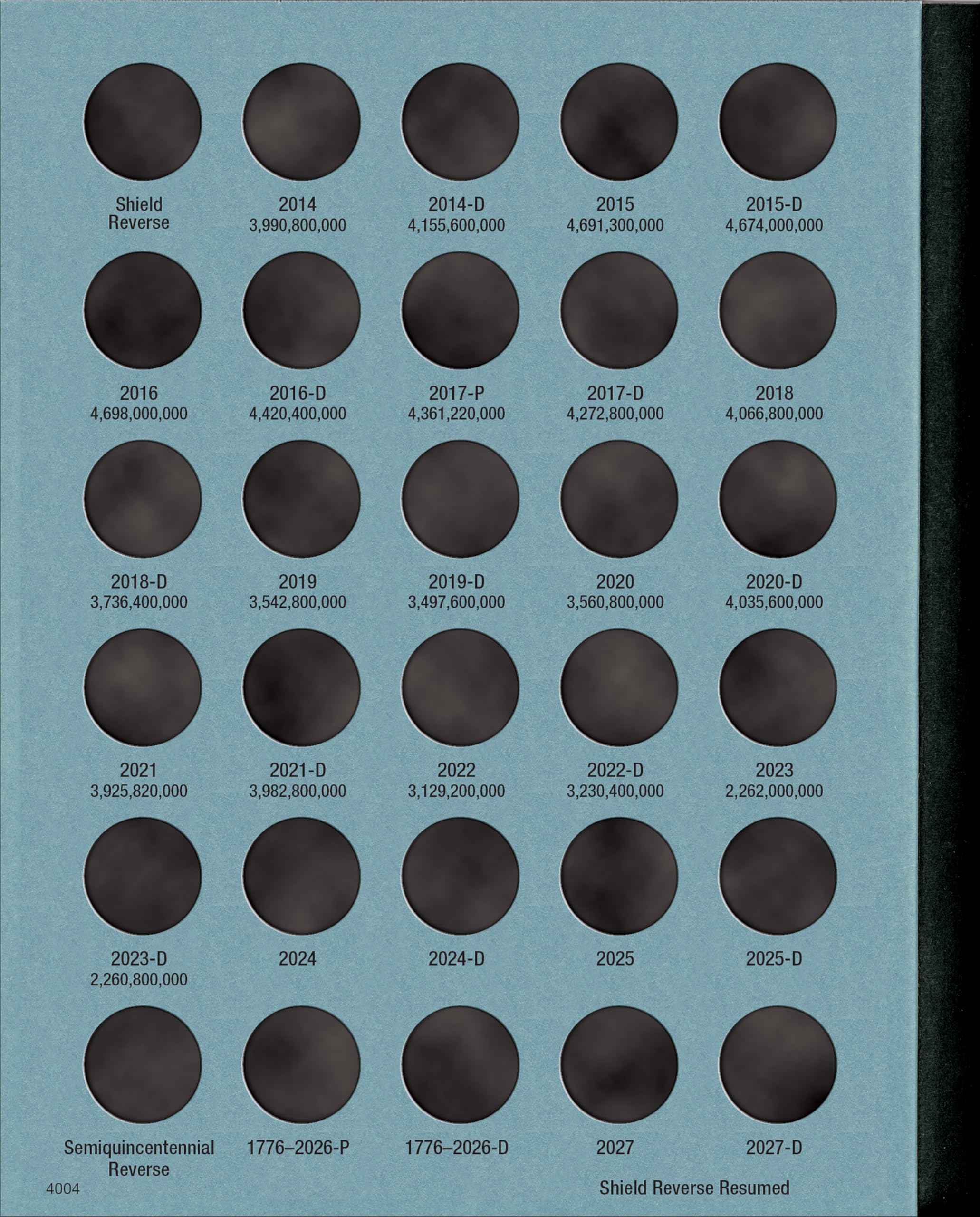 Official Whitman® coin folders offer a timeless and dependable way to store, protect, and display your coin collection for years to come. Ideal for both beginners and seasoned collectors, these durable trifold folders feature Whitman’s signature grained vinyl cover in classic blue. With labeled openings for easy organization and identification, each folder also includes historical background, mintage data, and series details. The trusted choice for coin collectors. This folder includes 3 pages with a total of 90 openings designed for circulation-strike coins from the Philadelphia and Denver mints from the specified years.