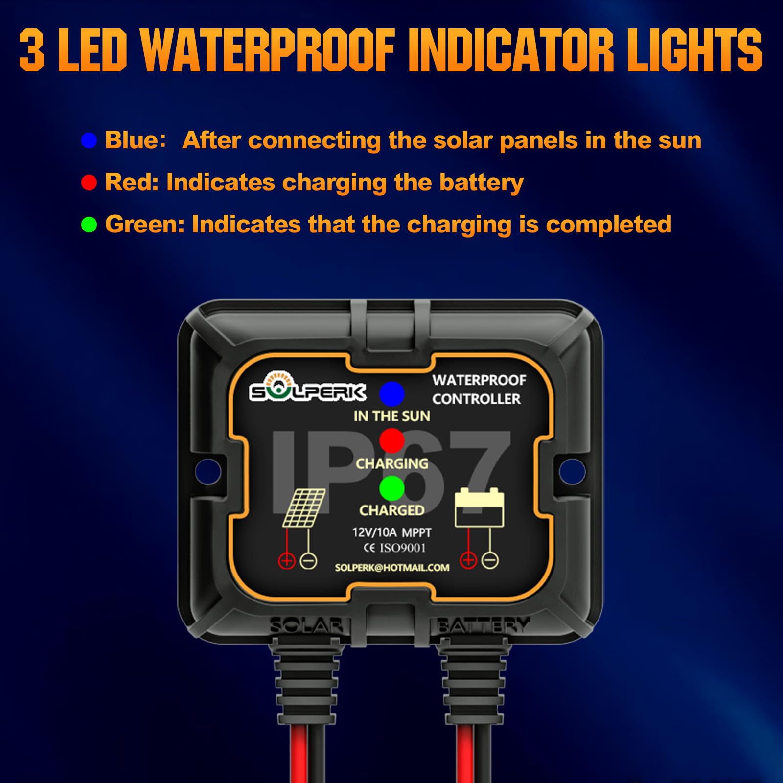 【High-Efficiency MPPT Controller】This advanced MPPT charge controller providing over 30% additional power compared to standard solar charge controllers. This fully waterproof MPPT controller can be completely submerged in water. It offers comprehensive protection for your battery, safeguarding against overcharging, deep discharging, excessive voltage, current surges, overloads, short circuits, reverse polarity, and overheating