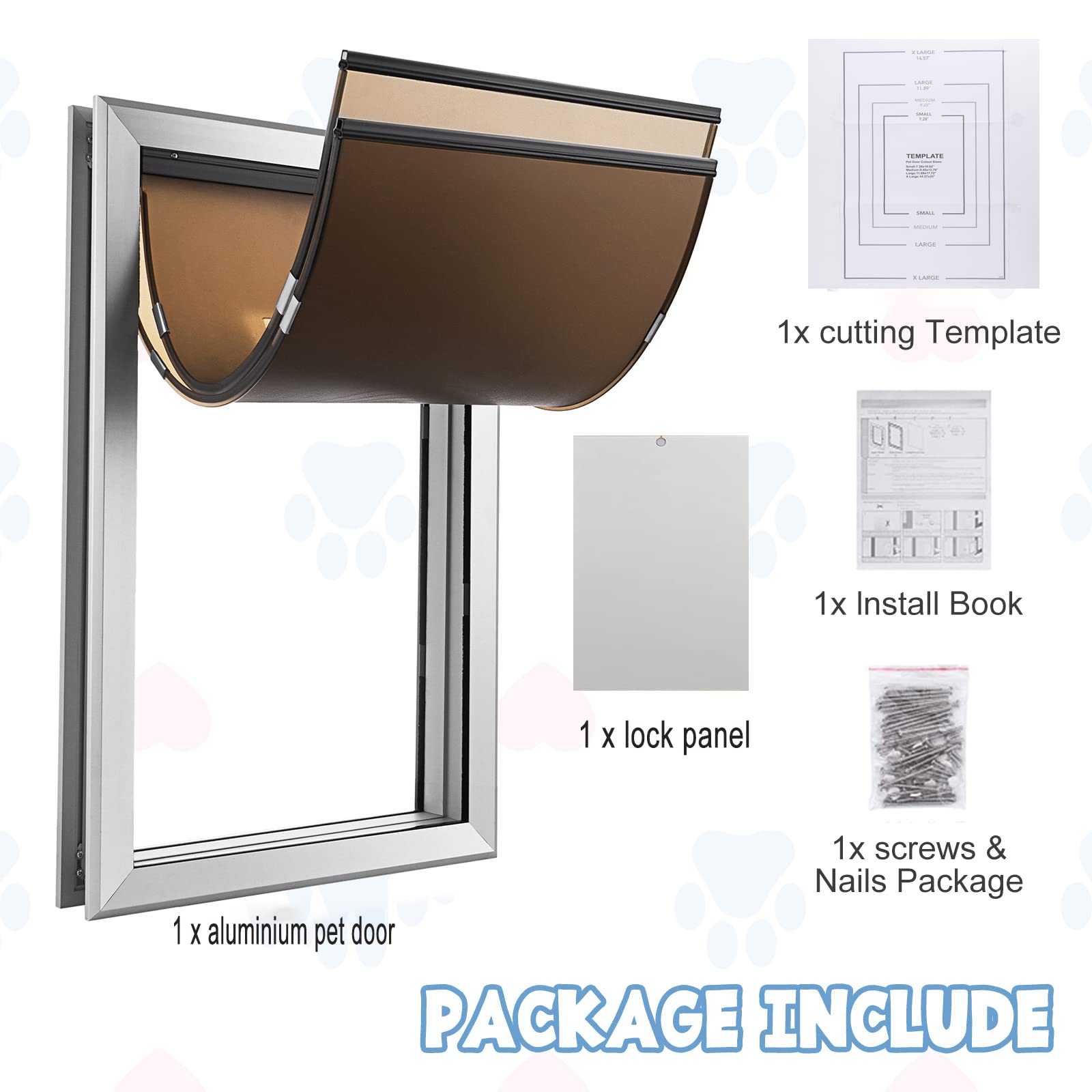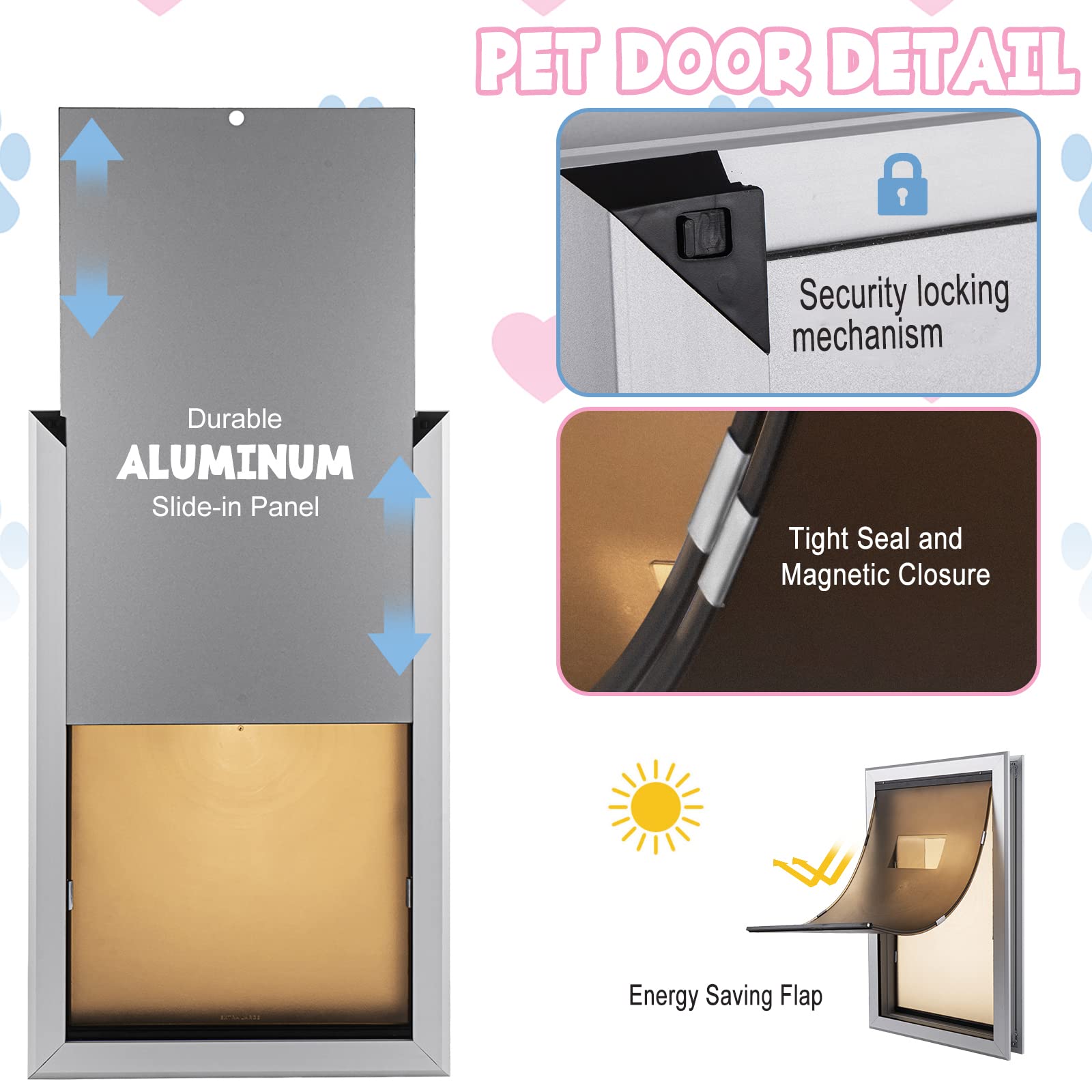 [Ingenious Details] The doggy door comes with a durable aluminum slide-in panel, security sliding lock design. These can keep you and your family safe at night or when you are not home by keeping other animals out of the house. Weatherproof magnetic closure and two UV-resistant flaps, suitable for different climates and provides energy efficiency.