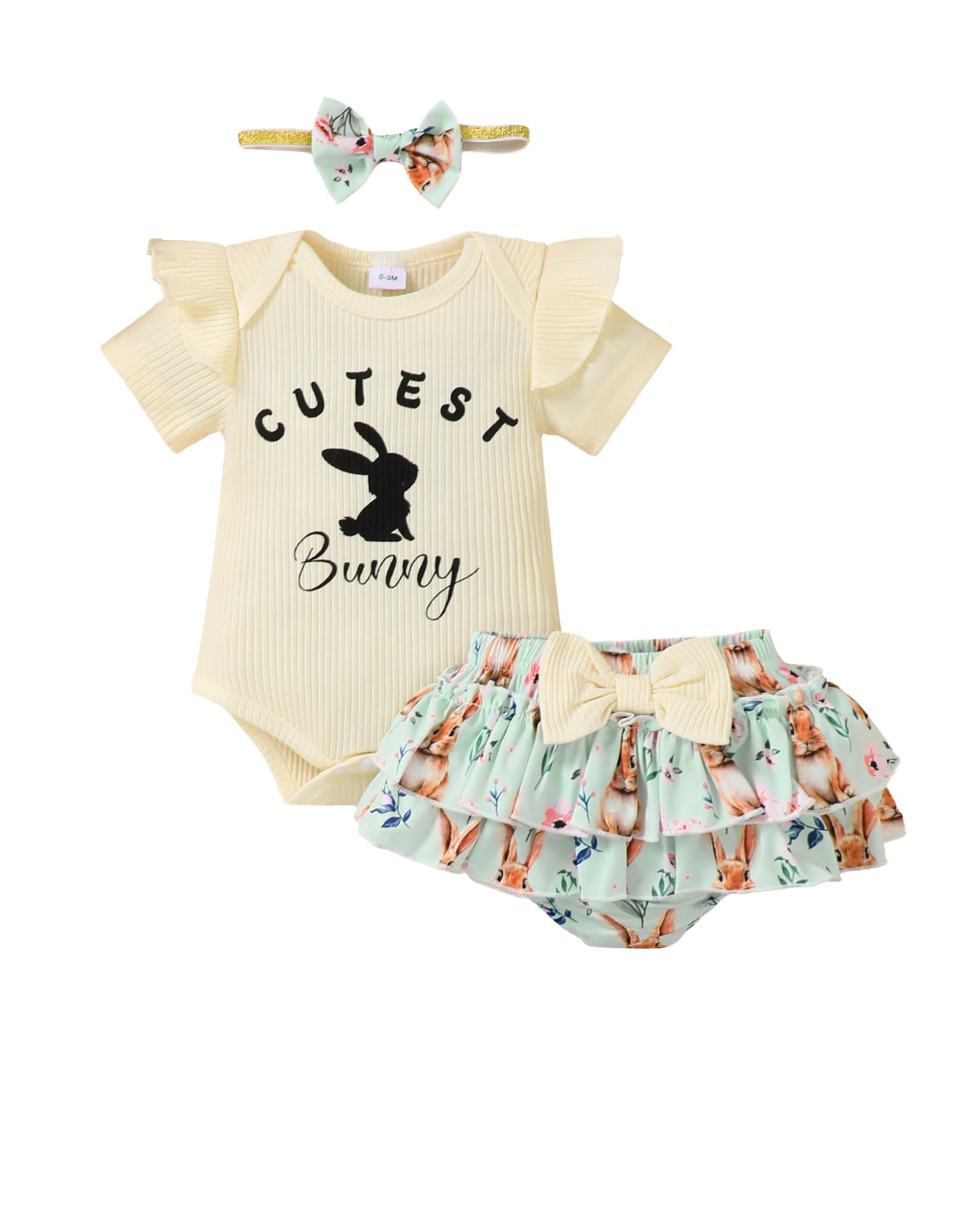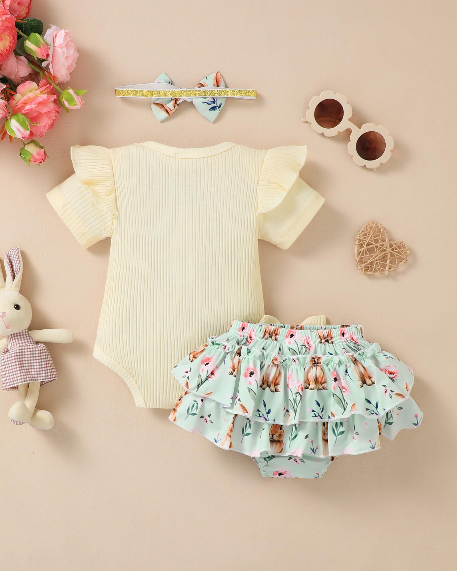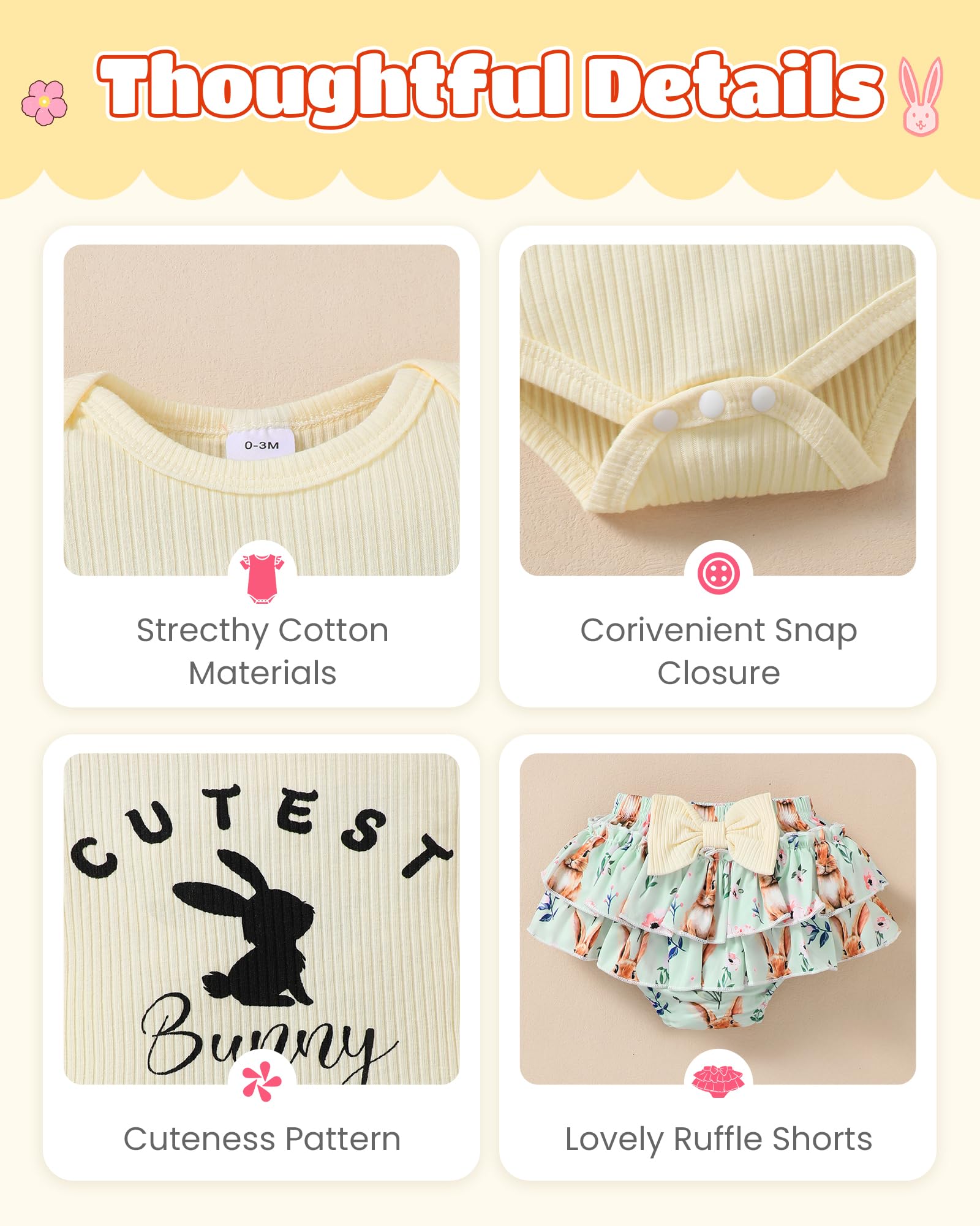 Novel Design: Lovely Easter patterns express great love from family.Super soft and stretchy materials for comfortable dressing and sporting.Pure romper, ruffle princess shorts and matching headband create more appealing impression.Convenient Snap closure for easy diaper changes.