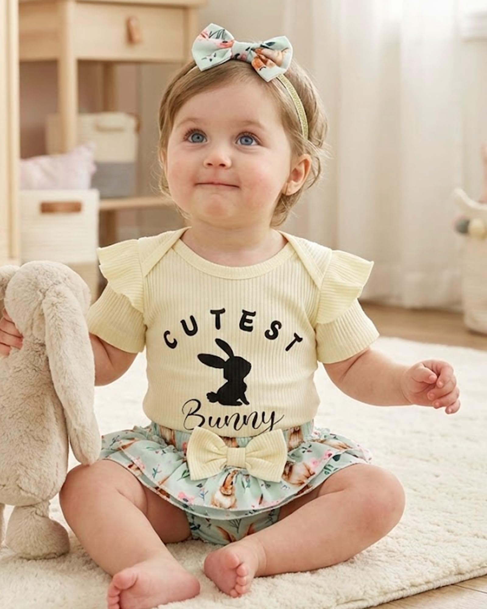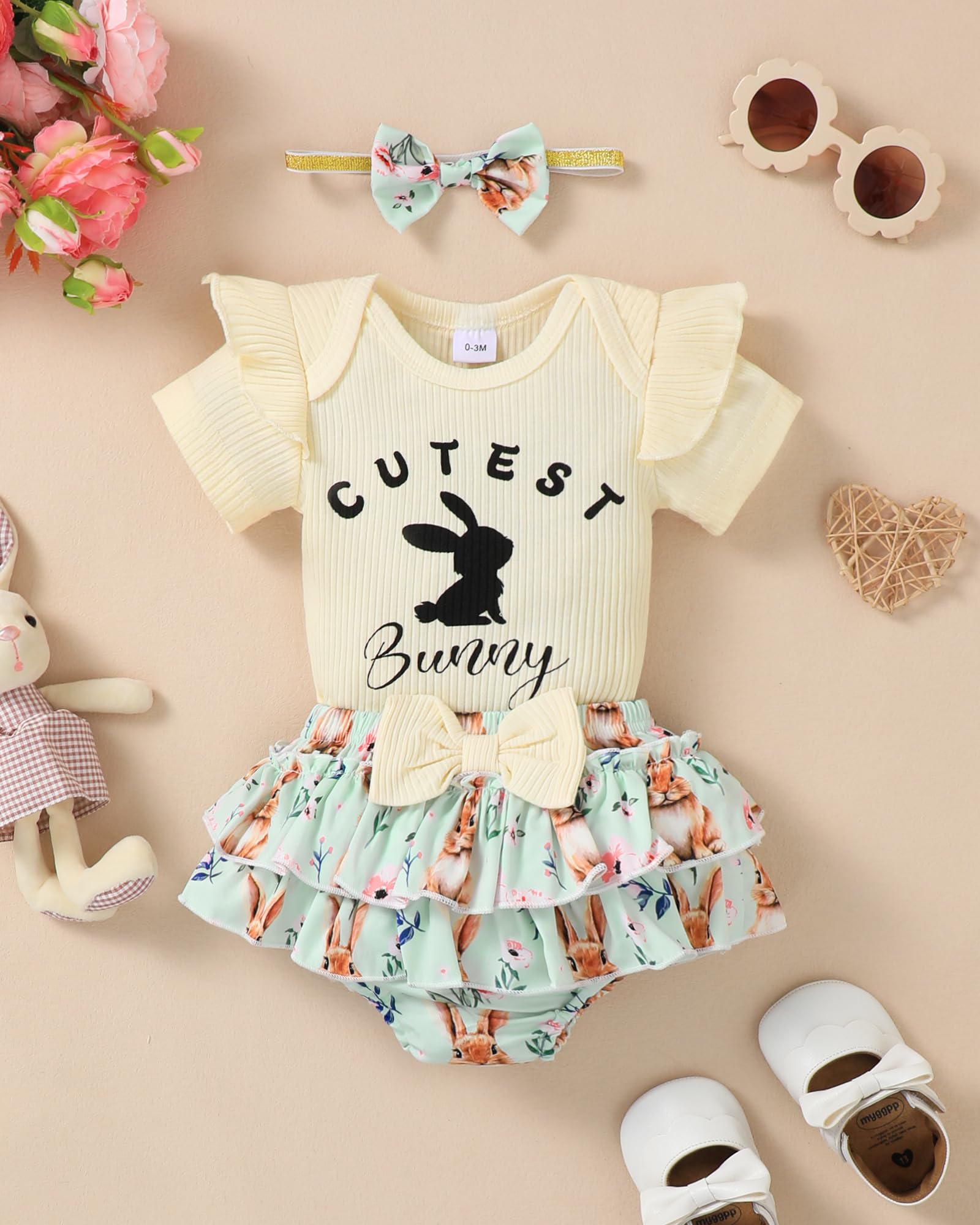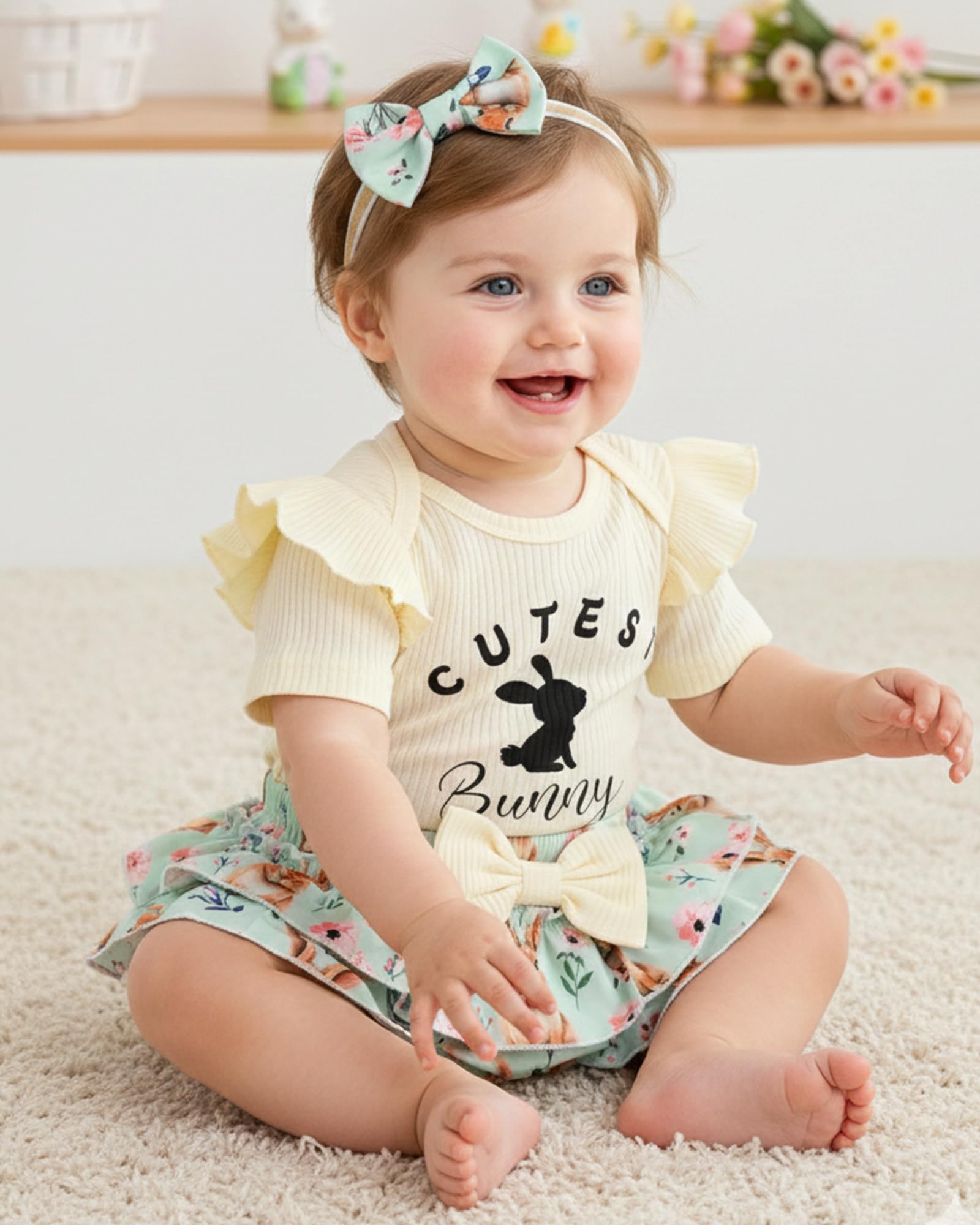 Novel Design: Lovely Easter patterns express great love from family.Super soft and stretchy materials for comfortable dressing and sporting.Pure romper, ruffle princess shorts and matching headband create more appealing impression.Convenient Snap closure for easy diaper changes.