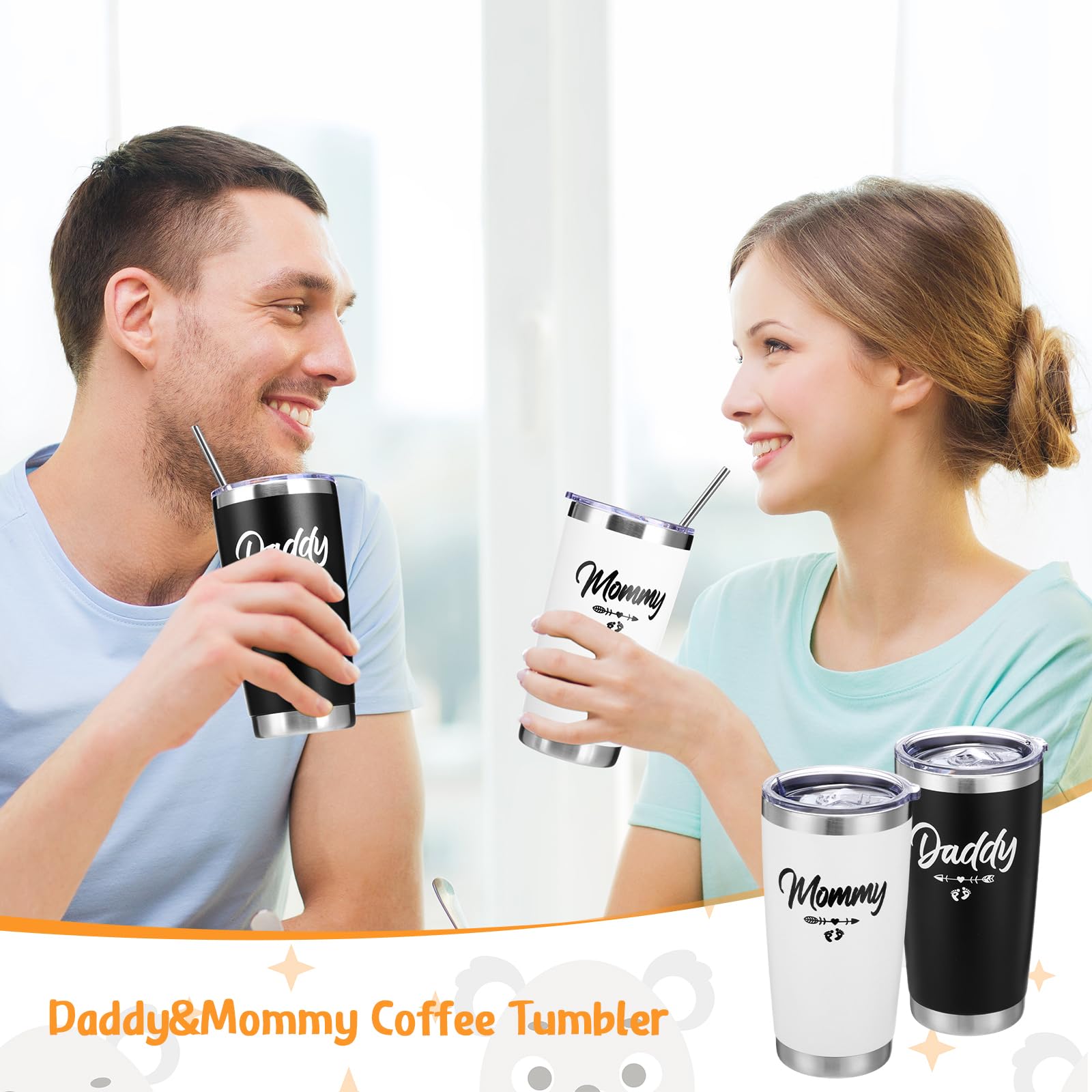 Double Vacuum Insulation Tumbler: the 20 oz baby shower insulated tumbler is made of quality 304 stainless steel; The vacuum double wall wine glass can maintain the temperature very well, 'Daddy' and 'Mommy' sayings on the tumblers will be a cute gift set for expecting parents, which will let new mom and dad spend the wonderful four seasons