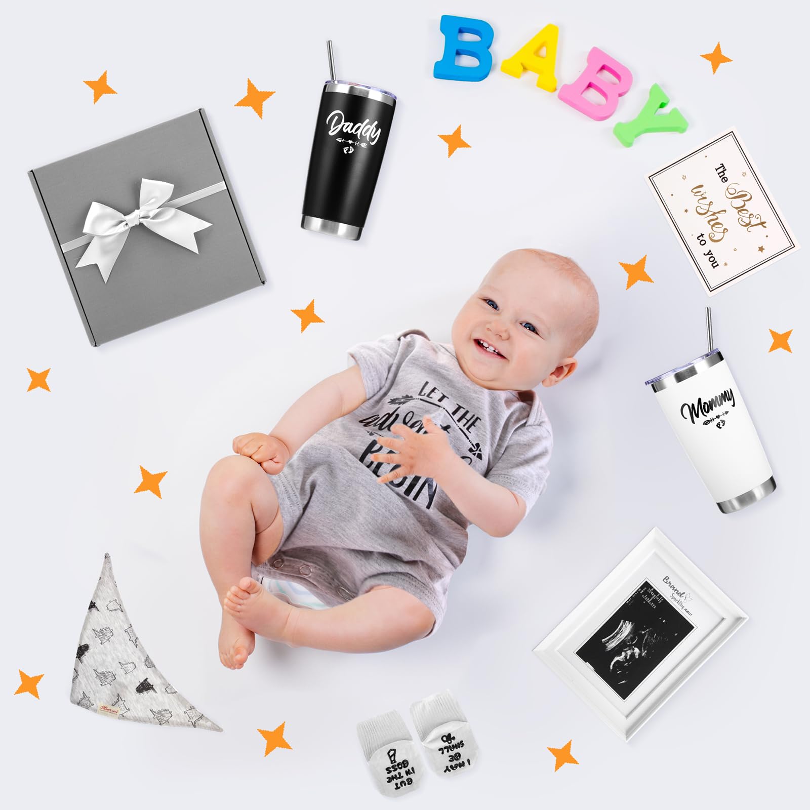 Welcome Gift for Baby: baby gifts basket includes a set of mom and dad wine tumblers (includes 2 brushes and 2 straws), a decision making coin, a unisex jumpsuit (0-3 month), a pair of creative baby socks, 1 bib, a baby greeting card, a ultrasound picture frame, a bow and a cardboard gifts box; Send this baby reveal gifts for parents to a special little one to welcome them into the world